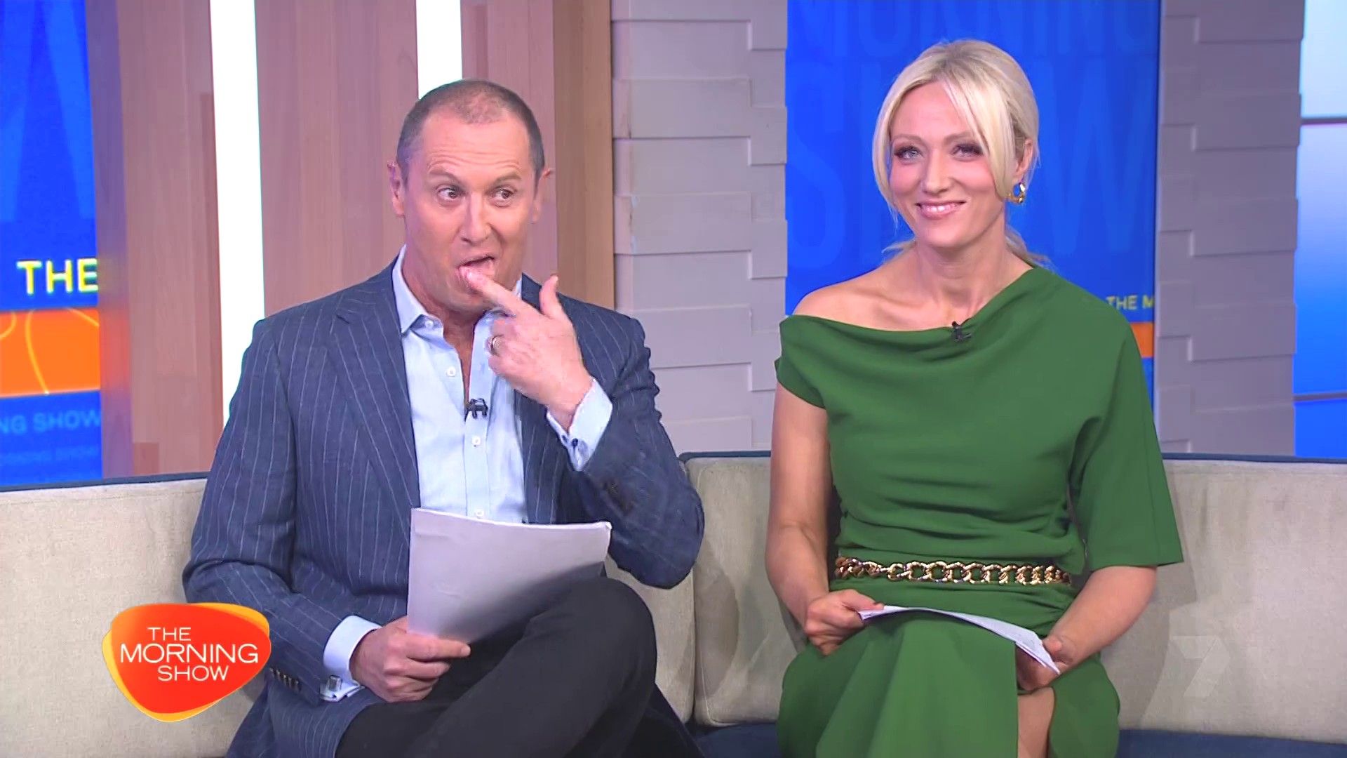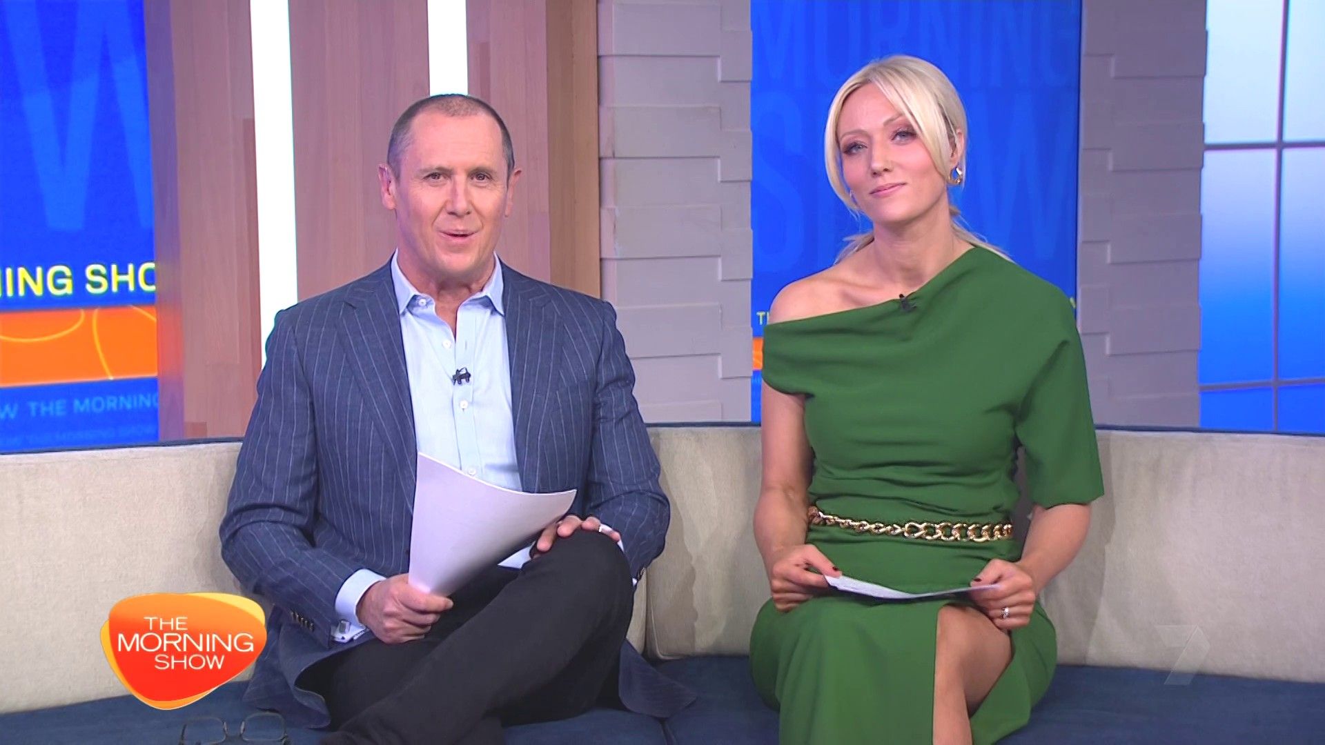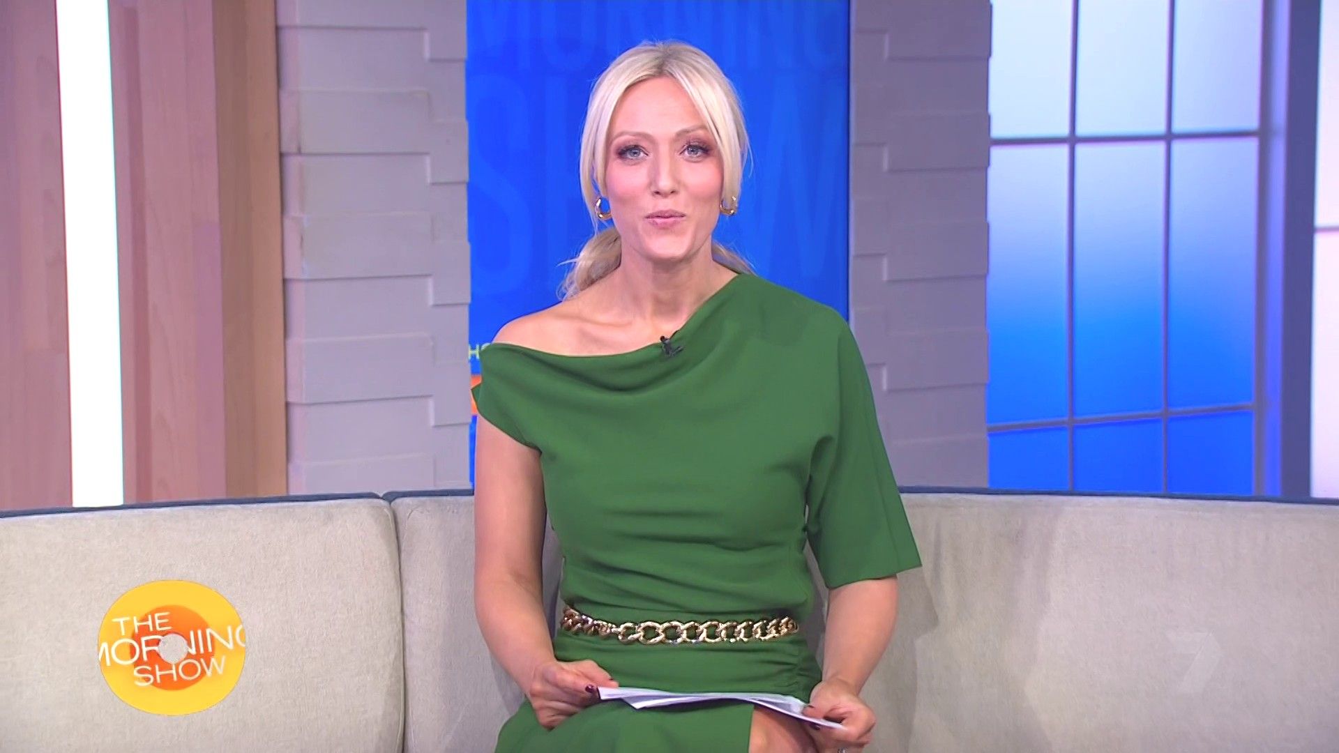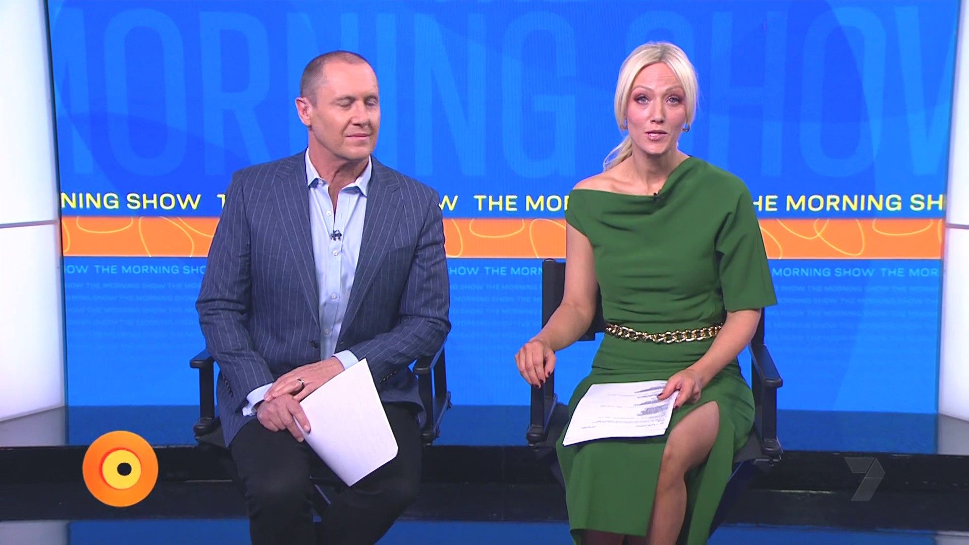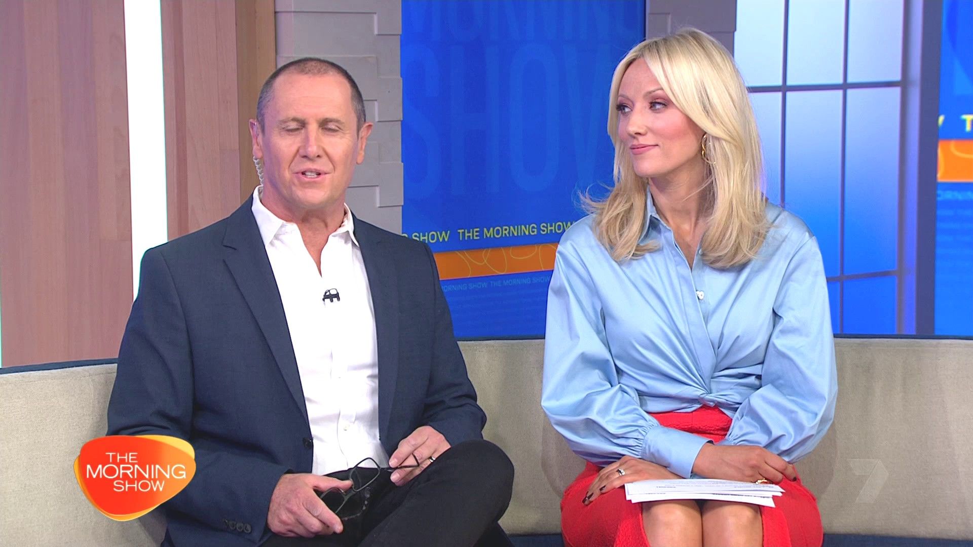 Sally hosting Morning Show in red split skirt today at about 9:35 with Gemma Acton saw her again on high chairs