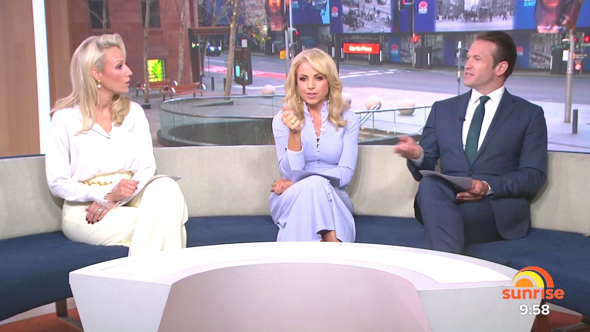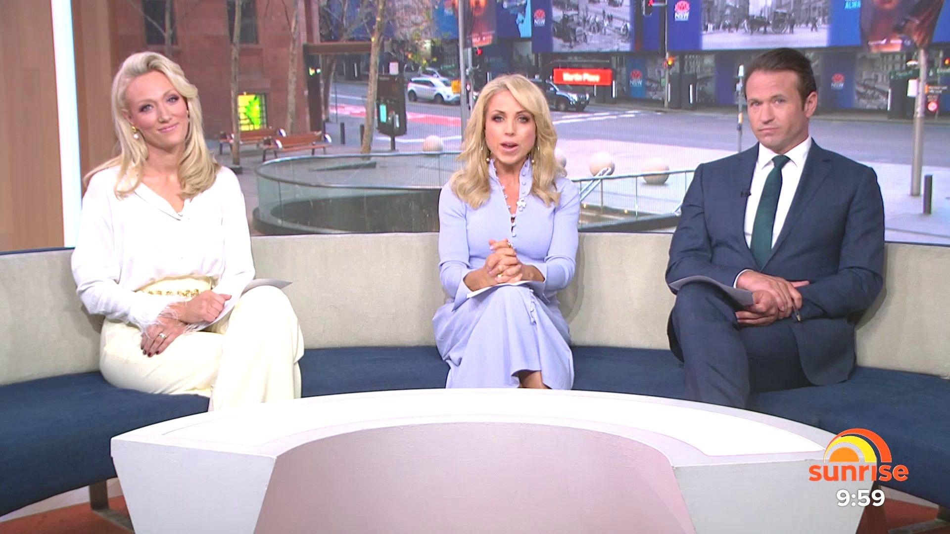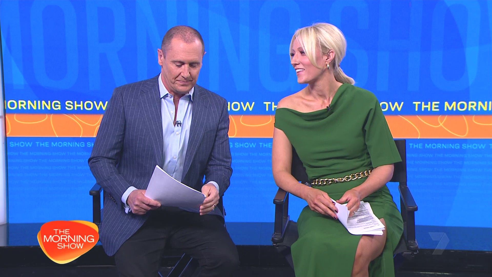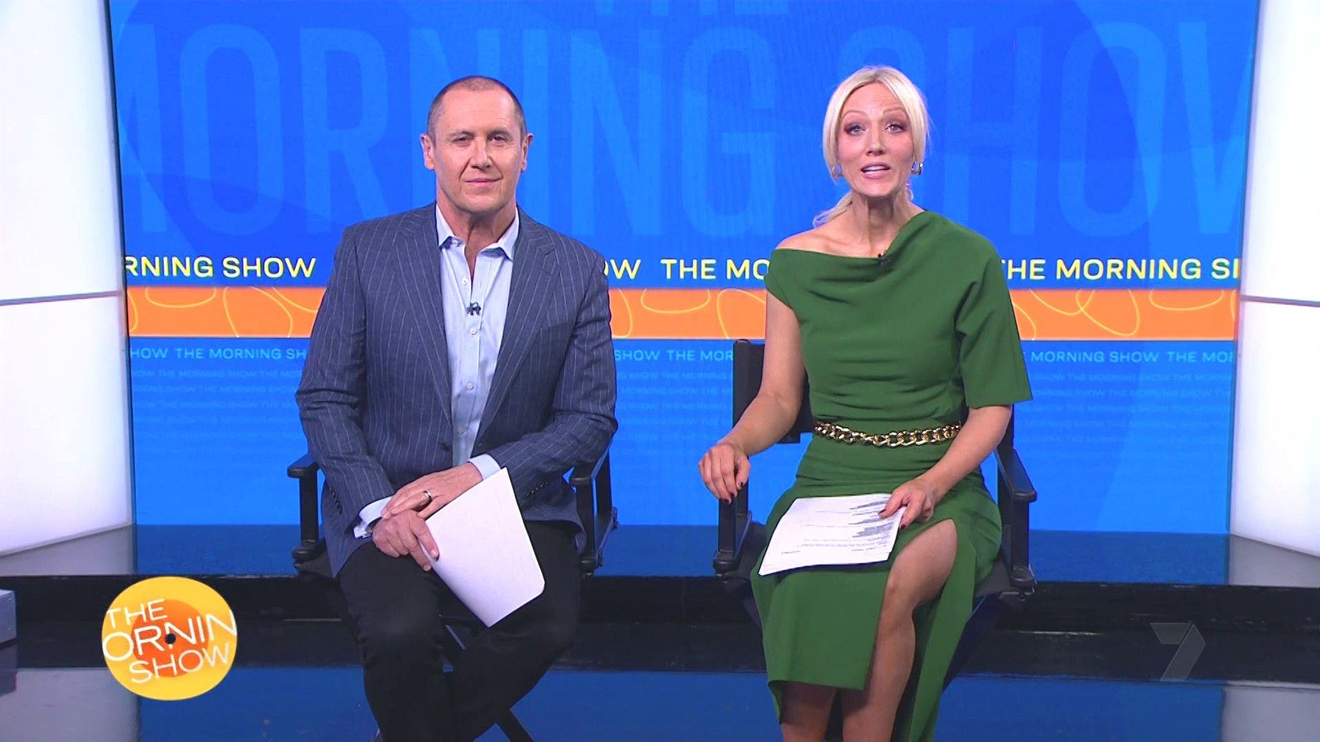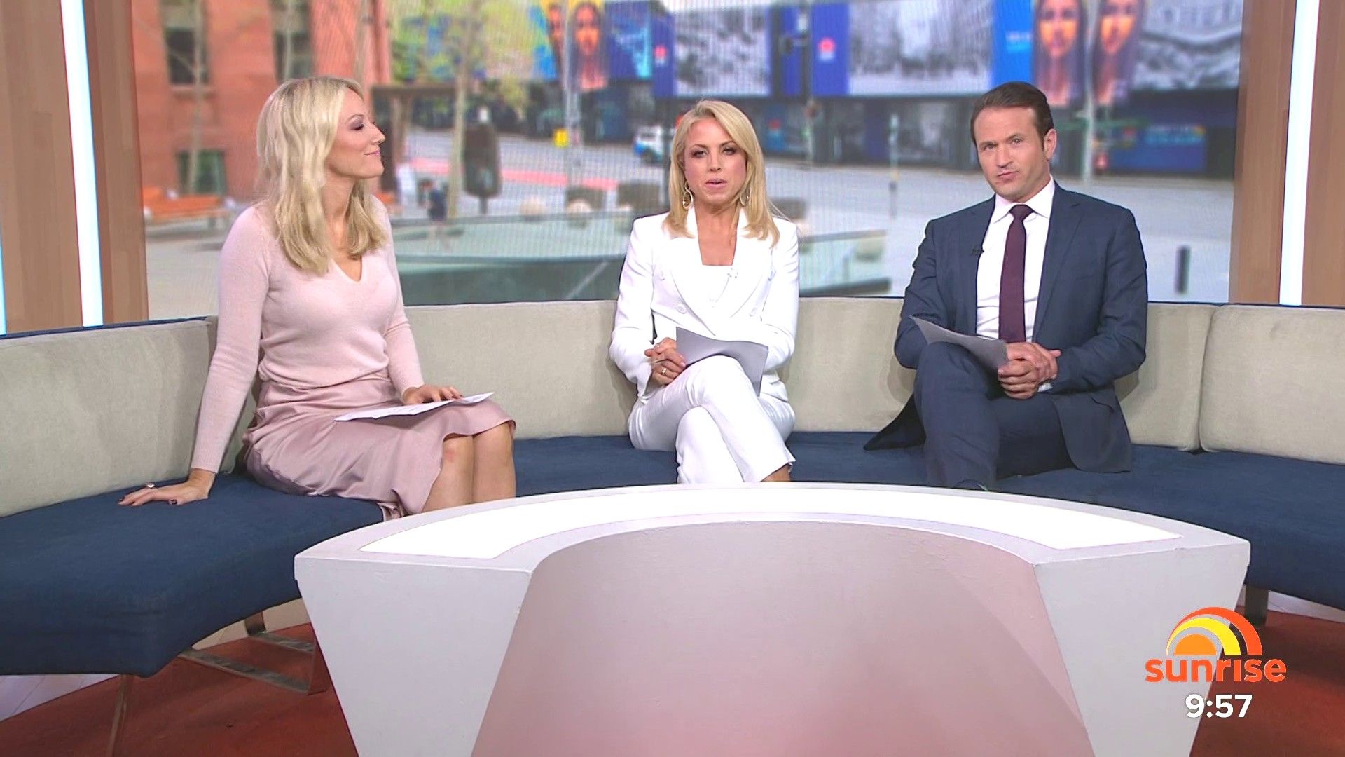 Sally hosting Morning Show in red split skirt today at about 9:35 with Gemma Acton saw her again on high chairs