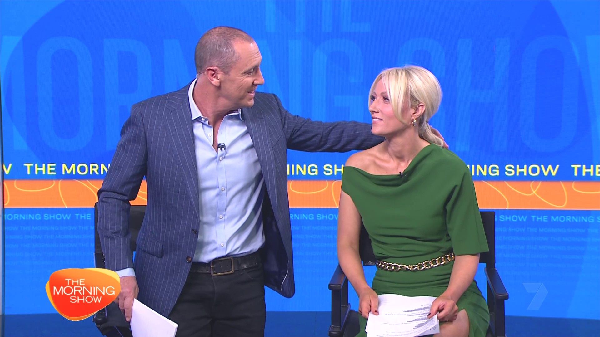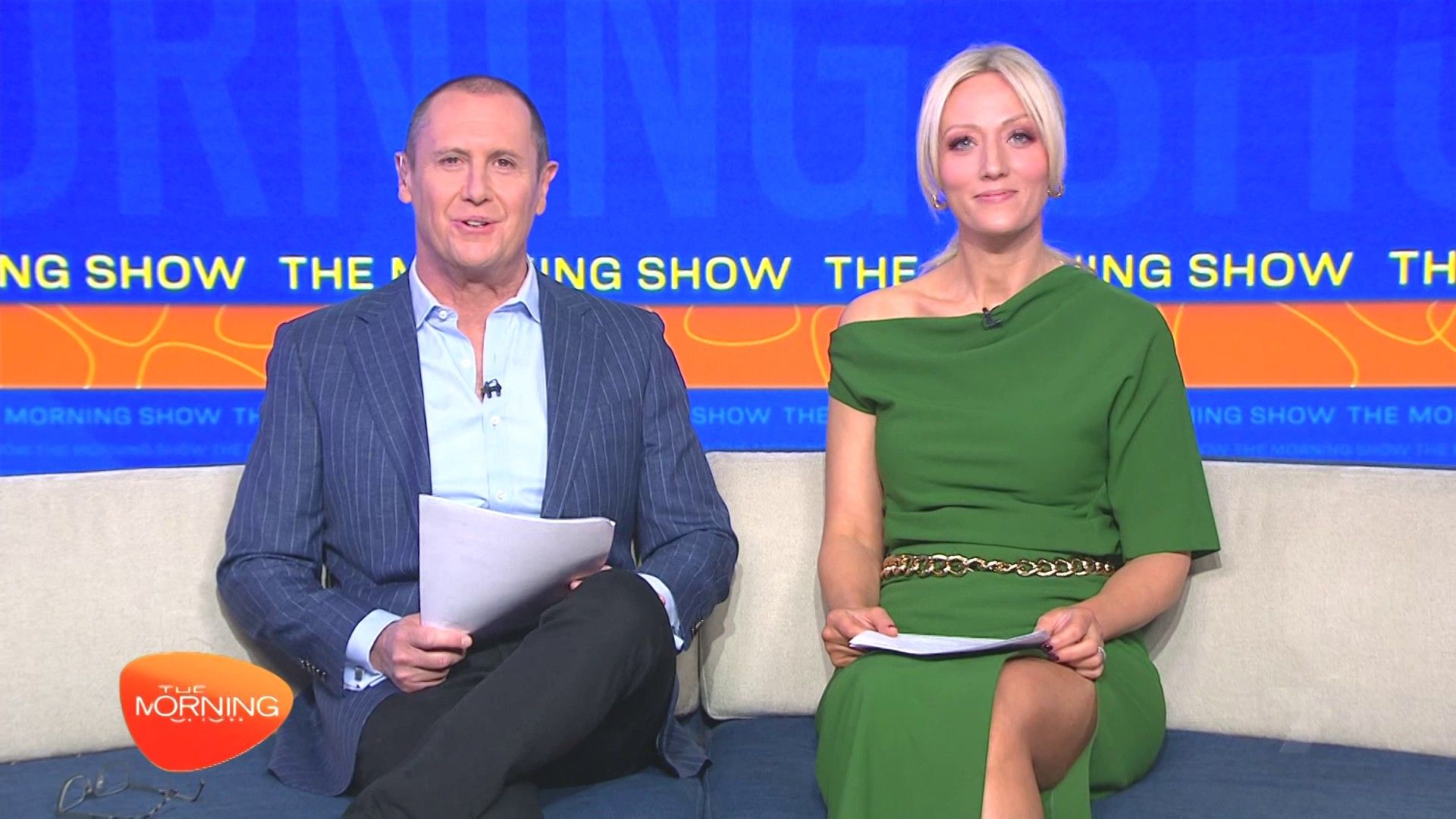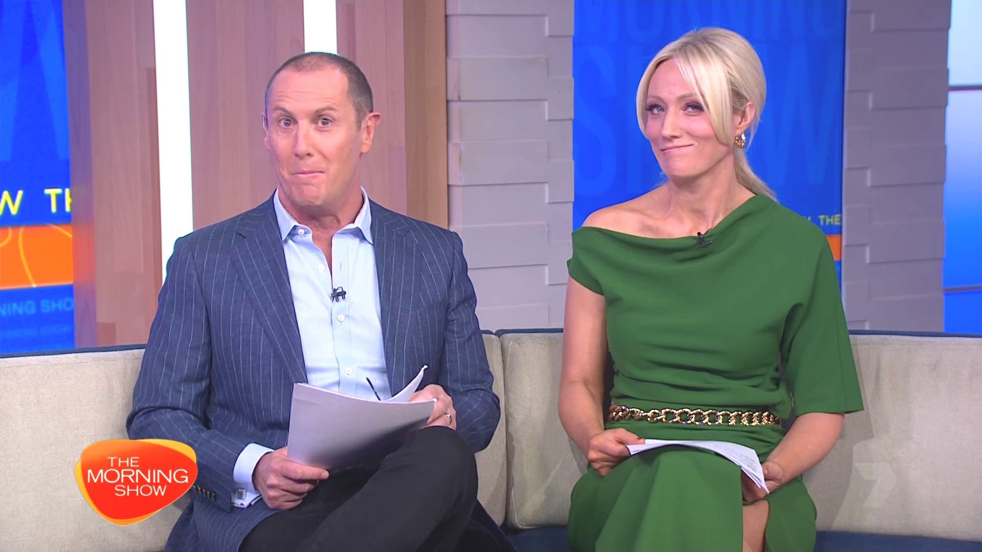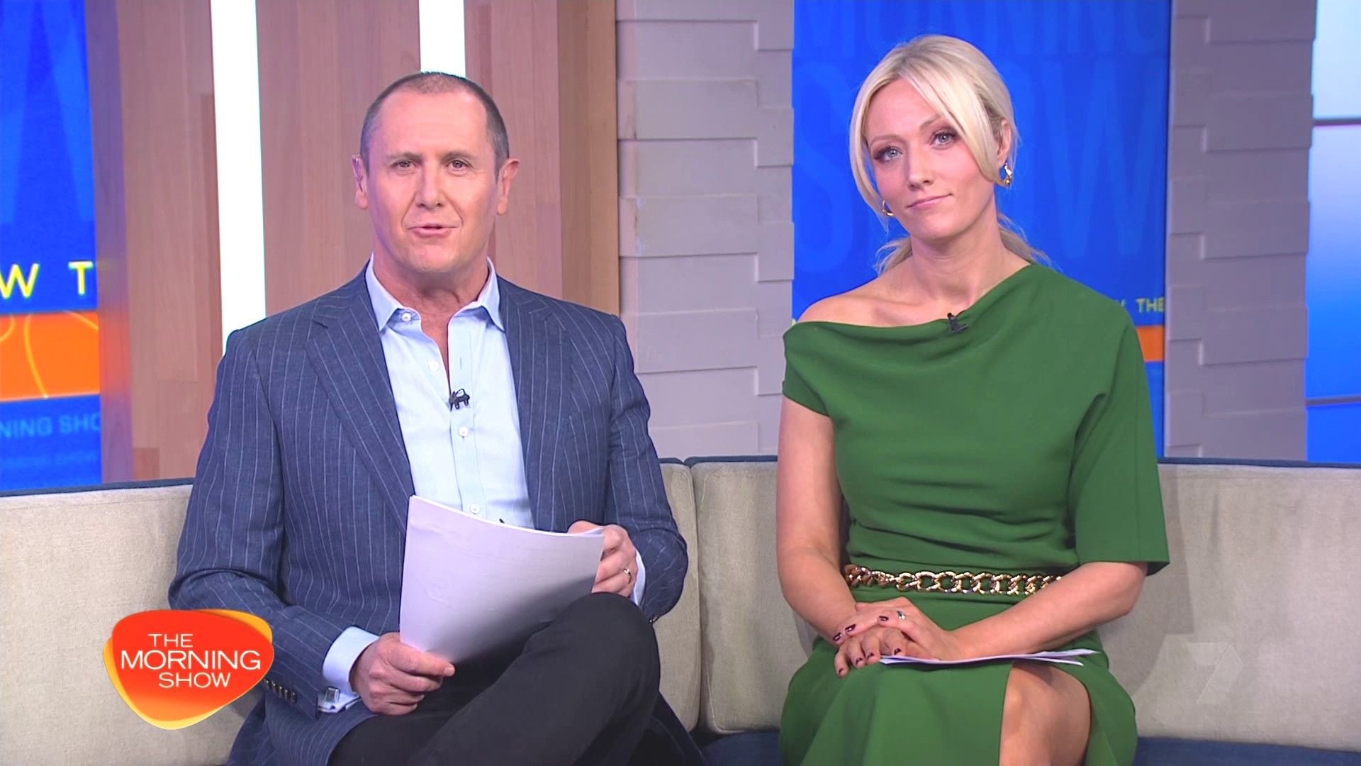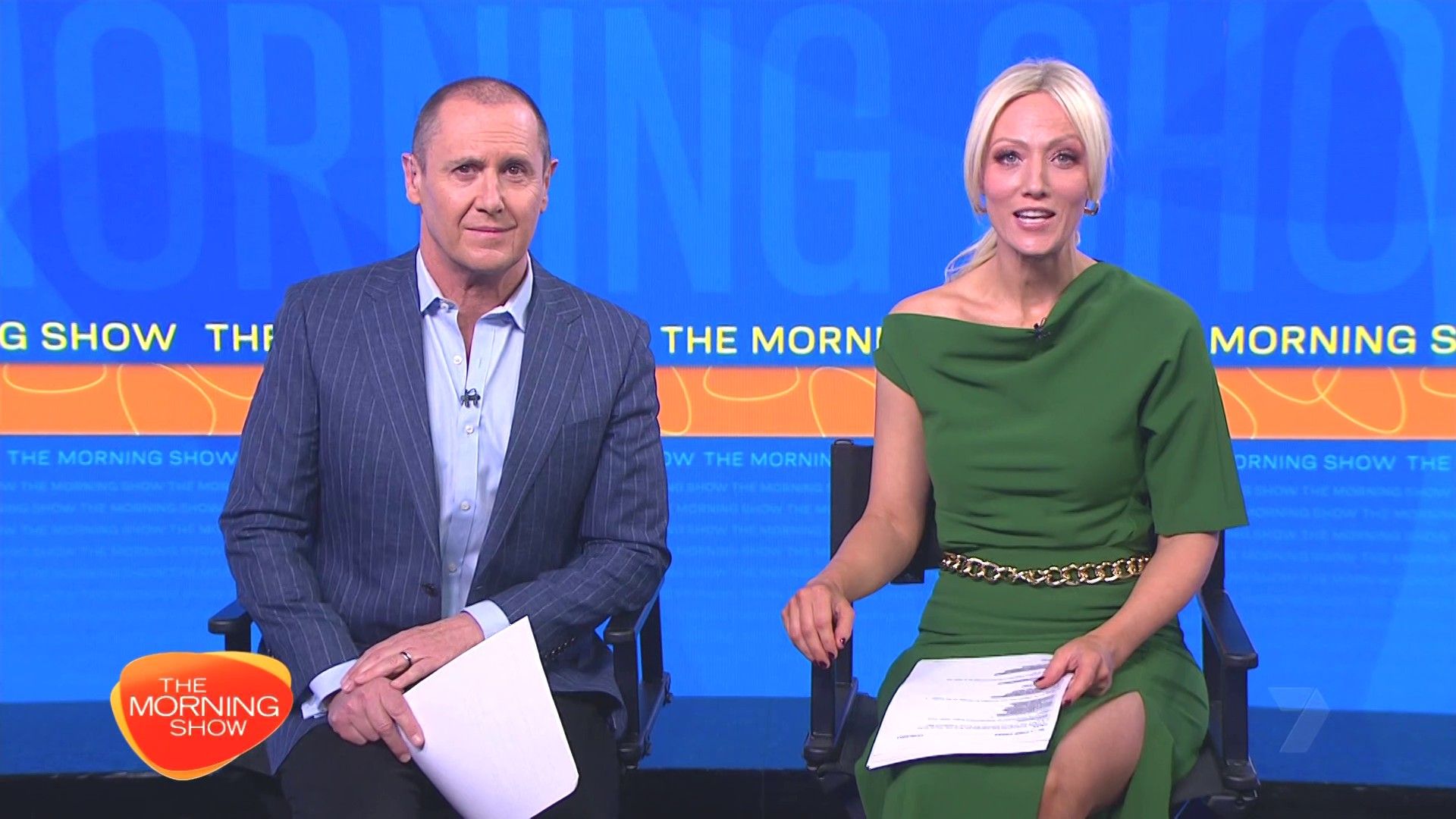 Sally hosting Morning Show in red split skirt today at about 9:35 with Gemma Acton saw her again on high chairs