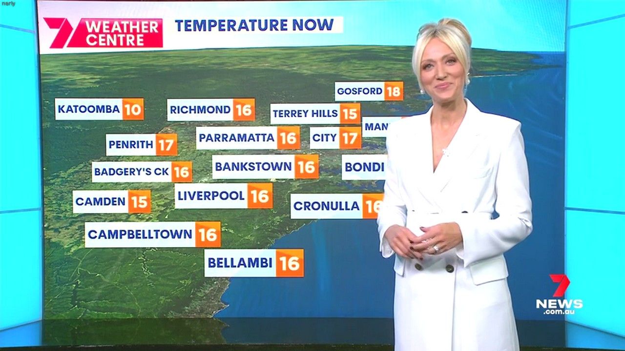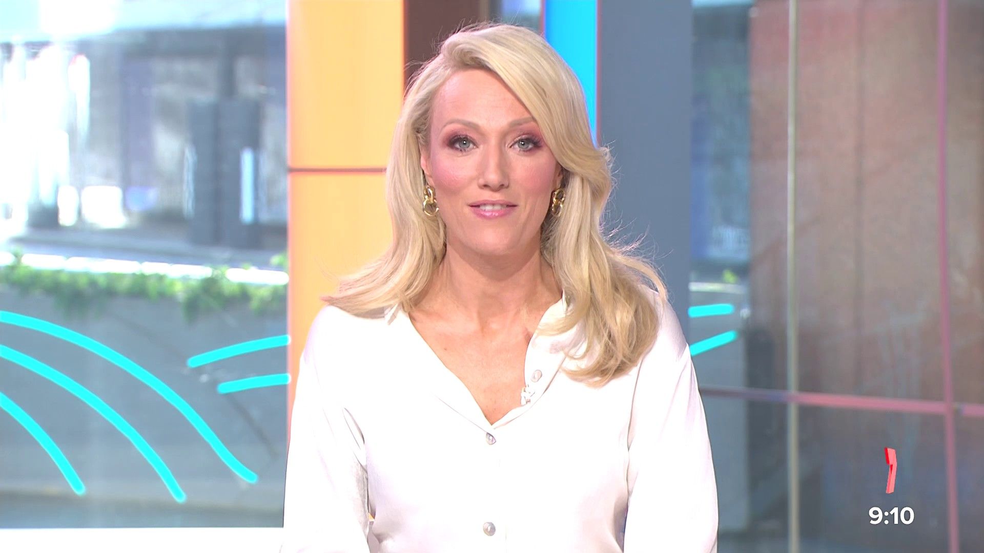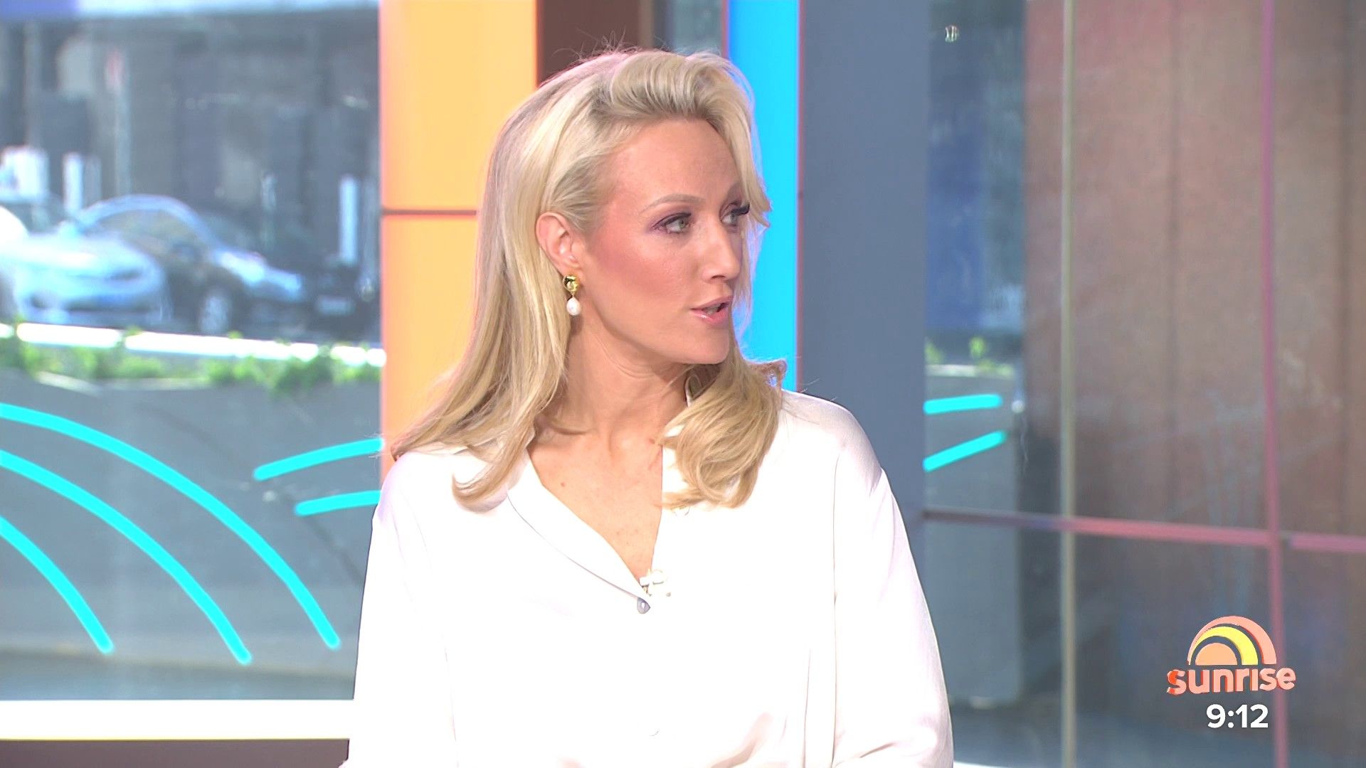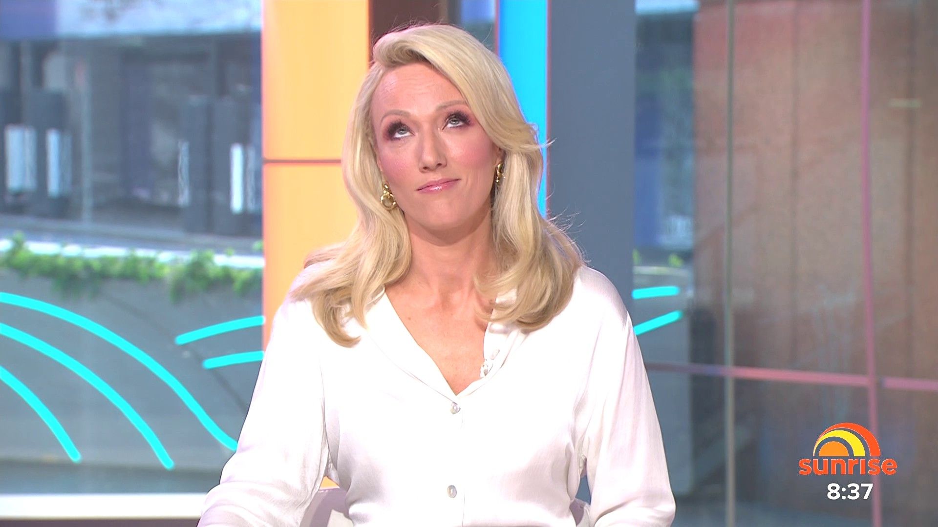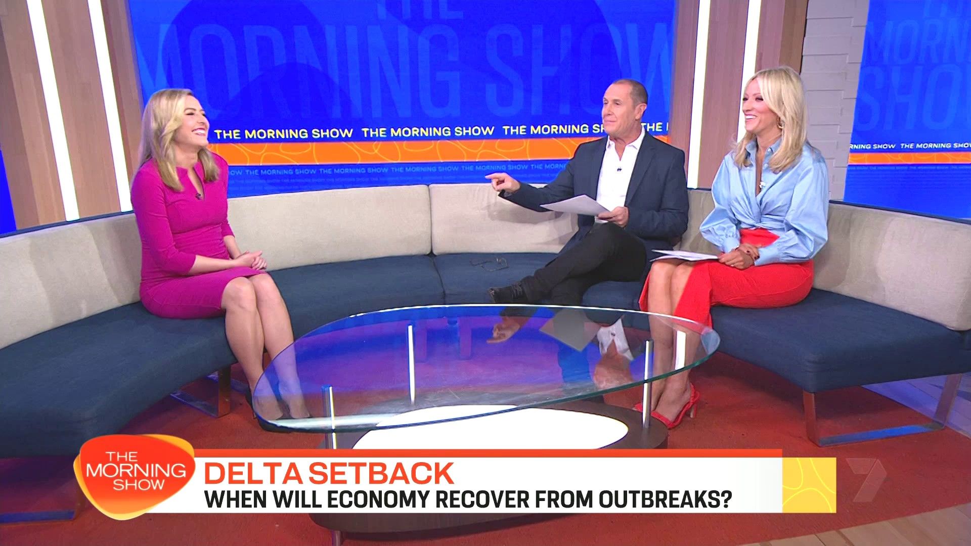 Sally hosting Morning Show in red split skirt today at about 9:35 with Gemma Acton saw her again on high chairs