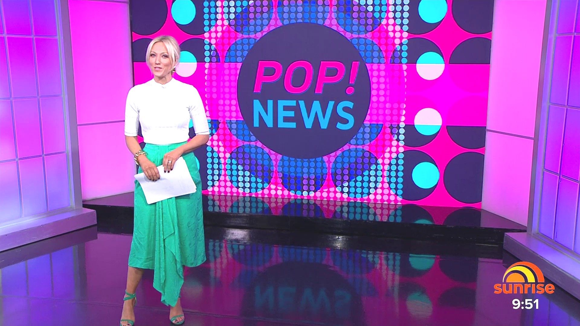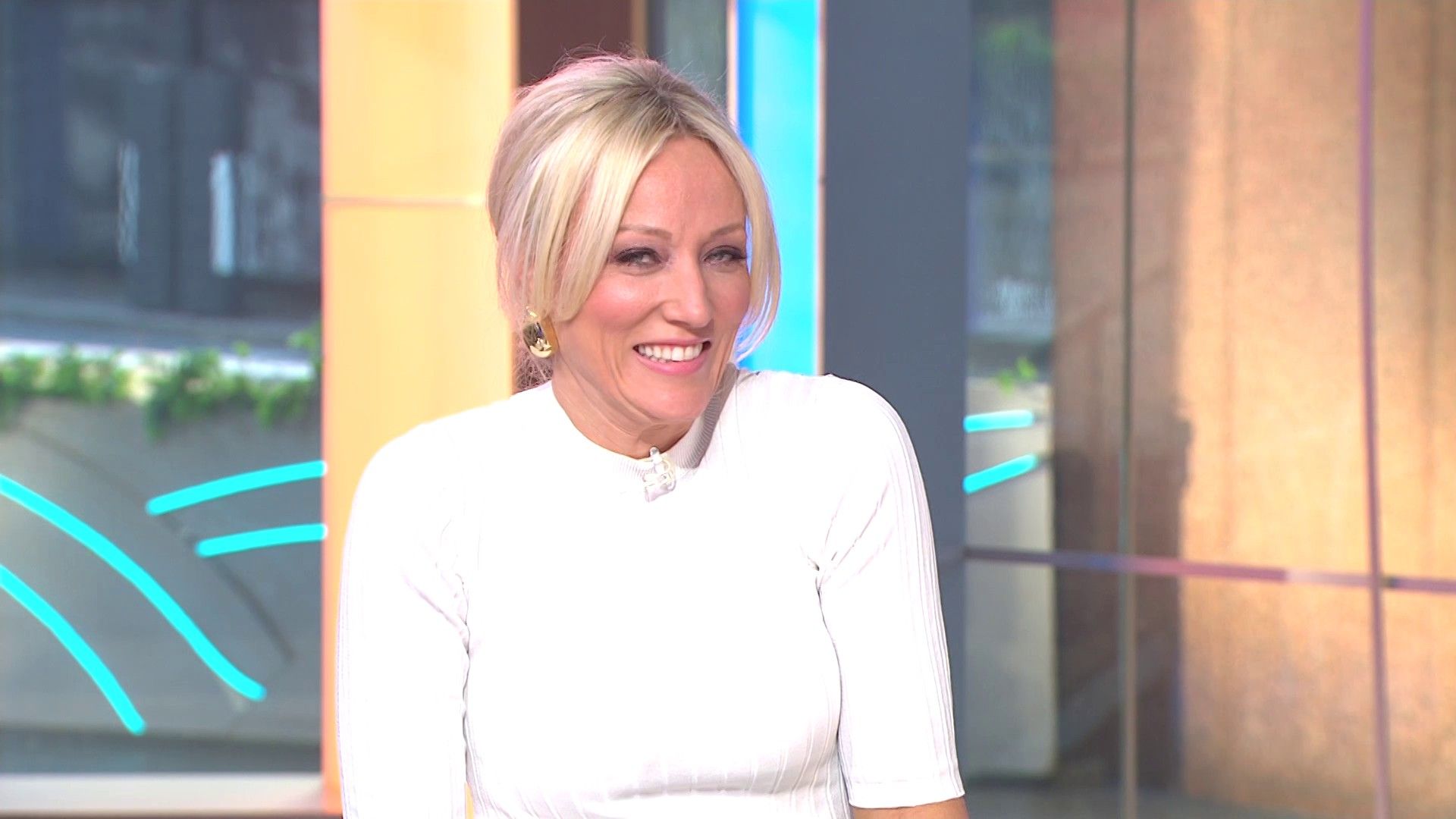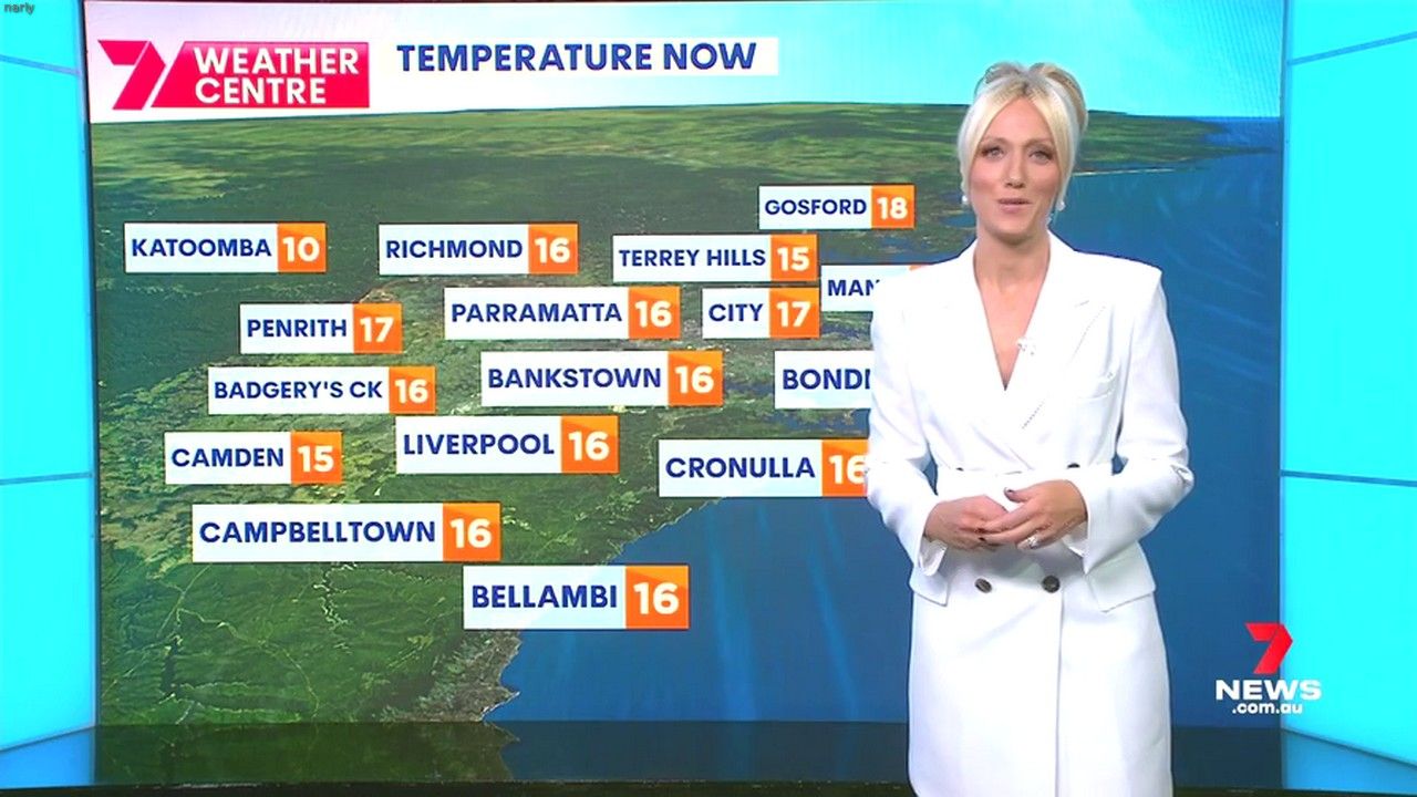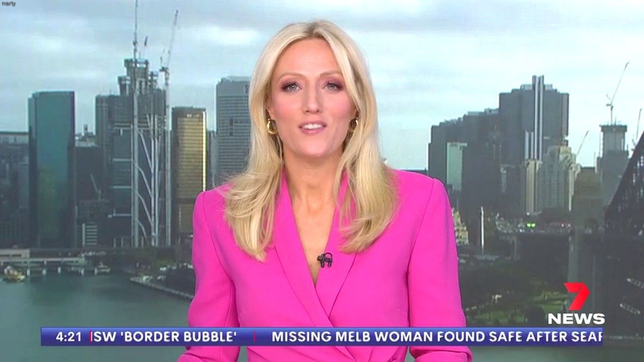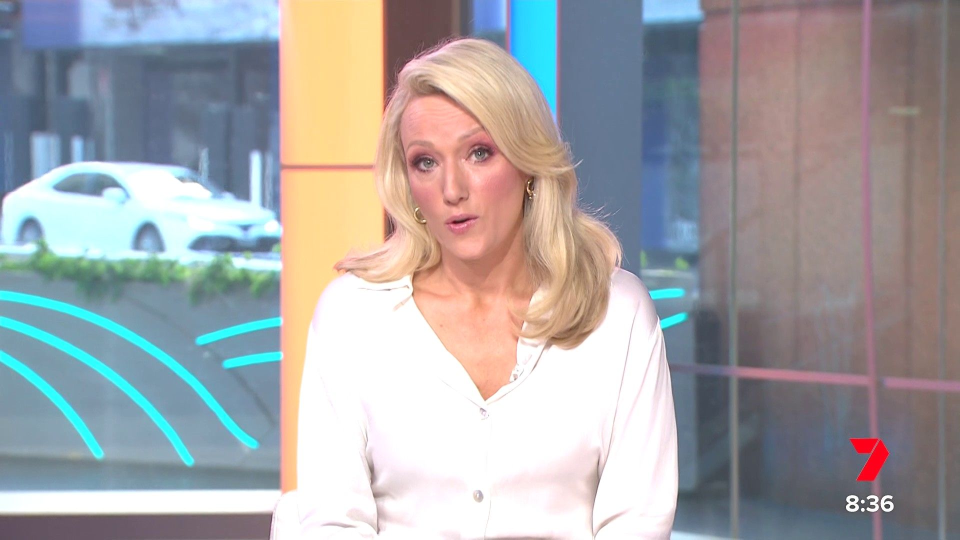 Sally hosting Morning Show in red split skirt today at about 9:35 with Gemma Acton saw her again on high chairs