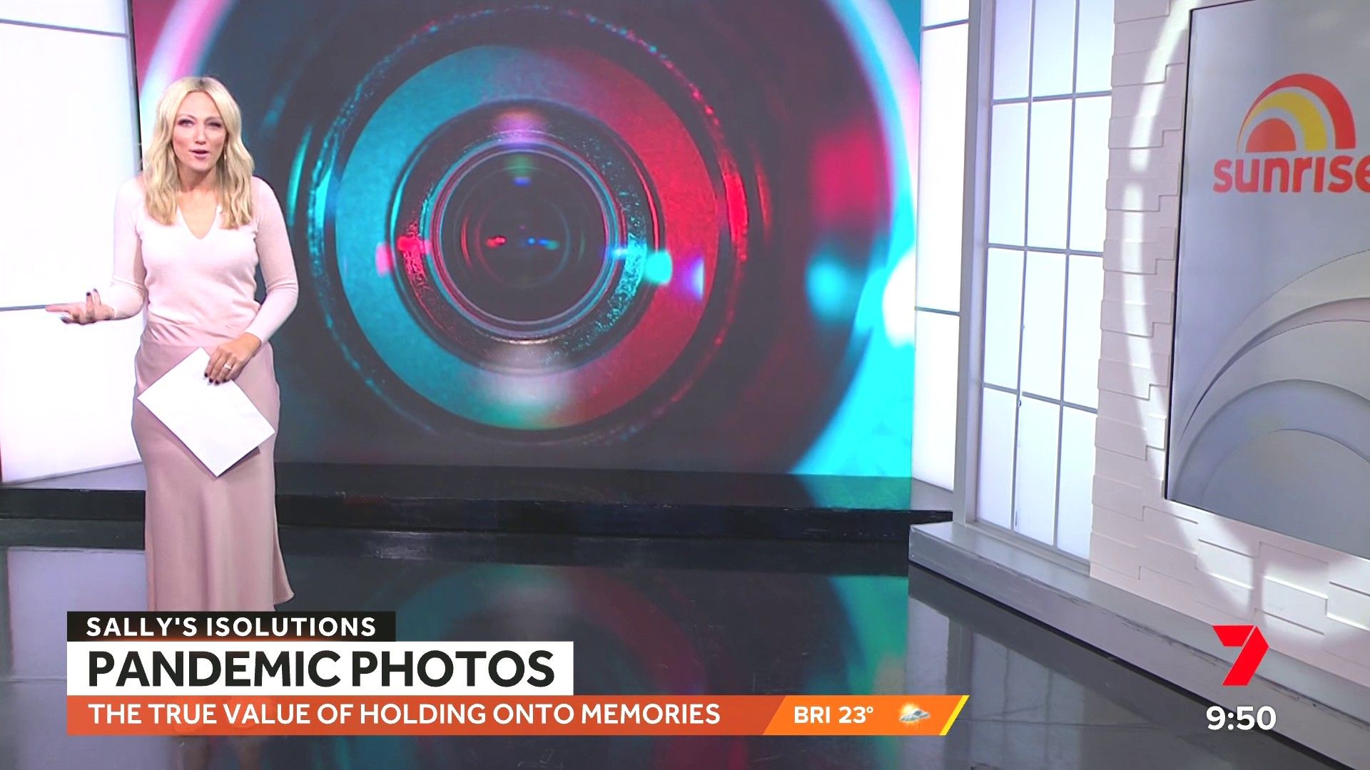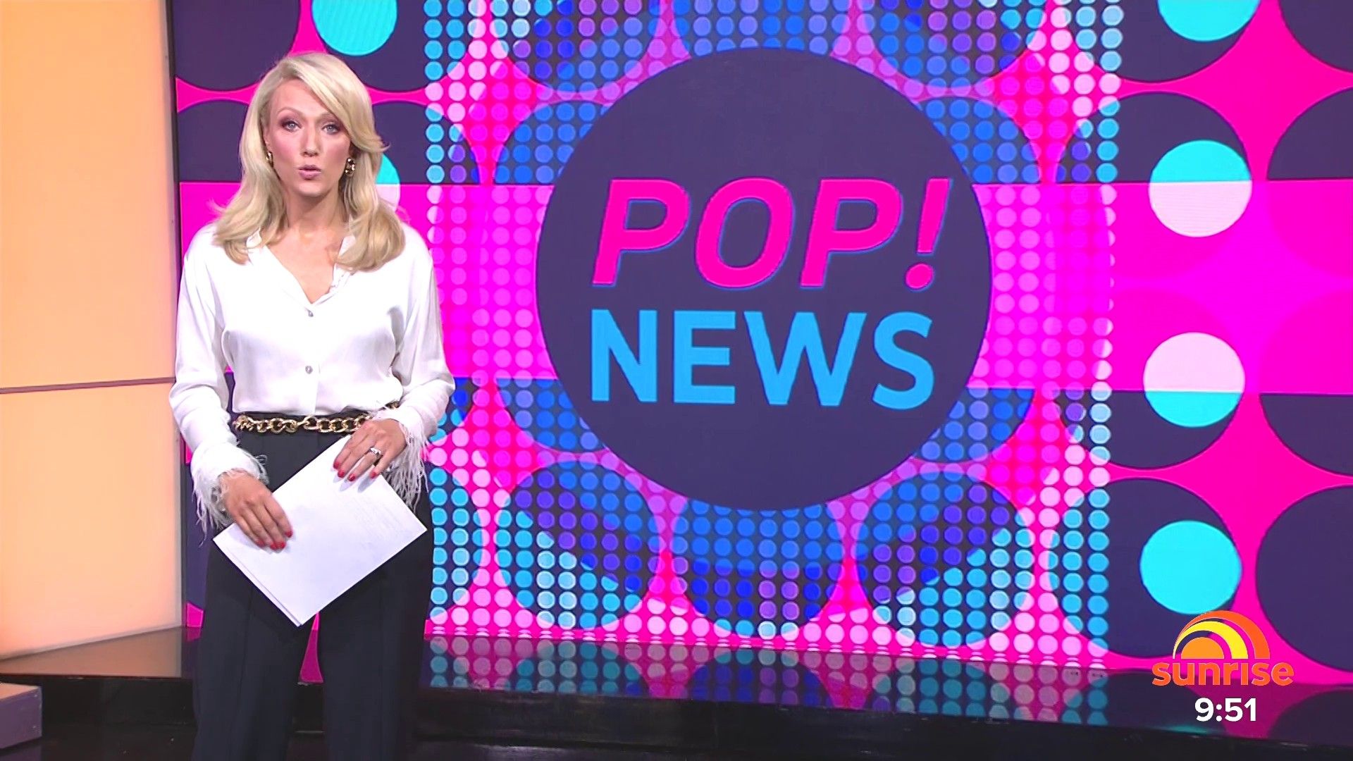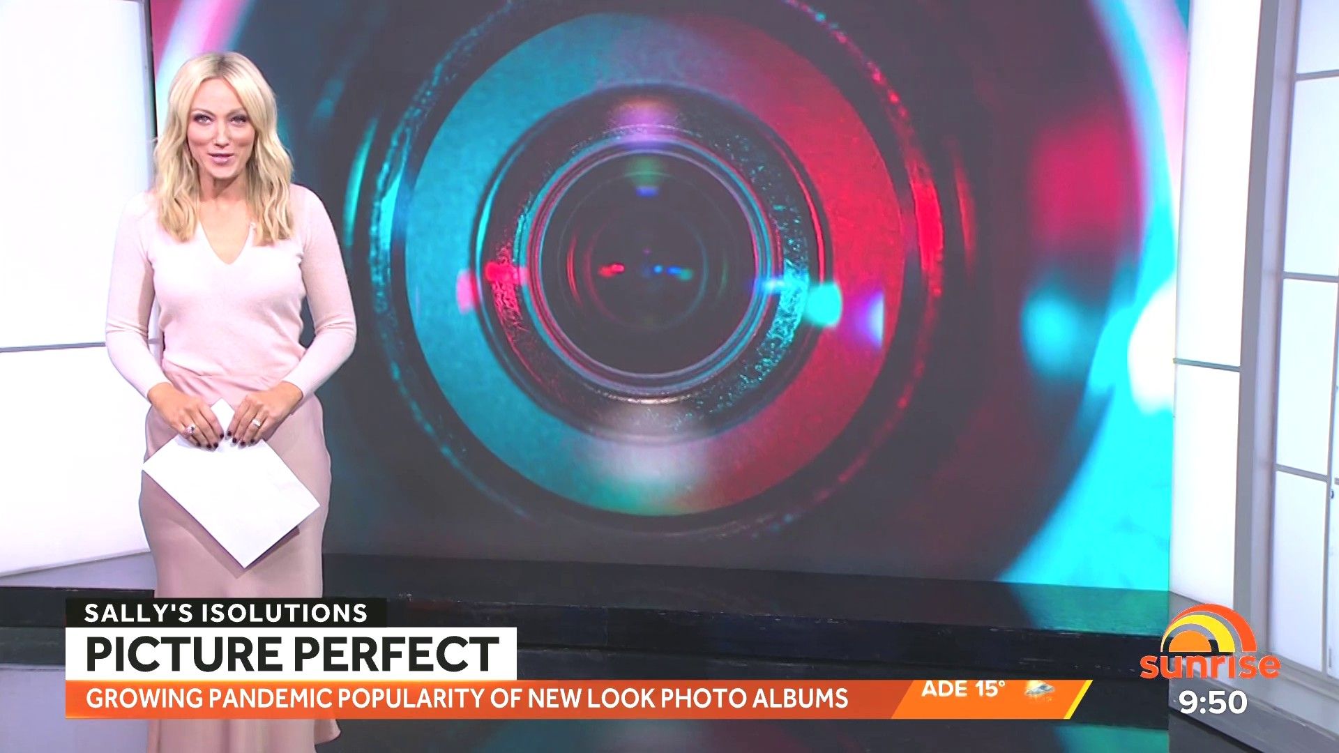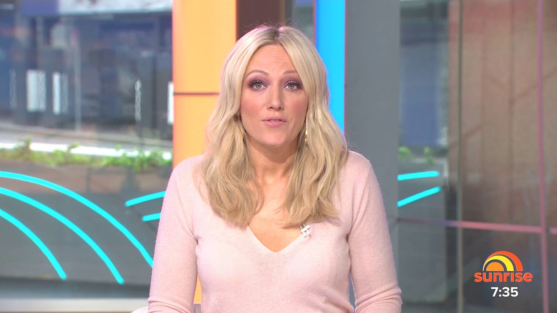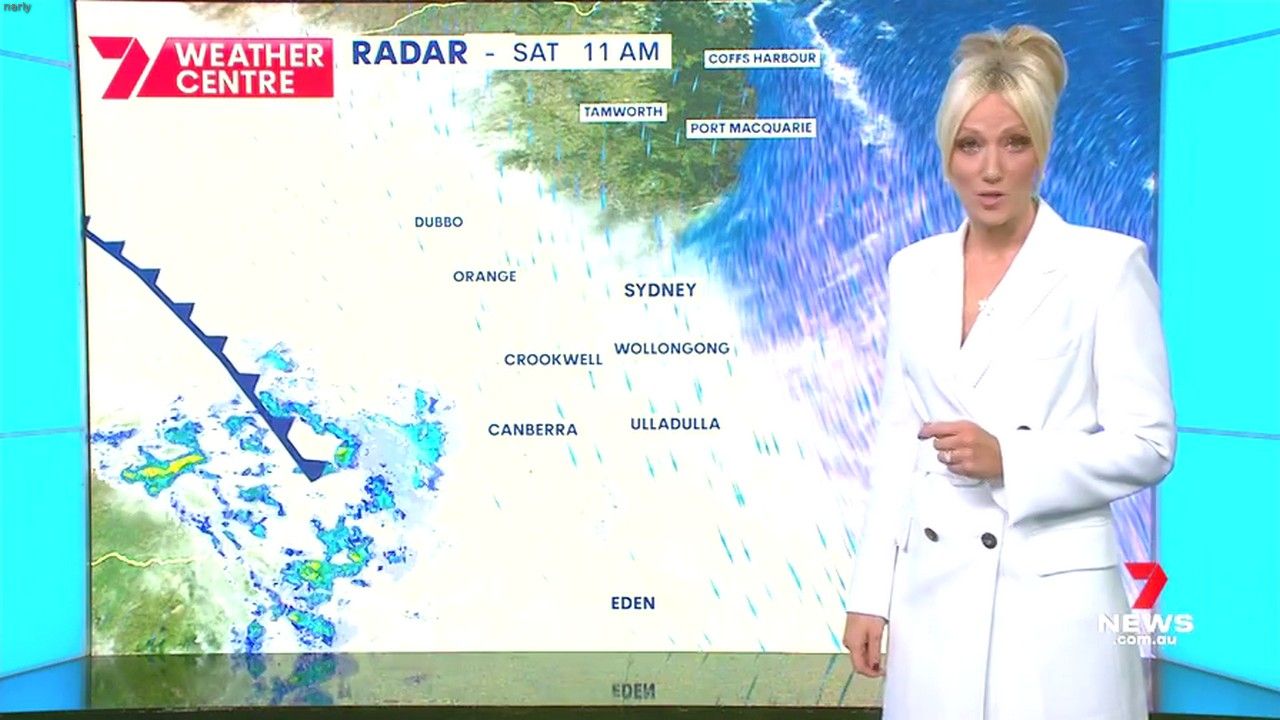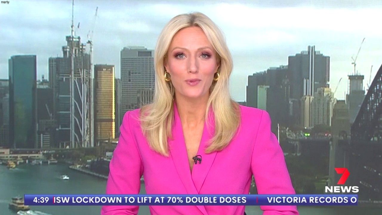 Sally hosting Morning Show in red split skirt today at about 9:35 with Gemma Acton saw her again on high chairs