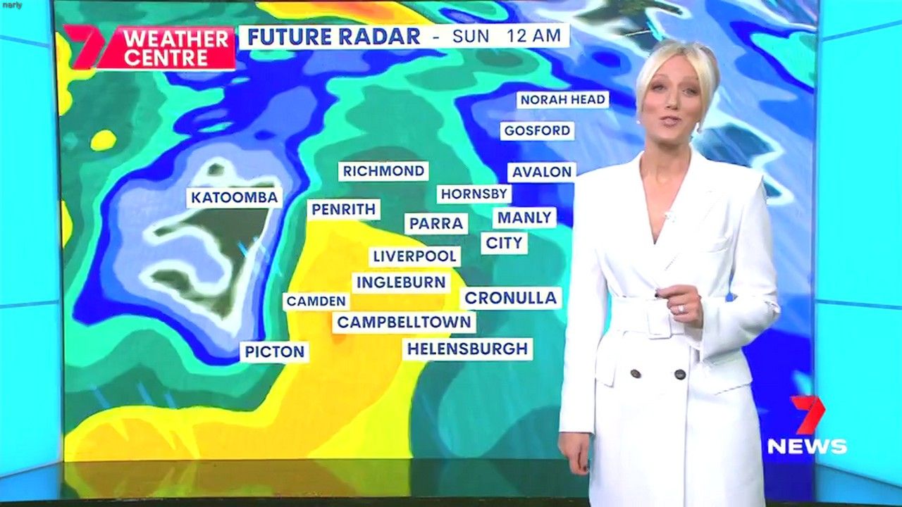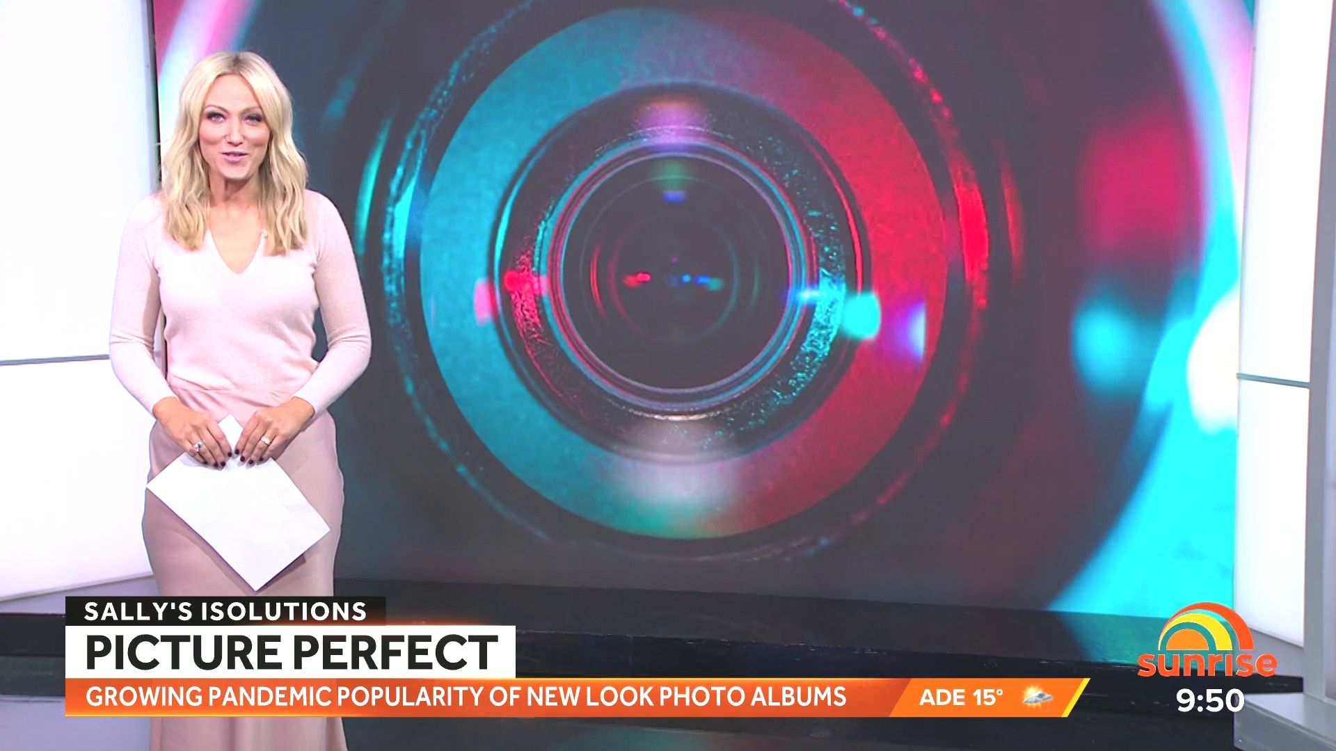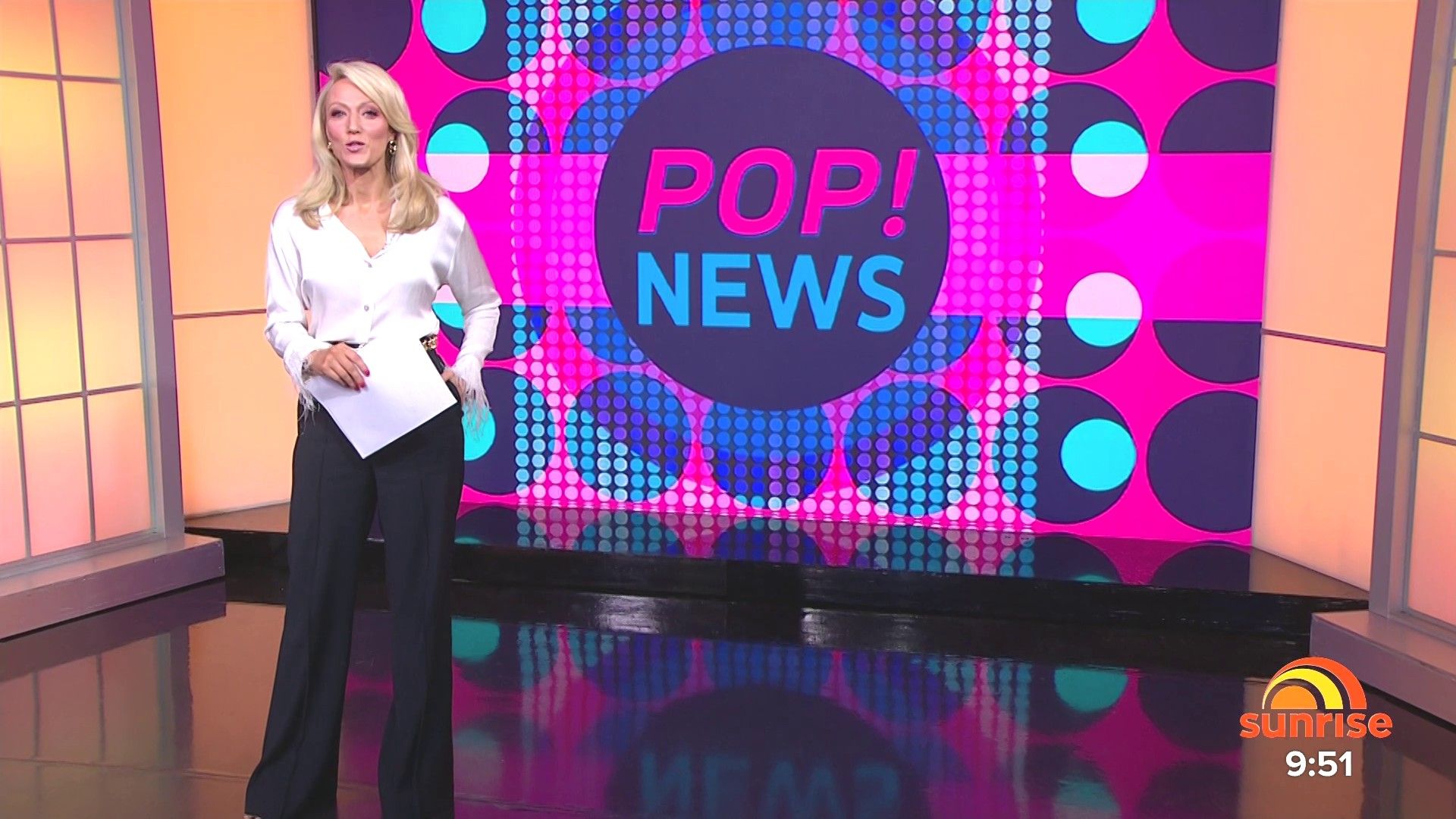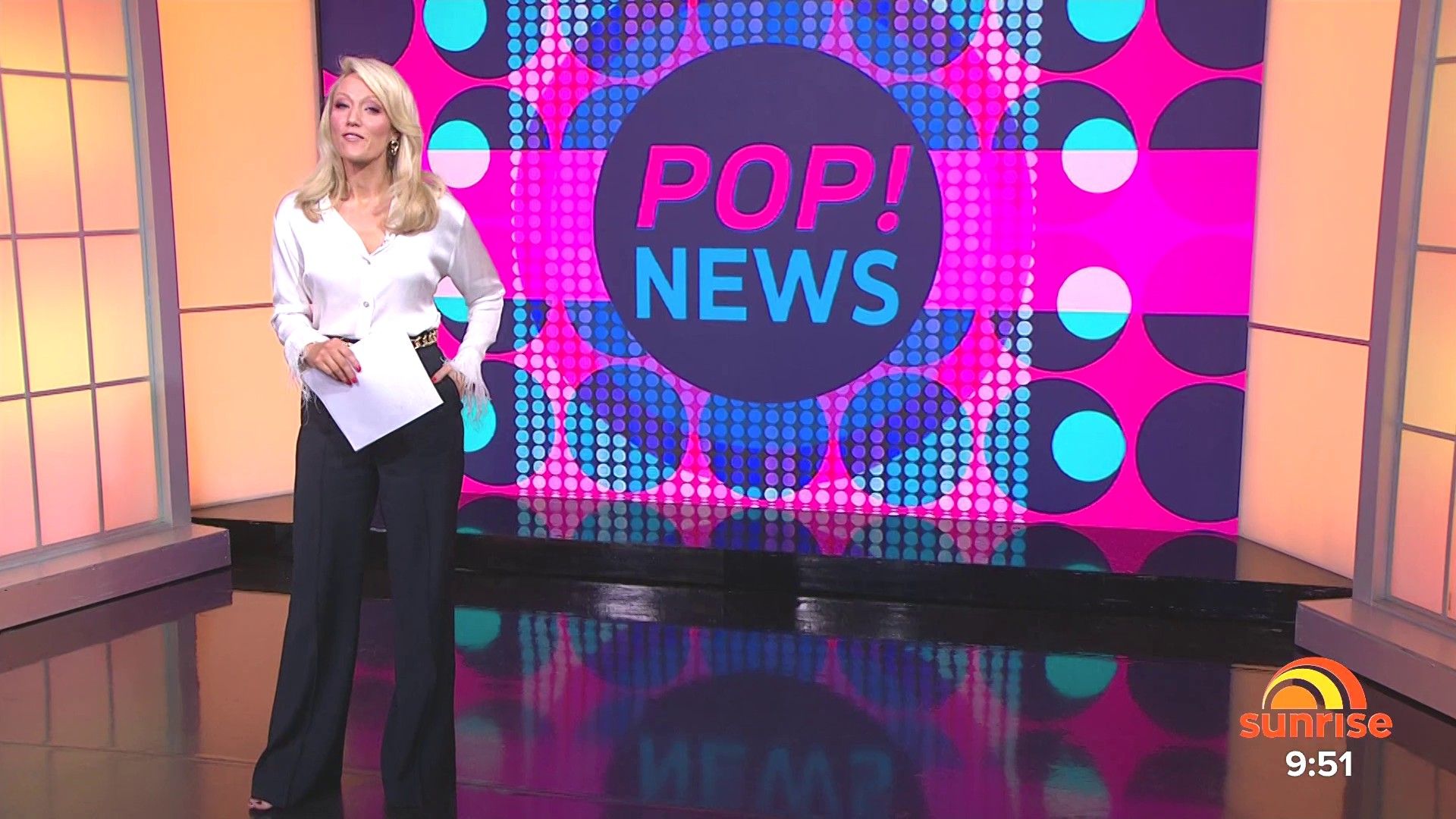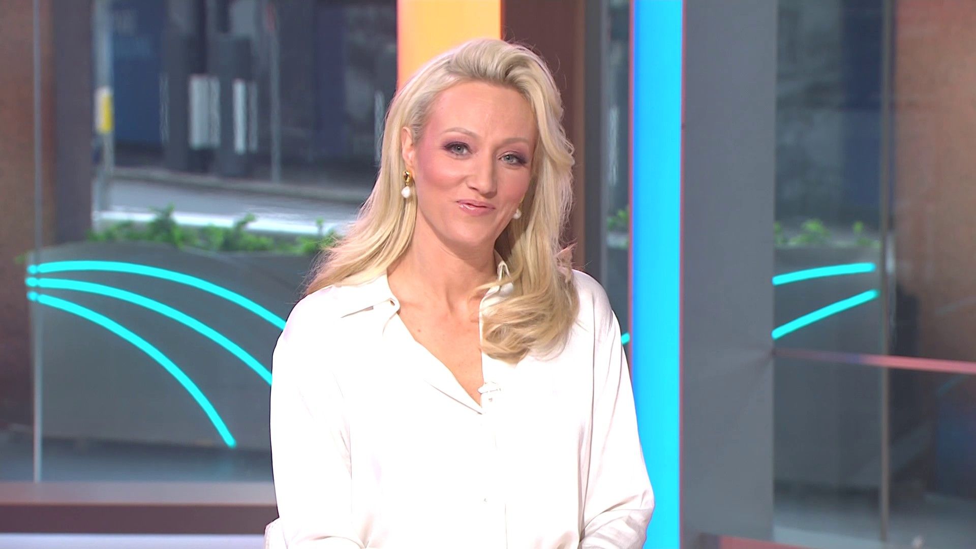 Sally hosting Morning Show in red split skirt today at about 9:35 with Gemma Acton saw her again on high chairs