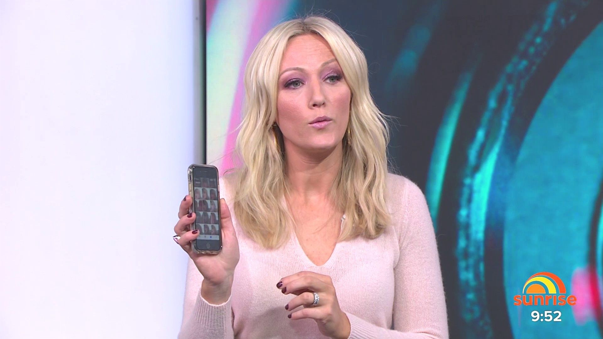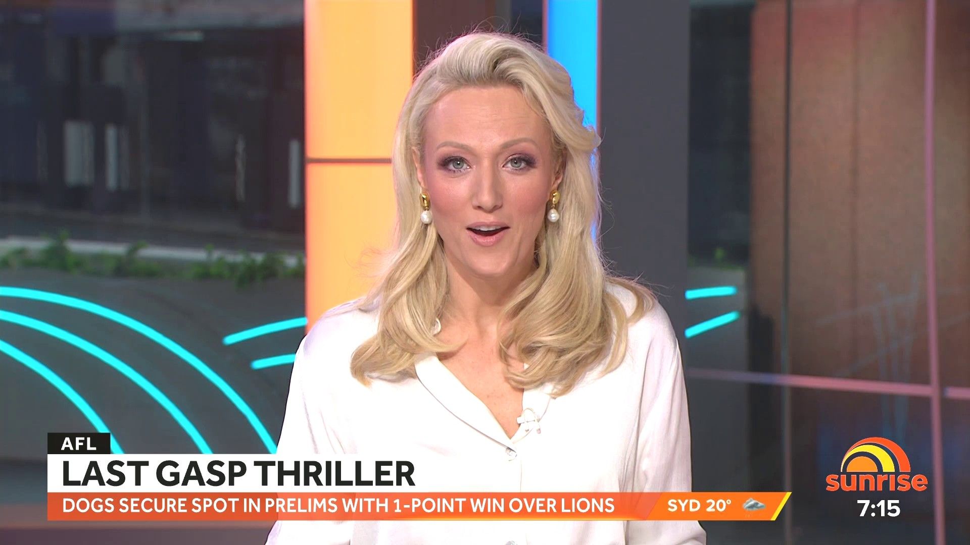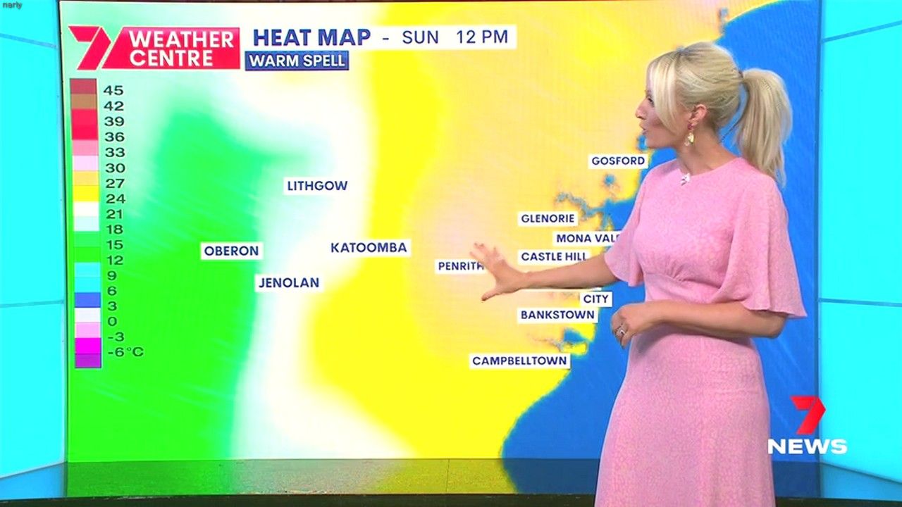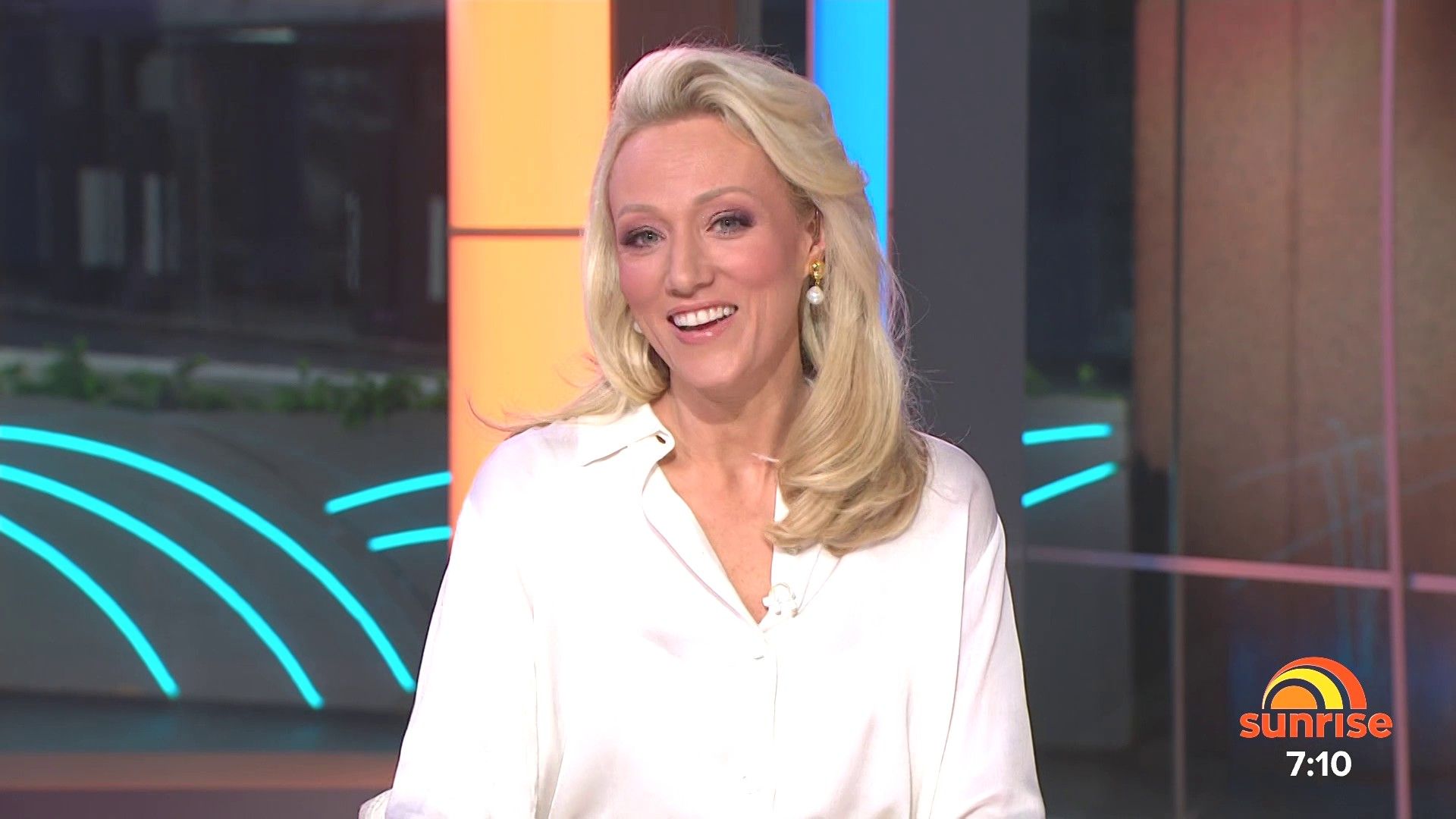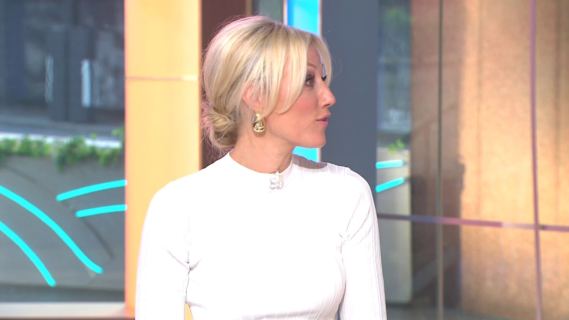 Sally hosting Morning Show in red split skirt today at about 9:35 with Gemma Acton saw her again on high chairs