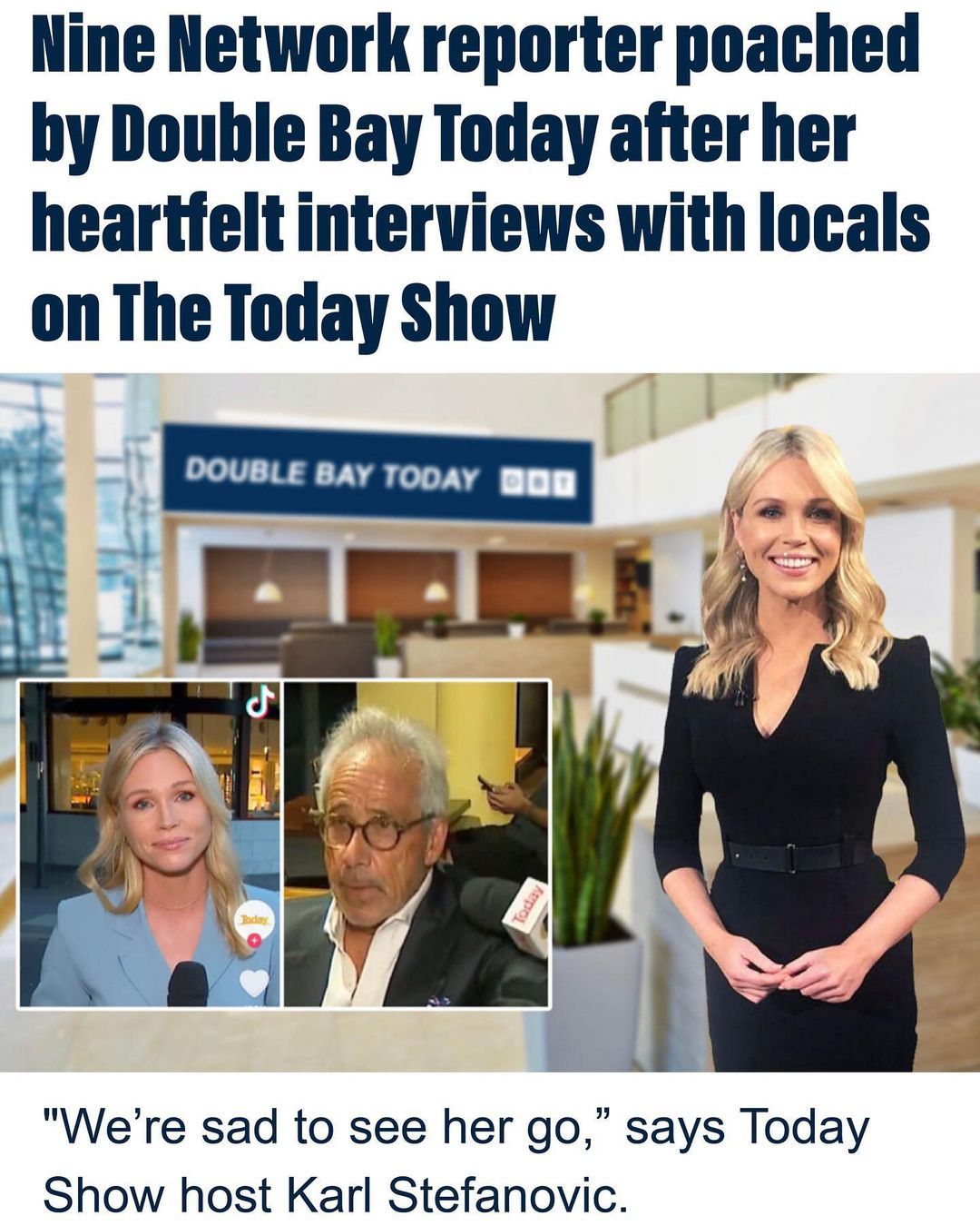 Another good one gone from TV. CAREER PIVOT: High profile Today Show reporter Lara Vella is preparing to make the transition from television to print journalism after being headhunted by Double Bay Today. "We're very excited Lara is coming on board," says a statement from Double Bay Today. "She's repeatedly shown she's got what it takes to cover big, breaking national news stories, and she'll be hitting the ground running at DBT." It follows yesterday's segment on the Today Show in which Ms Vella hit the streets of Double Bay to interview locals about the government's proposed superannuation reforms. "Lara is very in tune with the issues impacting wealthy Australians," says DBT's editor. "That's why we believe she'll be an integral part of DBT's reporting staff." Lara Vella was not available for comment for this story, but Today Show host Karl Stefanovic says he's sad she's leaving the Nine Network. "I get it though," he says. "This is an opportunity too good to pass up. Everyone here at Nine wishes her well." Lara Vella is expected to start reporting for DBT next Tuesday.