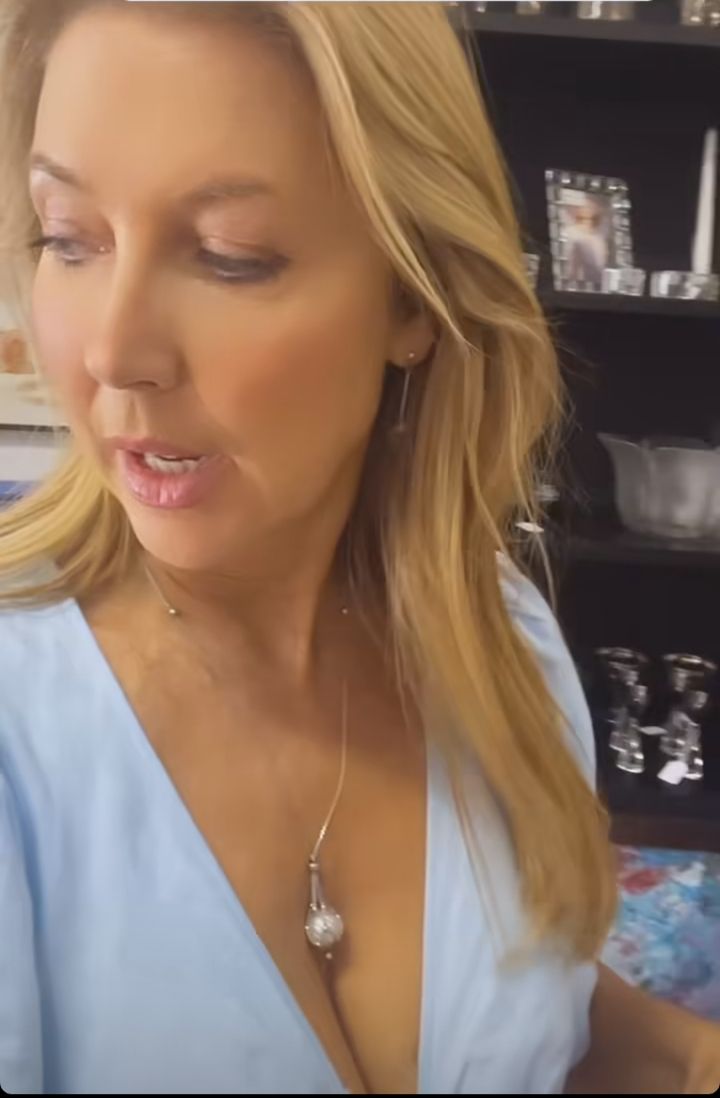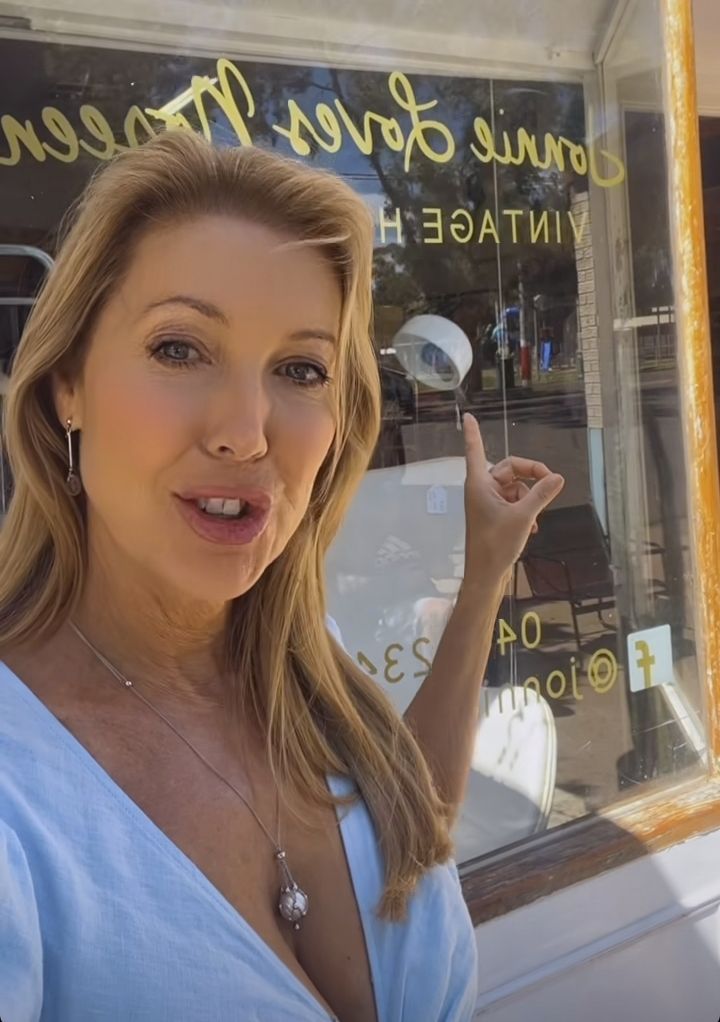 Notice how her top was down showing her cleavage, but she pulled her top up when she went into that shop but later her top was back down when she left. Love it.