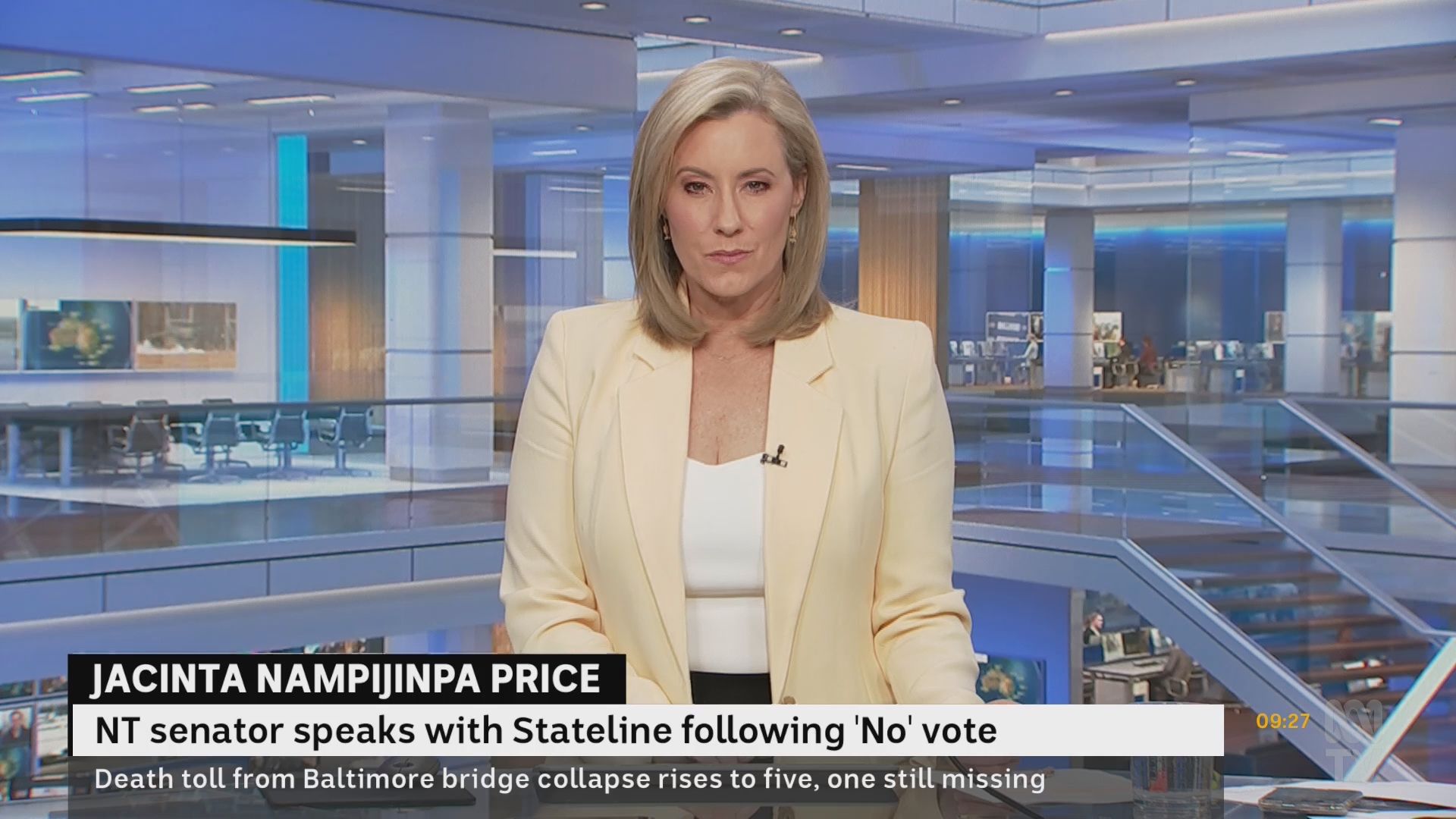 20b you are a master of subtlety ....you have the ability to pick up the slightest scintilla in Kath's expressive face. If #4 doesn't put a smile on your face then you're not breathing! It's Kathryn to a tee ..... cheeky, gummy smile (avec dimples), playing the camera so well with that twinkle in her eye. You can't help but love her ..... not many presenters can consistently bring life, energy and fun to what is essentially a continuous news program. She was absolutely gorgeous today .... subtle, minimal make-up, luxurious blonde hair and carefree mood. And once again Kath had her shoes parked beside the desk, although you could see that she was standing in bare feet as her womanly hips were splayed more than usual. Unfortunately this is probably Kath's last week for awhile as she usually takes the next two weeks off (NSW school hols). Presumably Gemma and/or Lorna will be filling-in? But then the ABC needs Kath back, as she is revolutionising the delivery and hence the appeal of the News Channel!