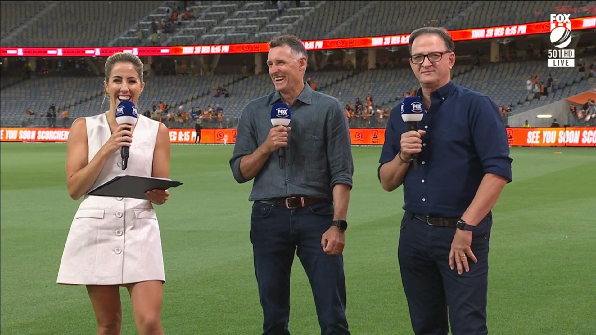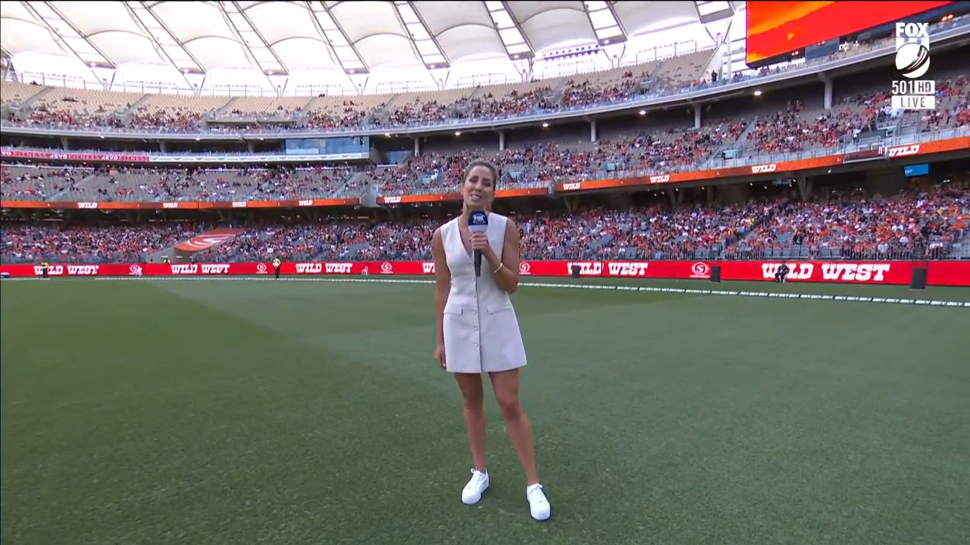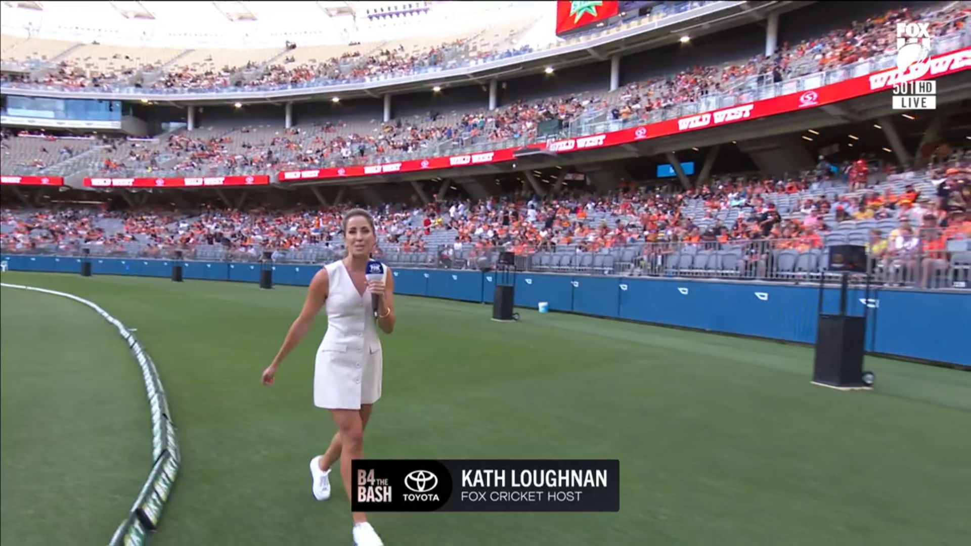 Nice little walk on at start of big bash coverage tonight. Showing full length shots in a little white dress