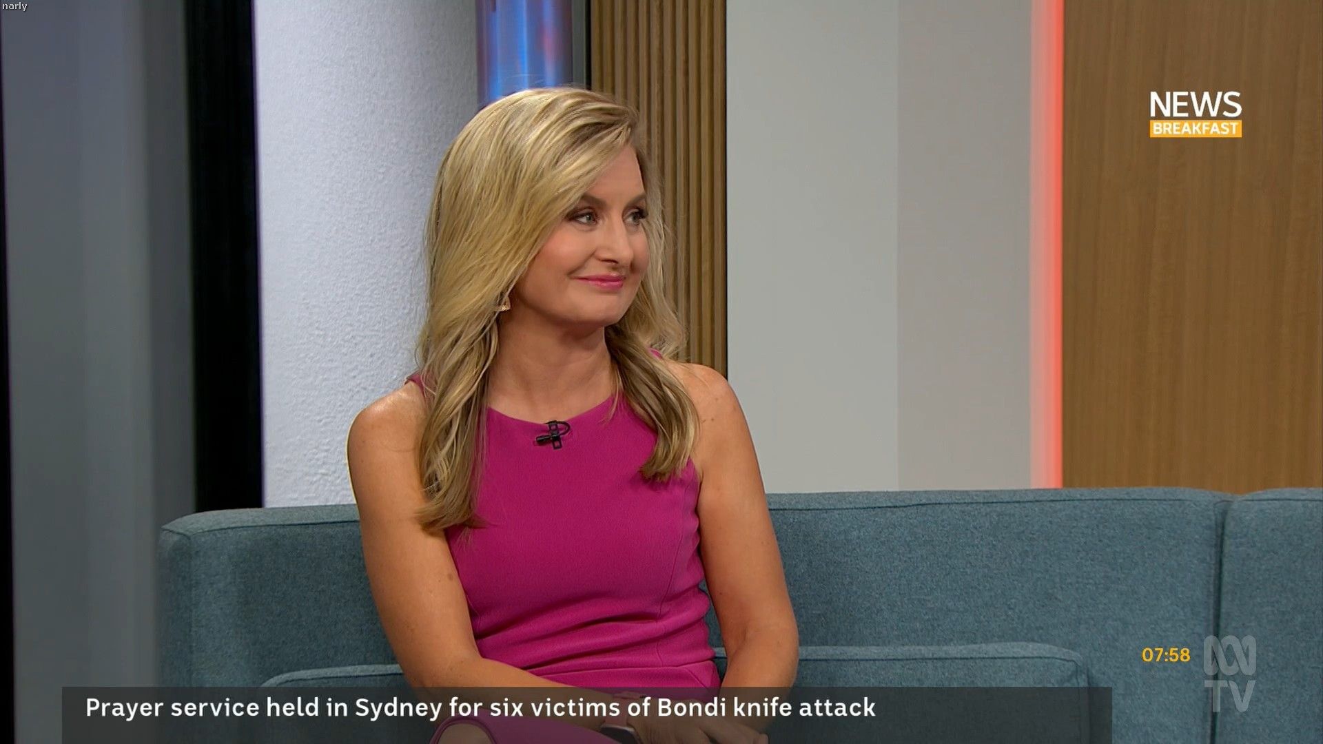 Steph doing the weather nice split in her skirt on the couch at 8:55am approx