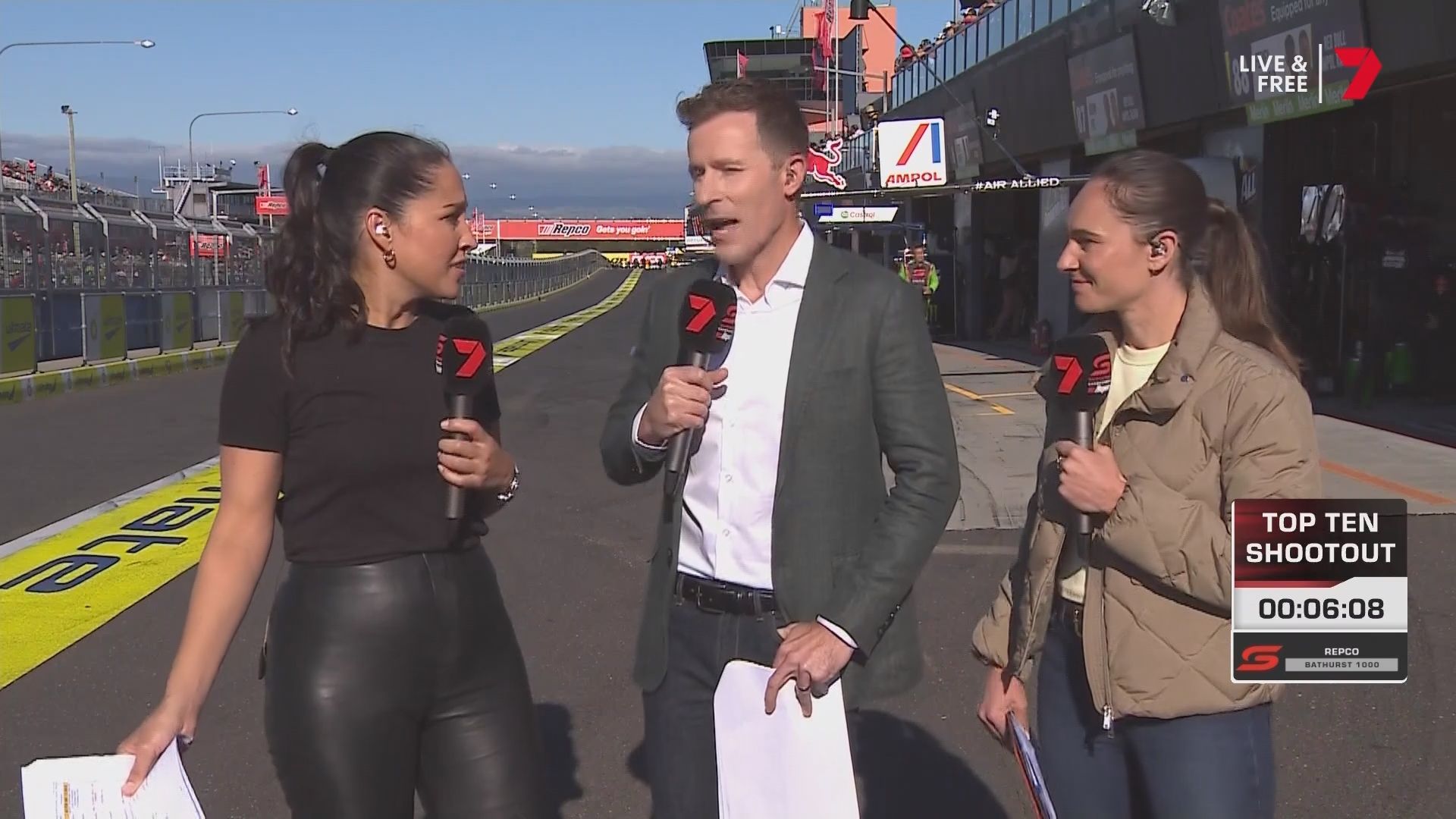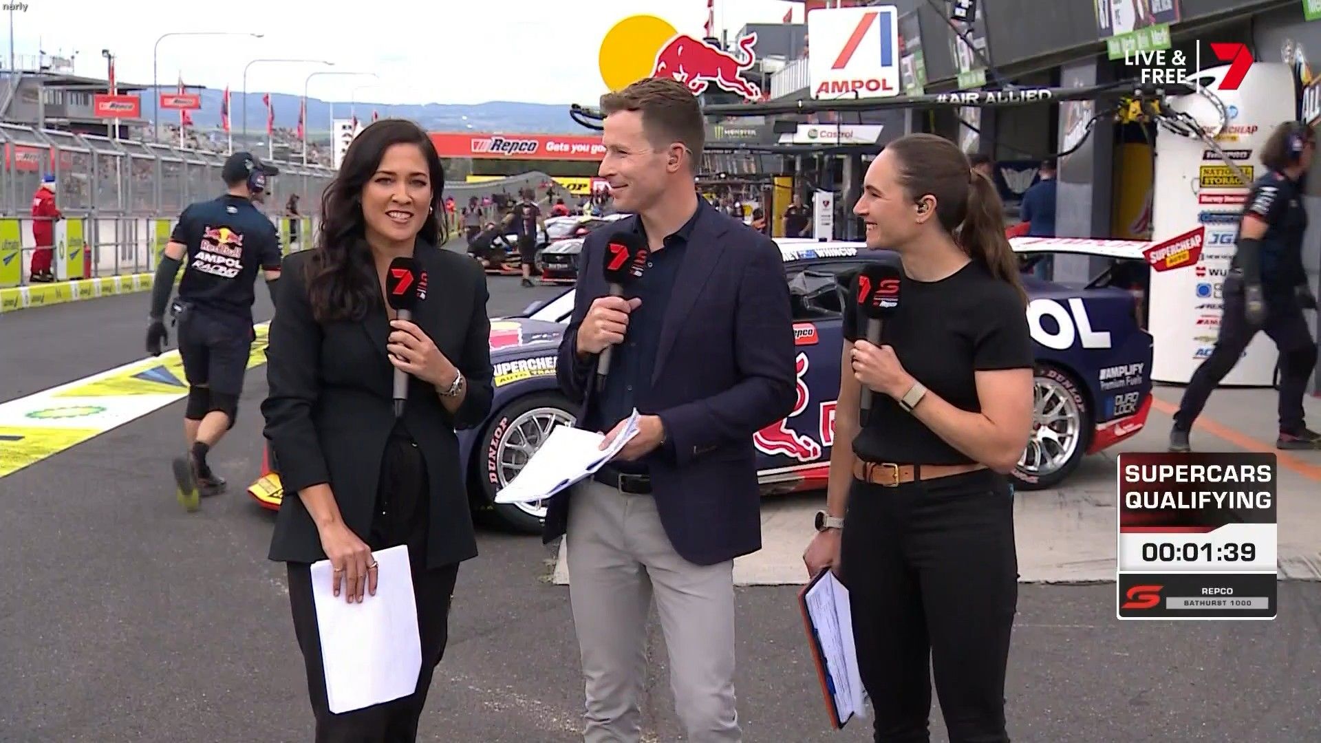 Quote:  Molly cringing with embarrassment for Mel by proxy. Notice too how the HSE requirement for Nomex fireproof pajamas for access in the pits has been thrown out the window when you turn up in leather pants. Nobody in this picture is wearing it Romper suits are only required in pit lane if refueling is going to take place in the lane. This picture was taken 6 minutes before the shootout, there is no pit lane refueling during the shootout. Oh and you can wear shorts and a T-shirt in the pits all the time if you like, you just can’t cross the line from the garage when there is the possibility of a fire due to refueling. Here’s riana crehan in the lane during qualifying (no refueling) in shorts and a tank top.