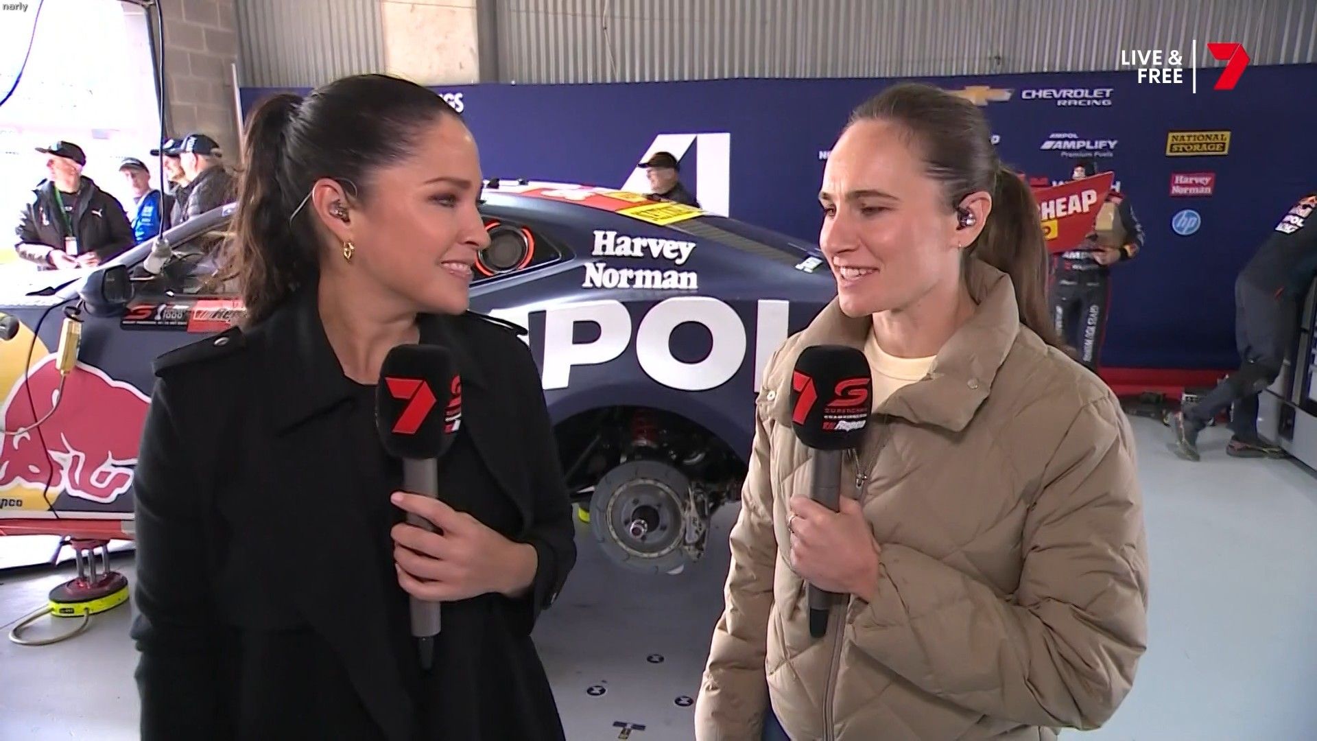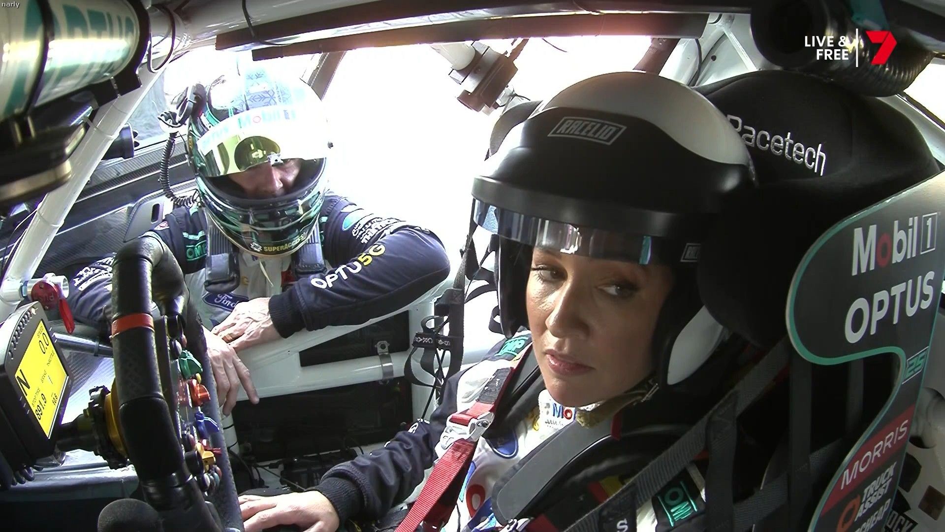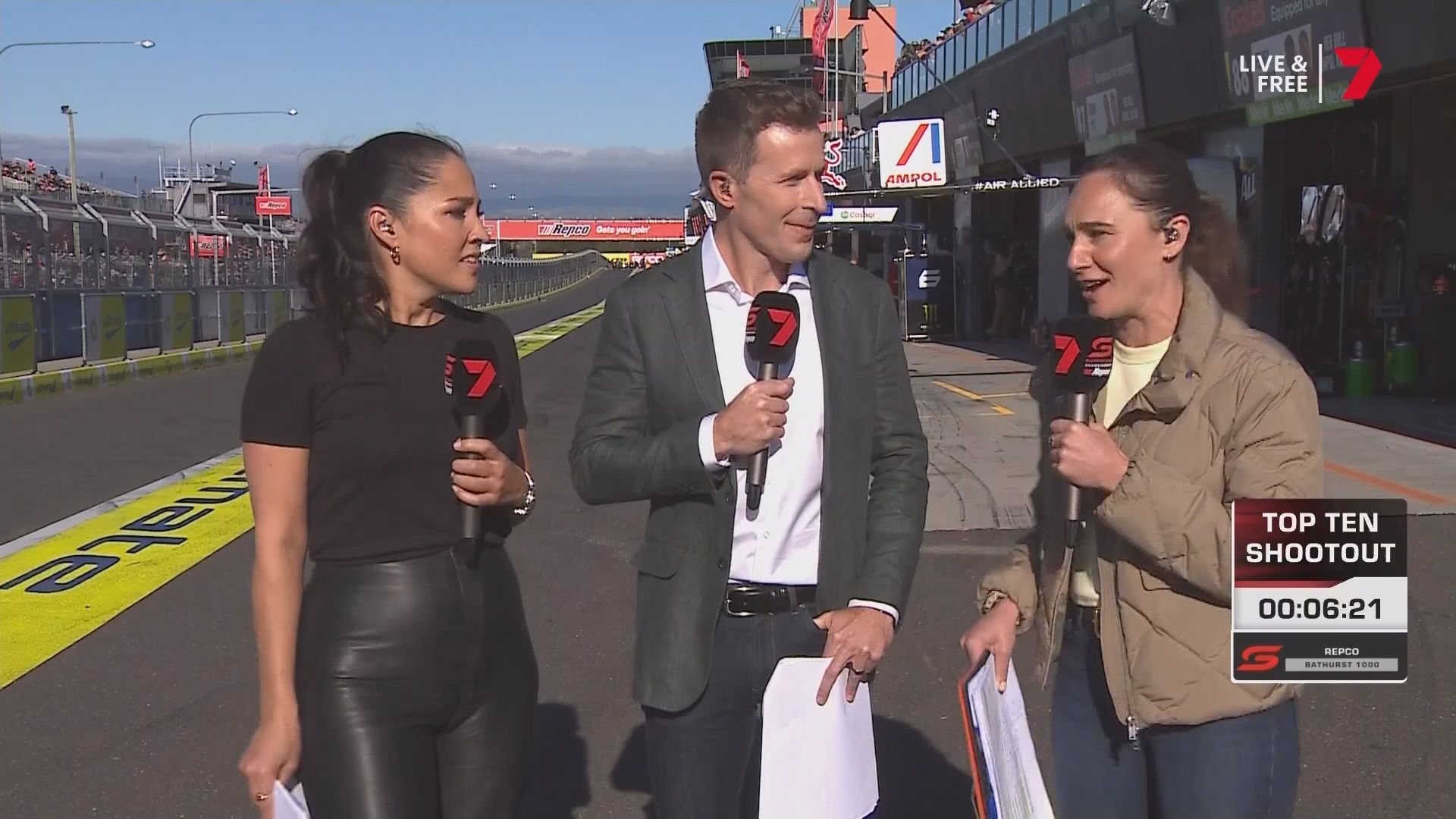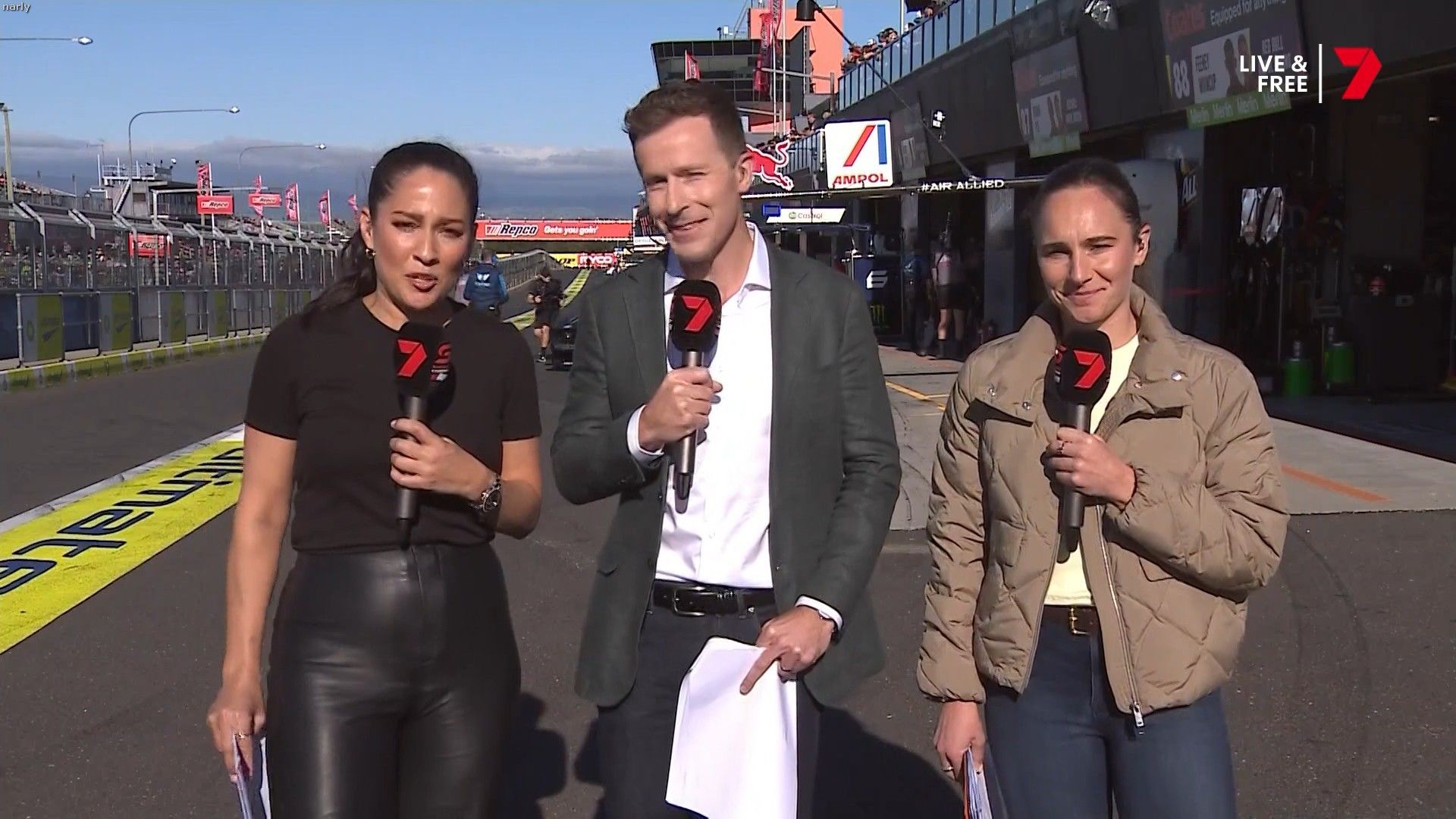 Quote:  Molly cringing with embarrassment for Mel by proxy. Notice too how the HSE requirement for Nomex fireproof pajamas for access in the pits has been thrown out the window when you turn up in leather pants. Nobody in this picture is wearing it Romper suits are only required in pit lane if refueling is going to take place in the lane. This picture was taken 6 minutes before the shootout, there is no pit lane refueling during the shootout. Oh and you can wear shorts and a T-shirt in the pits all the time if you like, you just can’t cross the line from the garage when there is the possibility of a fire due to refueling. Here’s riana crehan in the lane during qualifying (no refueling) in shorts and a tank top.