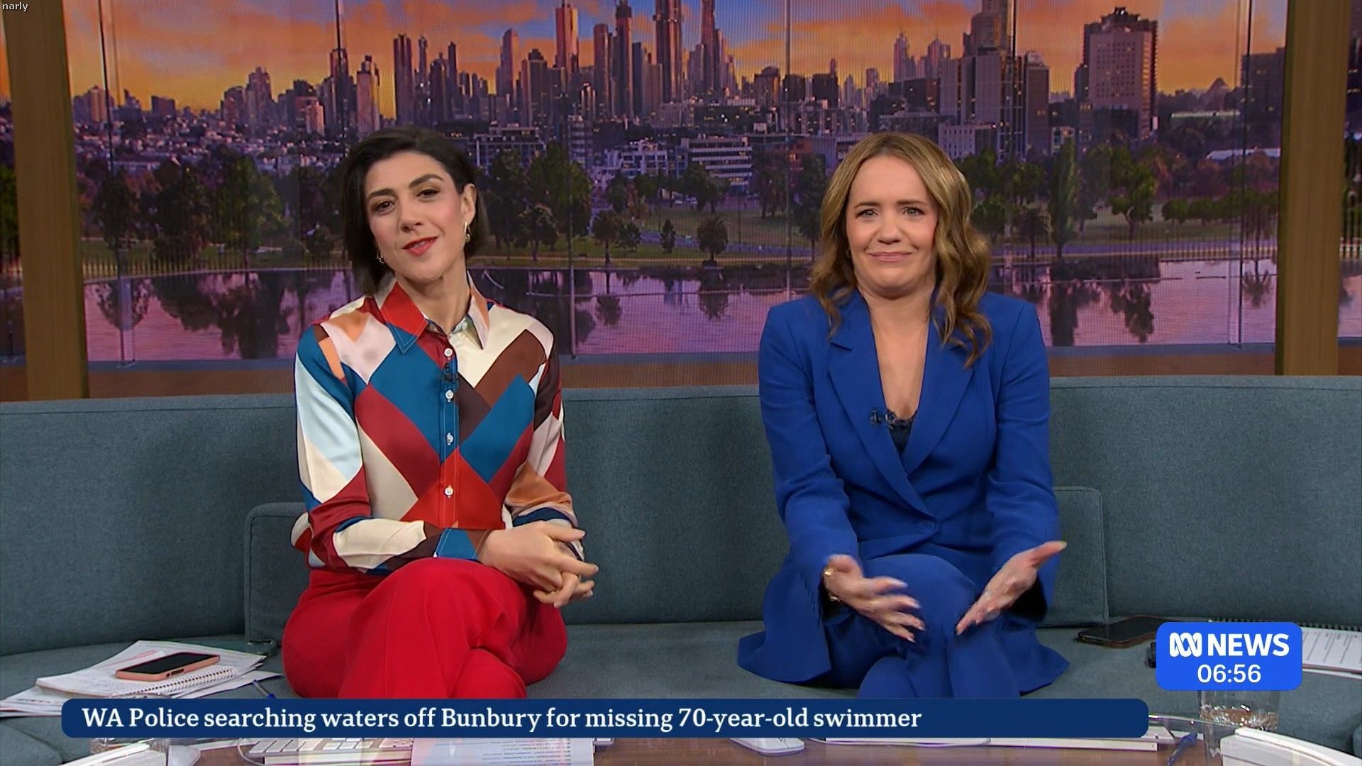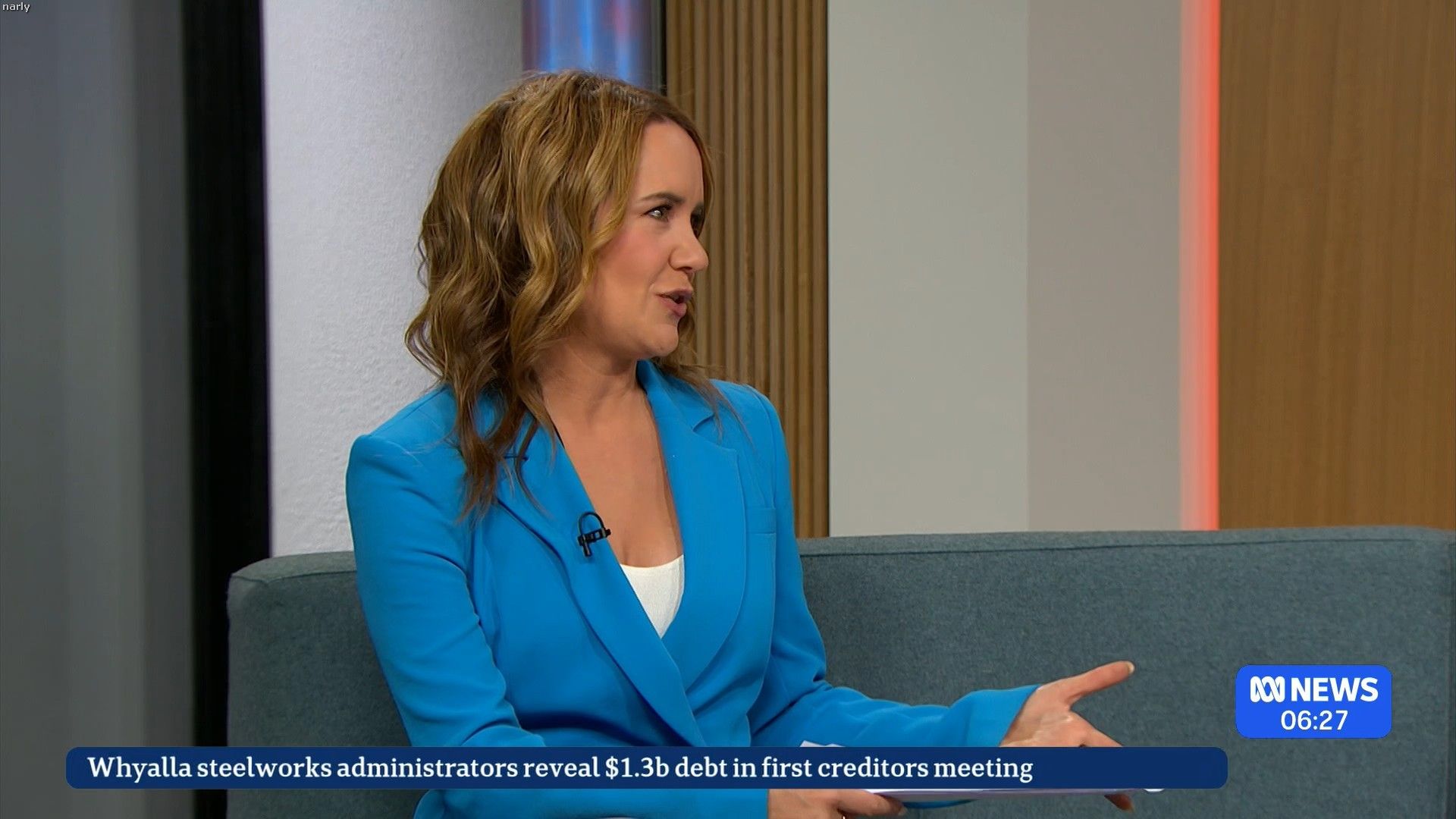 About 8:40 on the couch sitting on the opposite side to her normal position in nice blue short dress