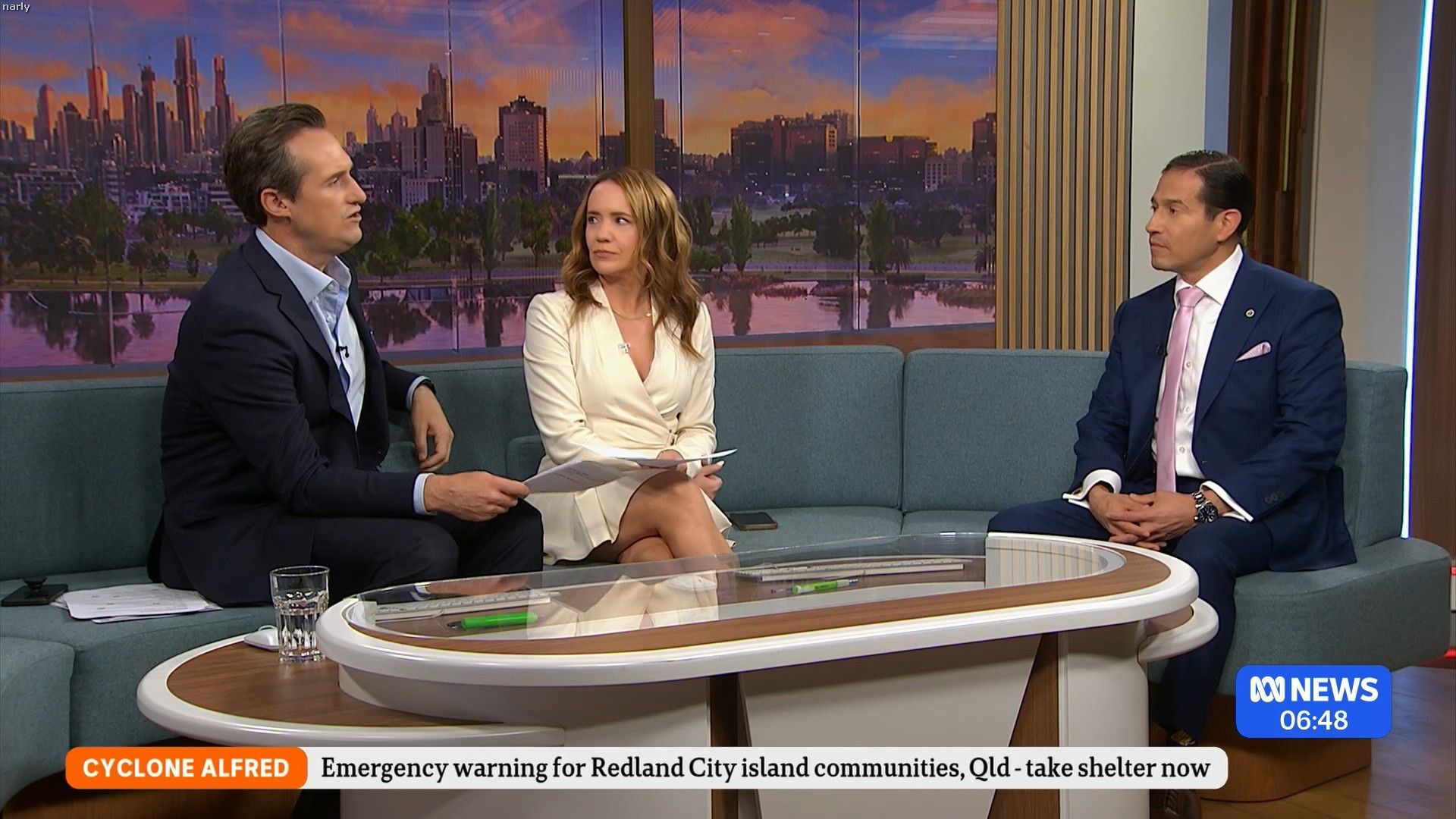 I'm no longer able to cap, but if Catherine Murphy is in a dress and walks across the highly polished floor of the studio, there's a chance of a peek of leg in the floor reflection.