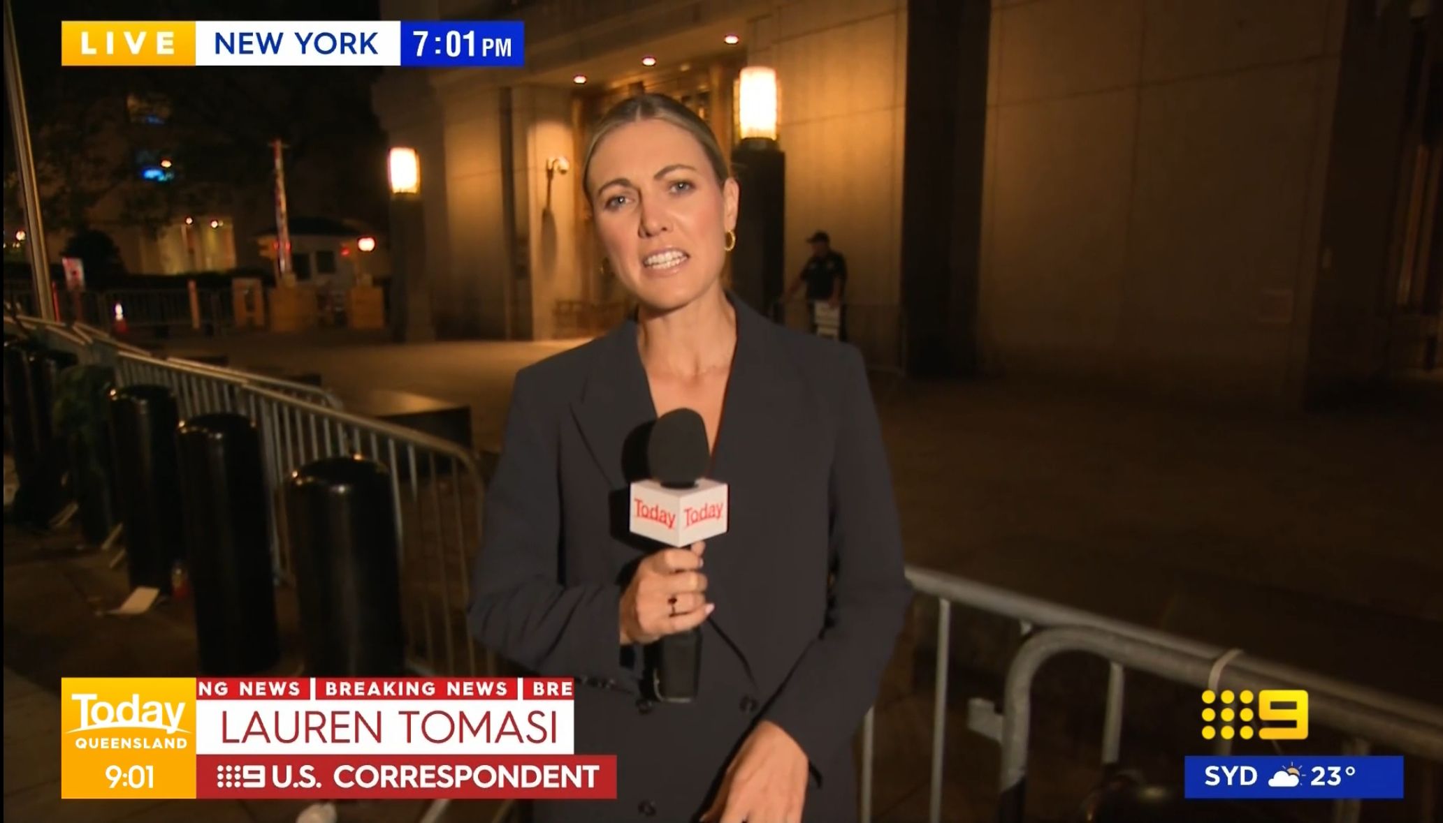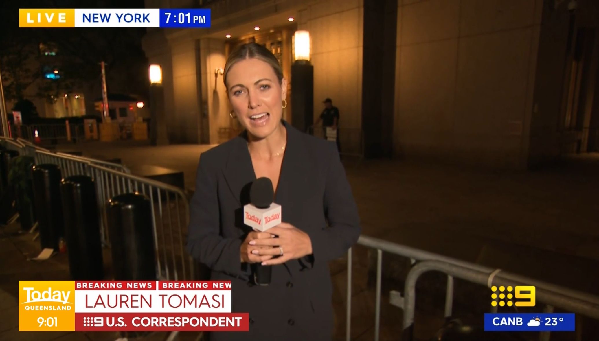 Not exactly like she suddenly appears as a threat out of a crowd of people, she was just standing there, with her back to him and a camera person in front of her.