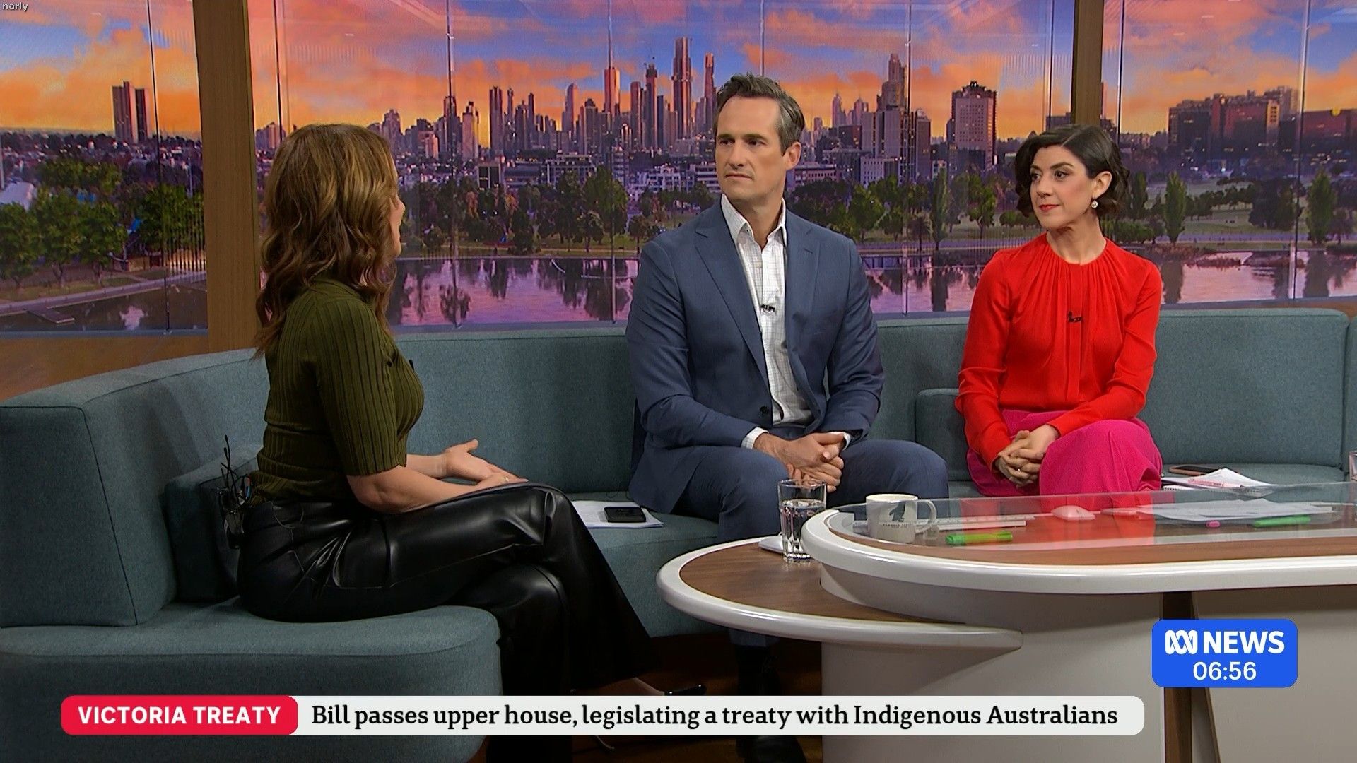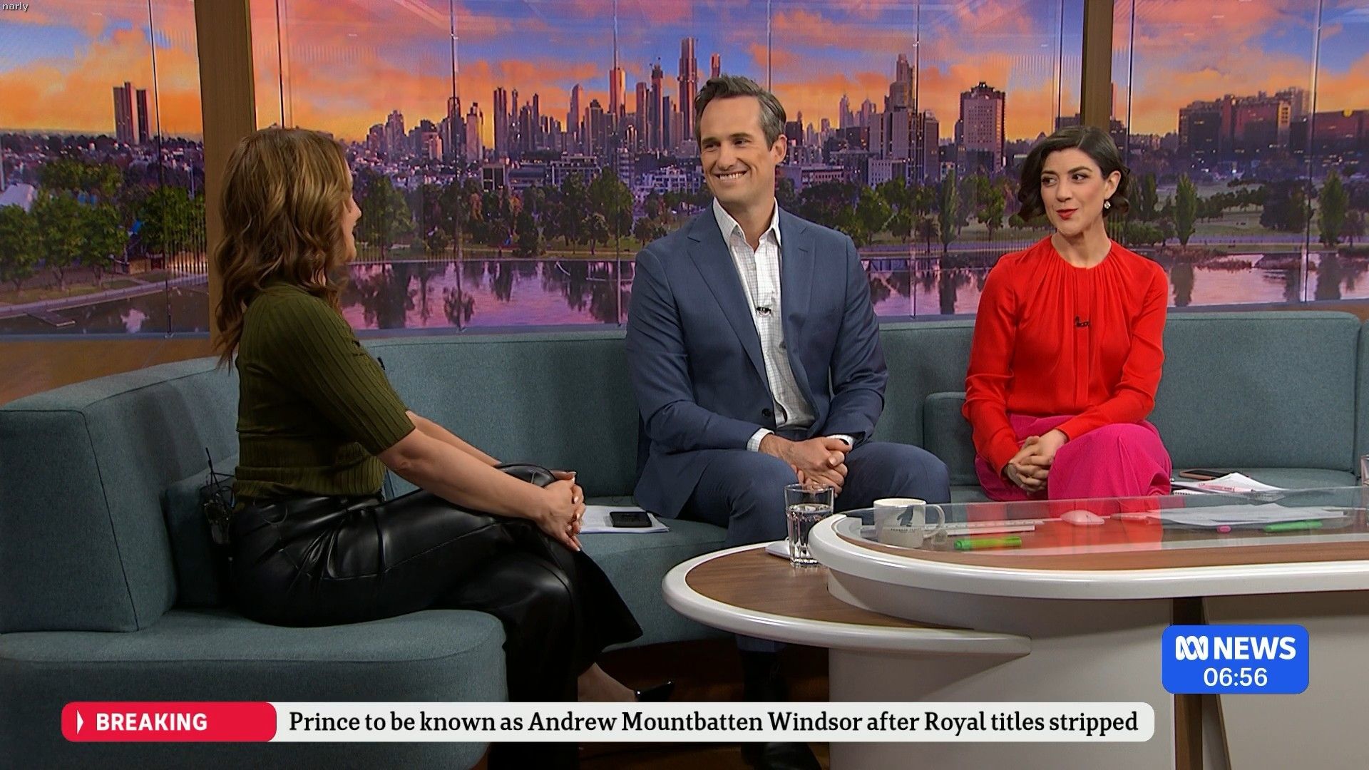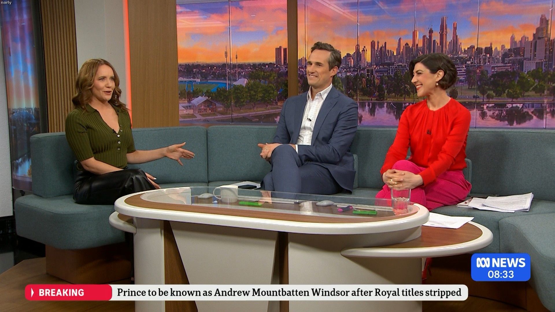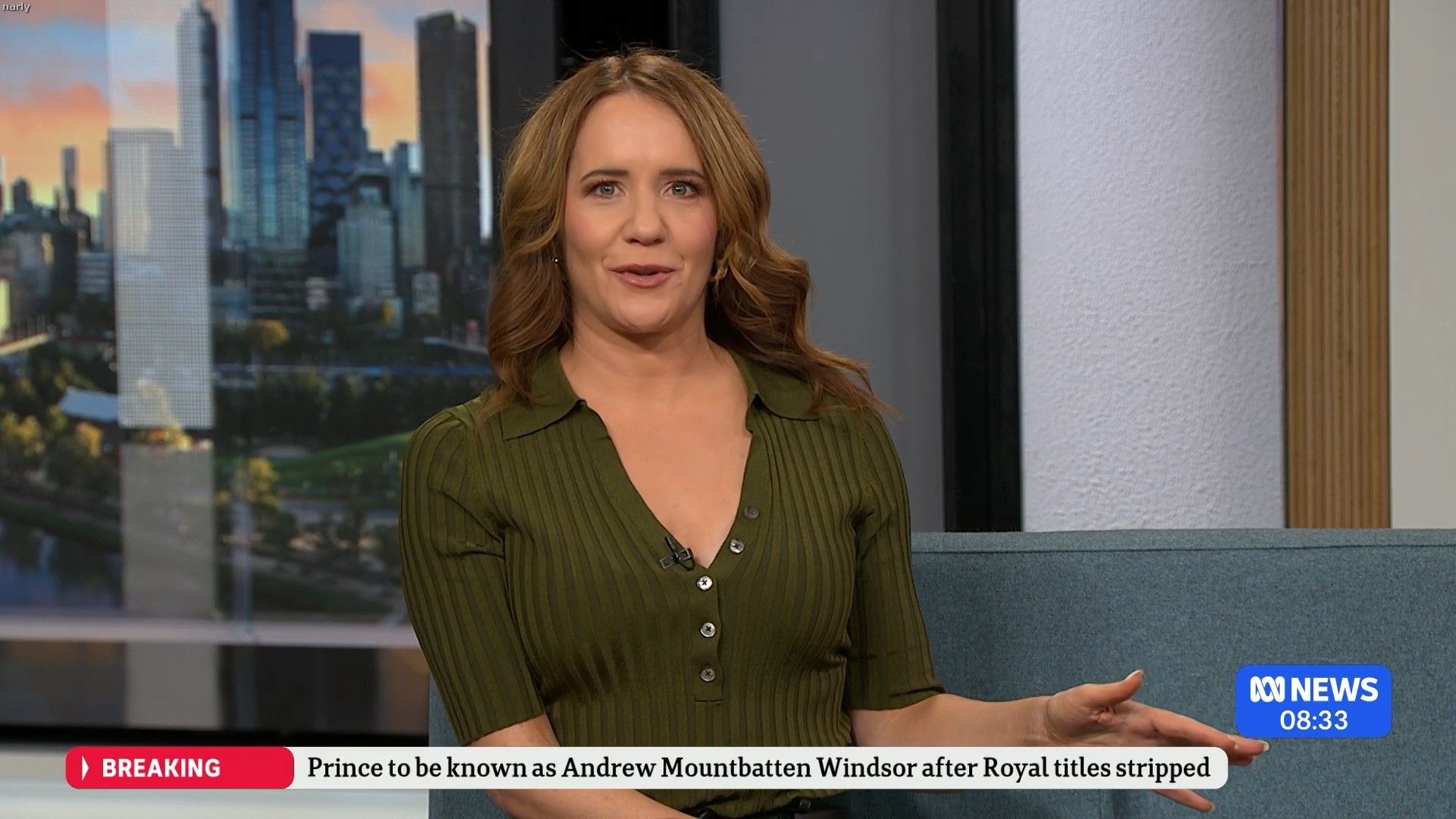 In the first 5 to 10 minutes of that News Breakfast Stephanie Ferrier had the left flap of her split dress lying flat on the couch, and she was showing a bit of thigh. Someone must of alerted her to it, because for the rest of the show she made sure to have that flap tucked in-between her legs and she put her hands over the split so covering as much thigh as possible.