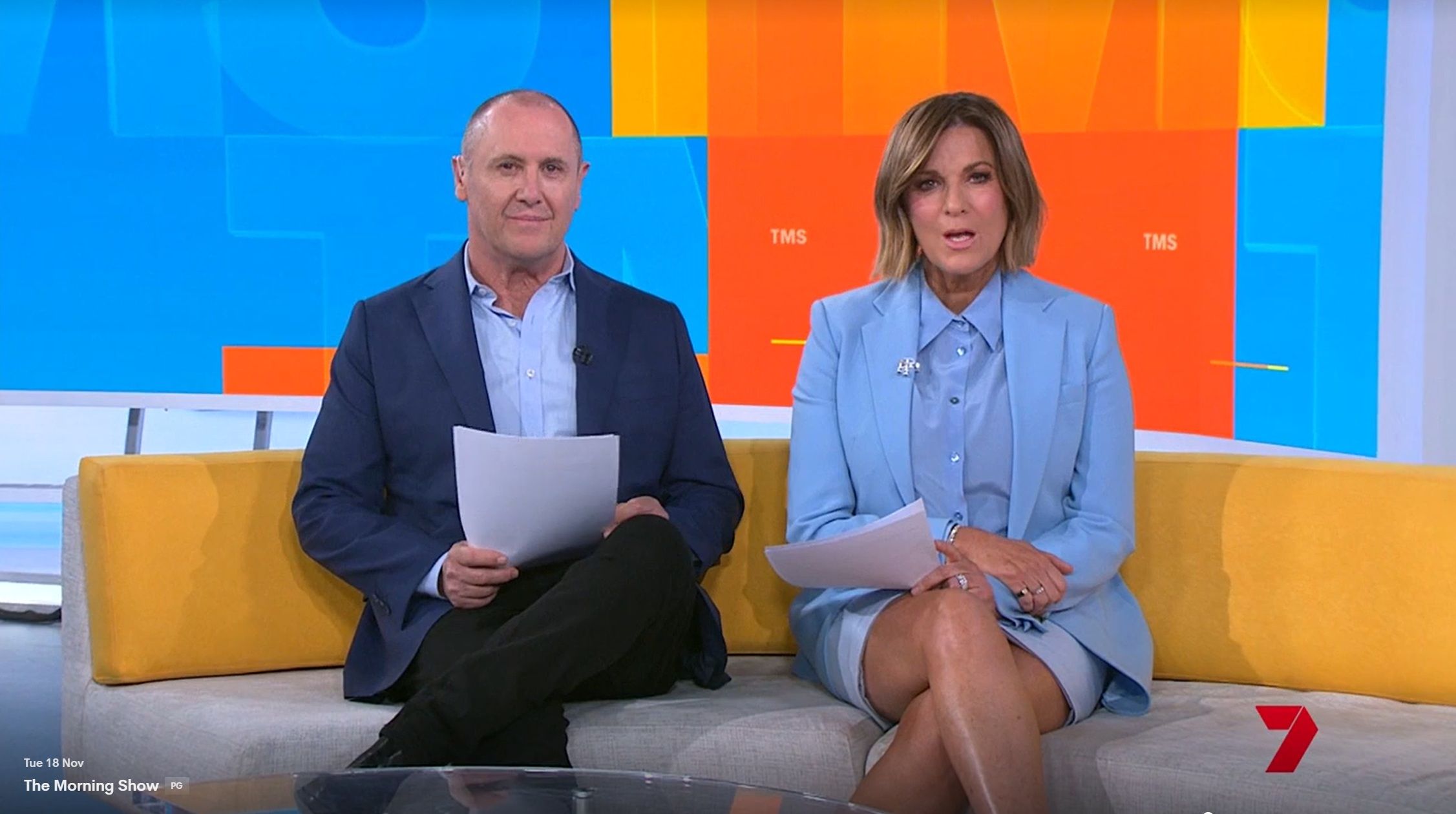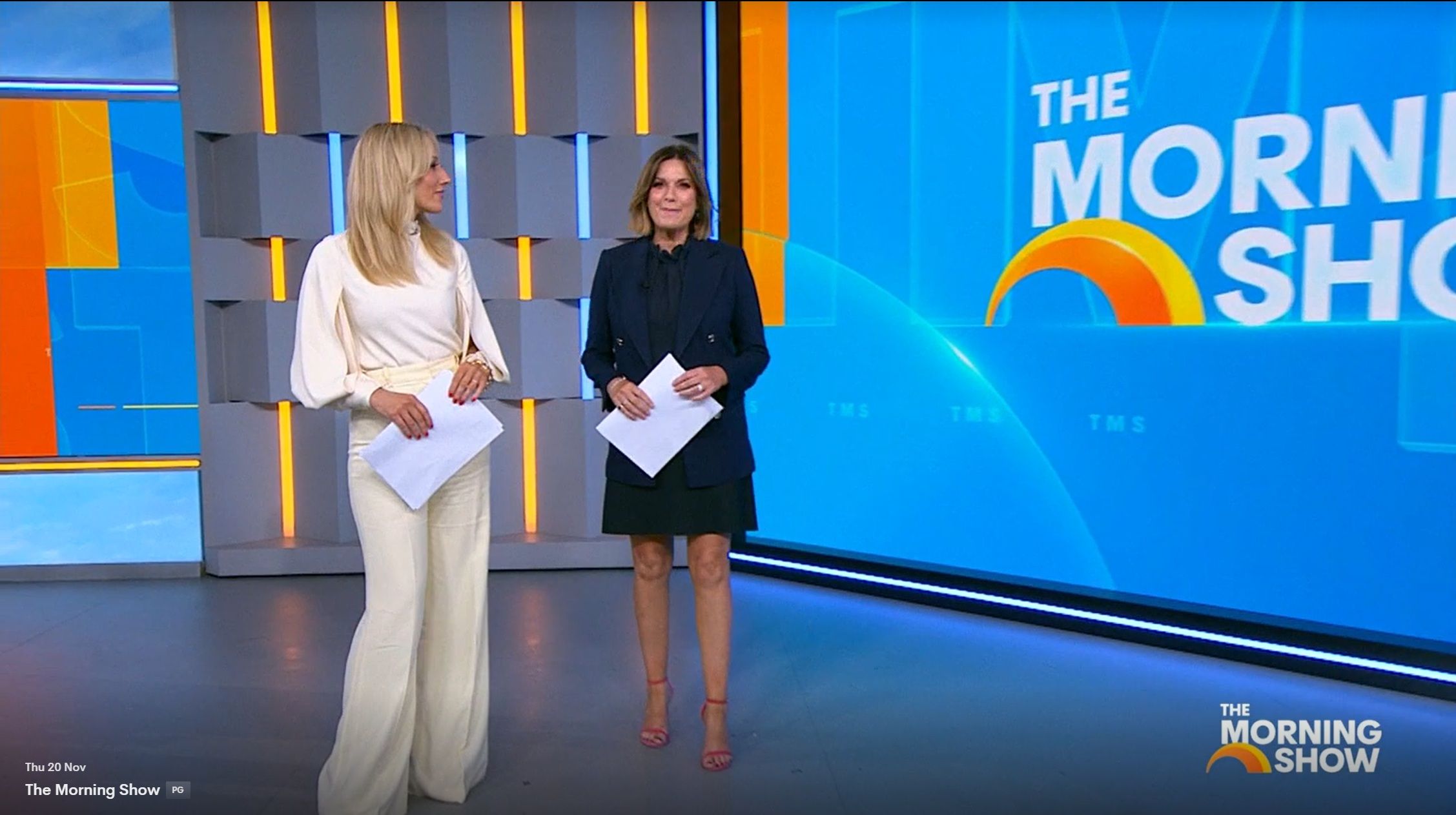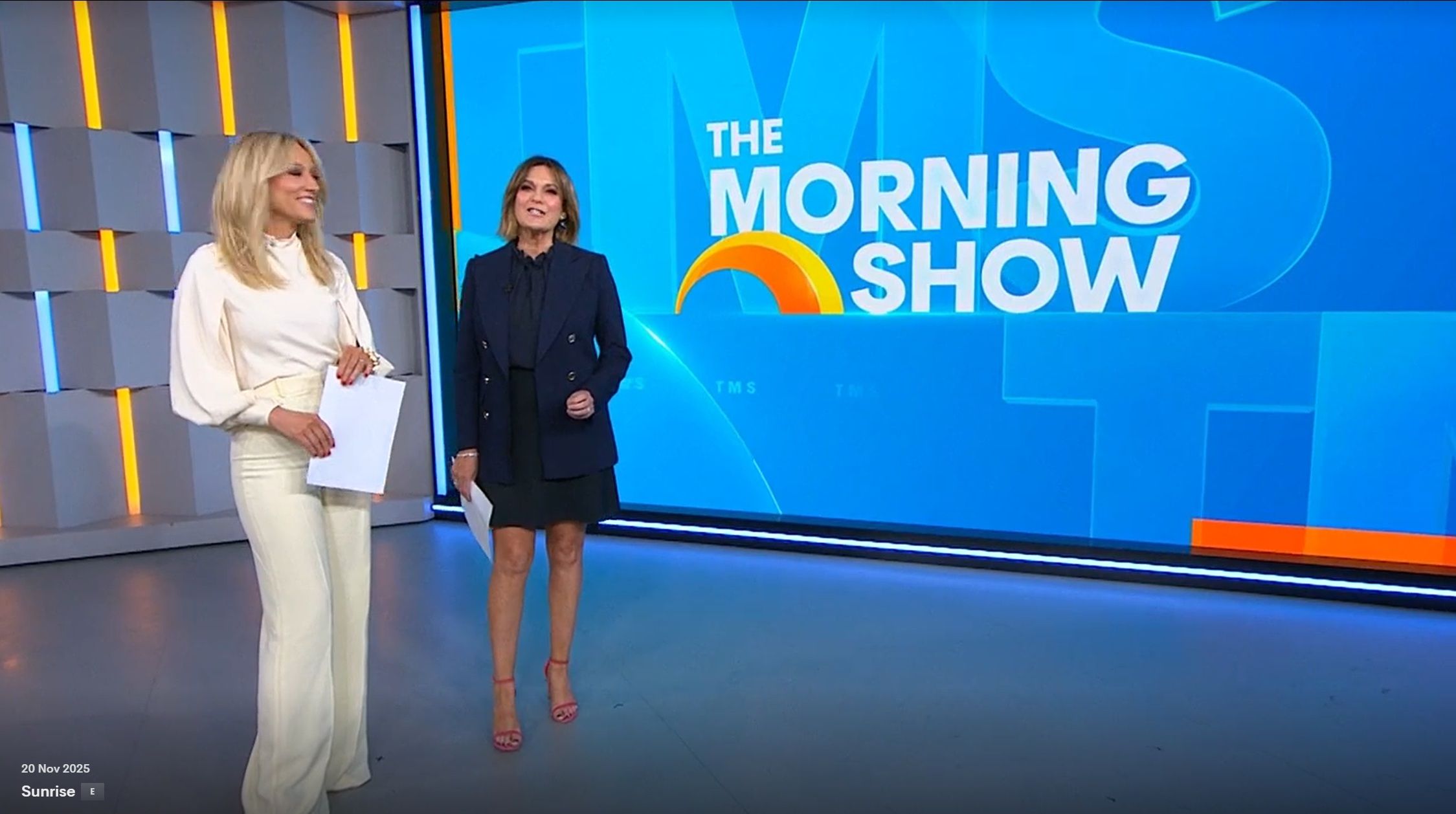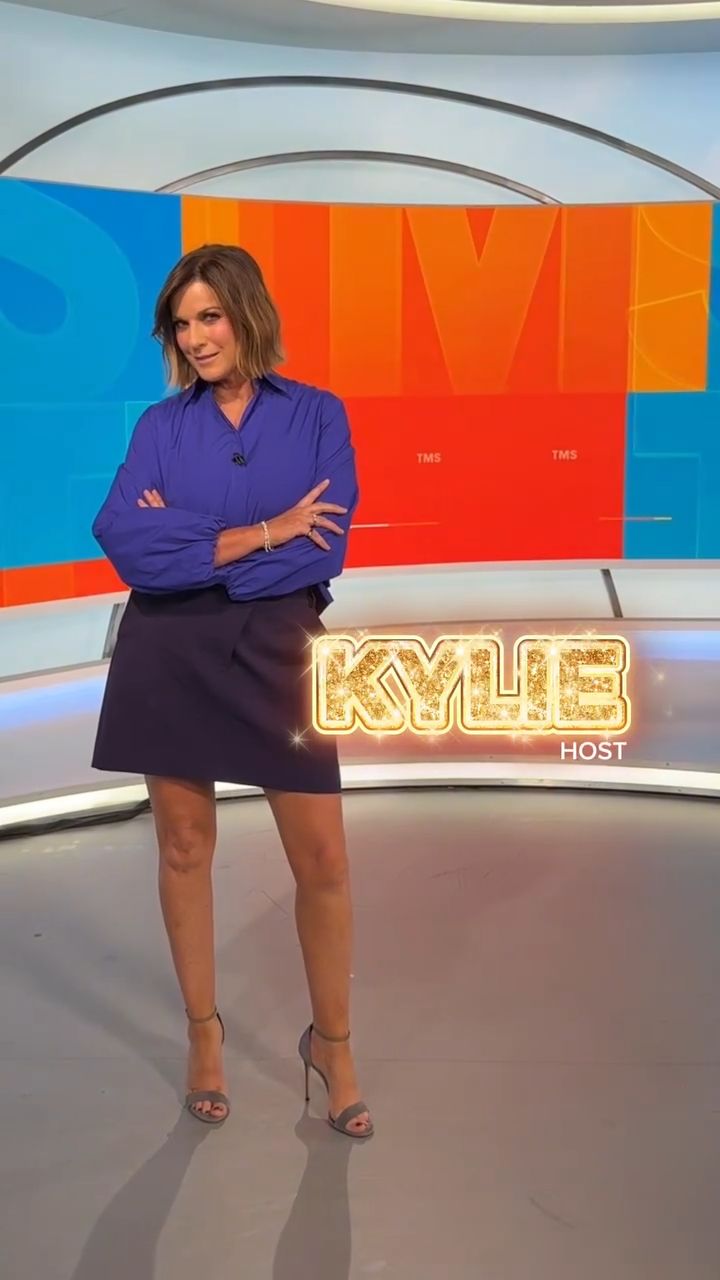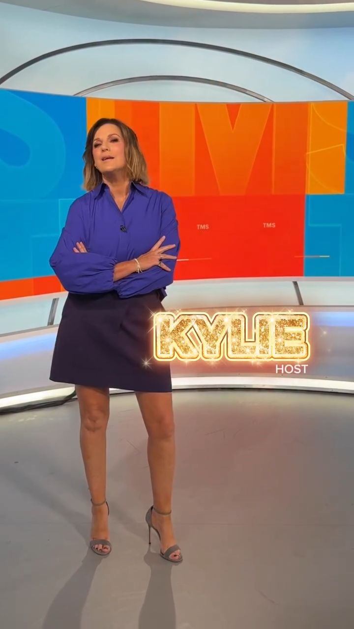 Looking great this morning in light blue. Skirt was short.
