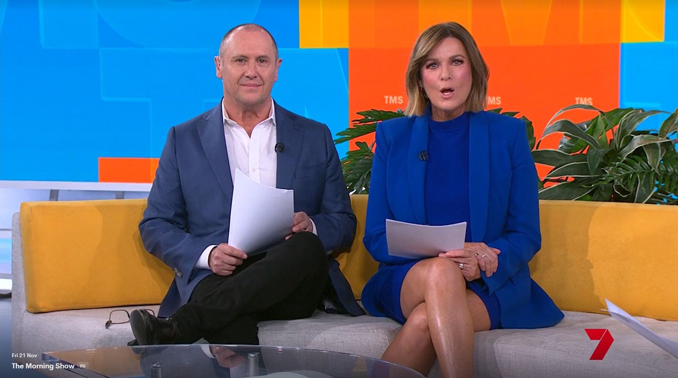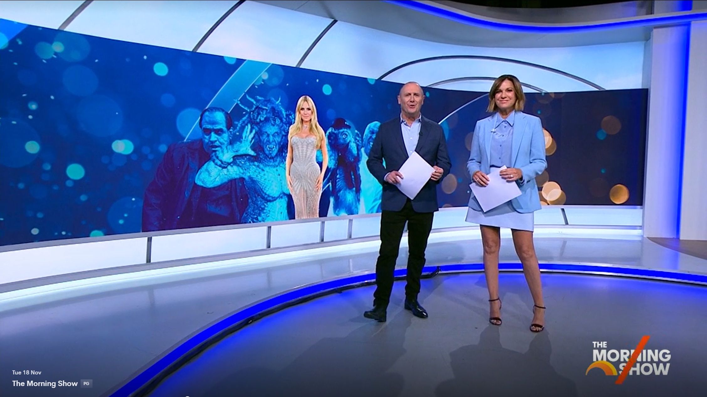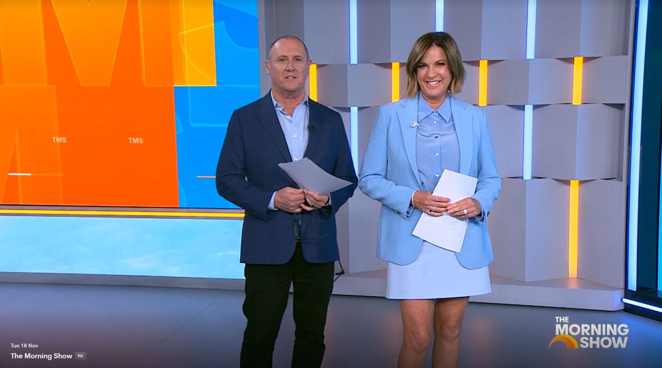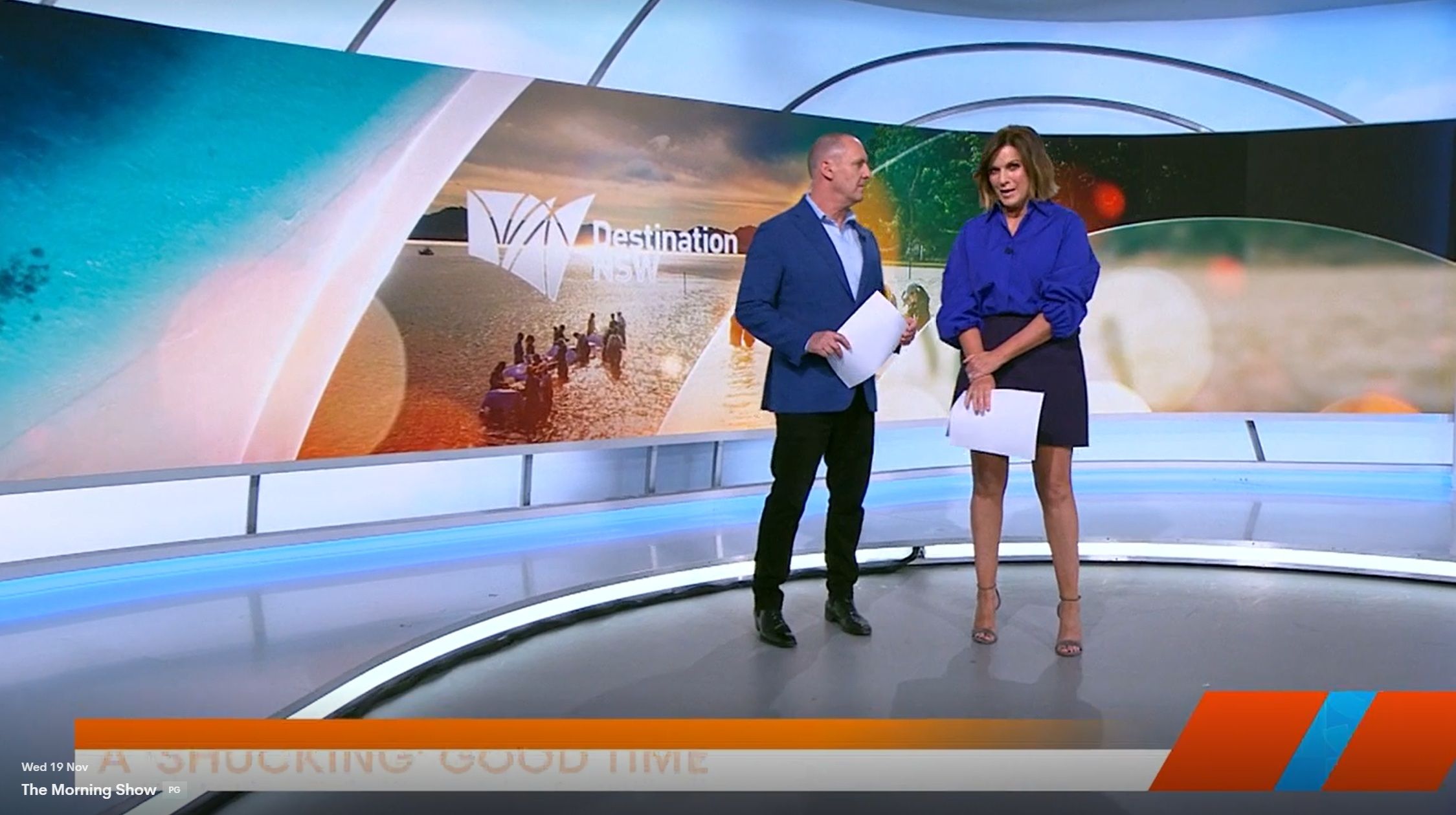 Looking great this morning in light blue. Skirt was short.