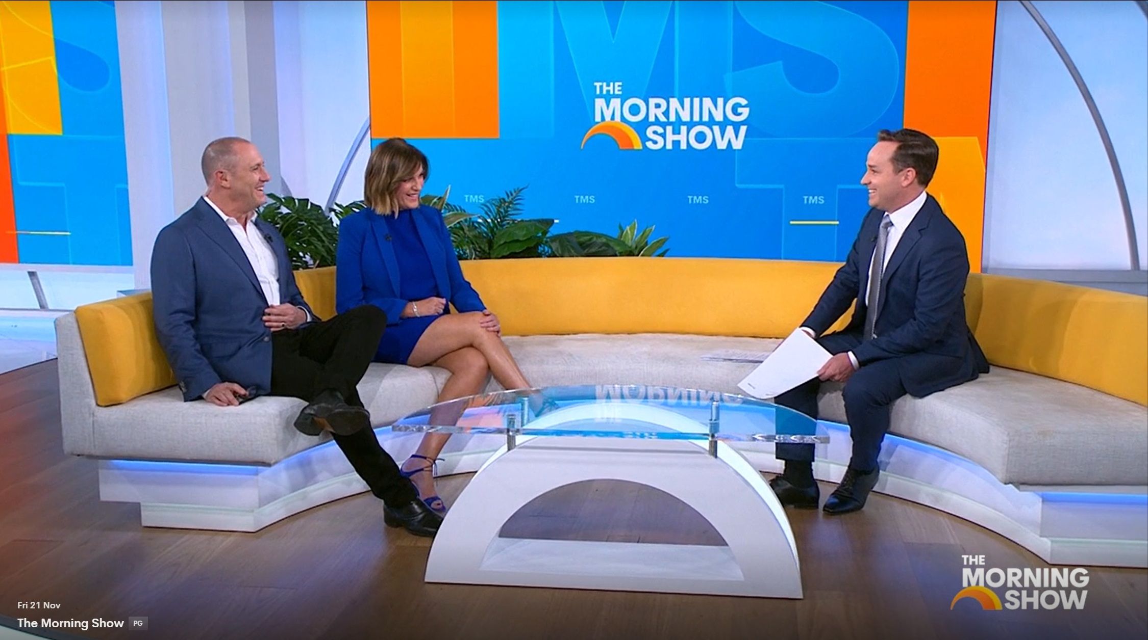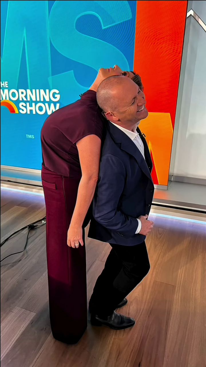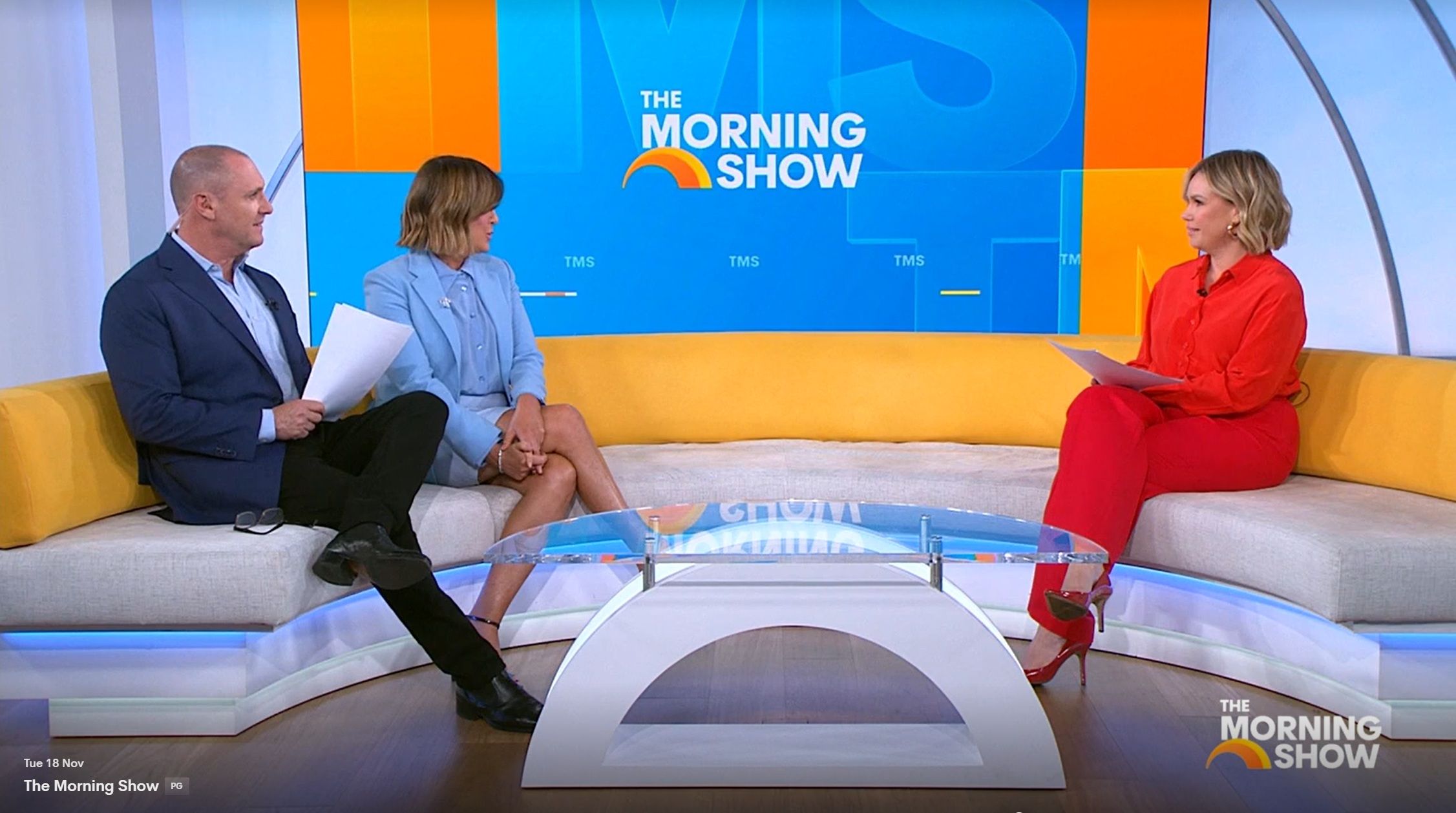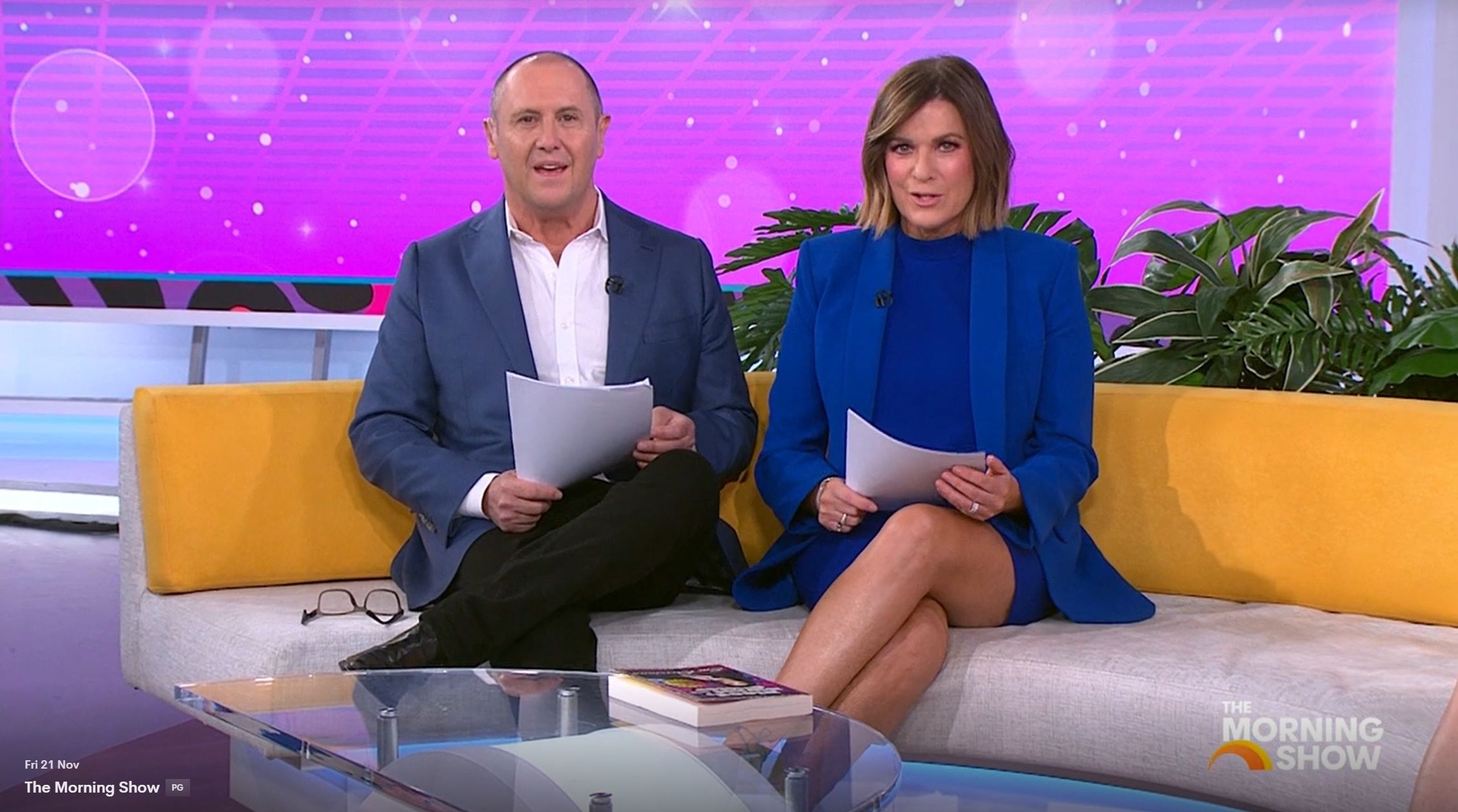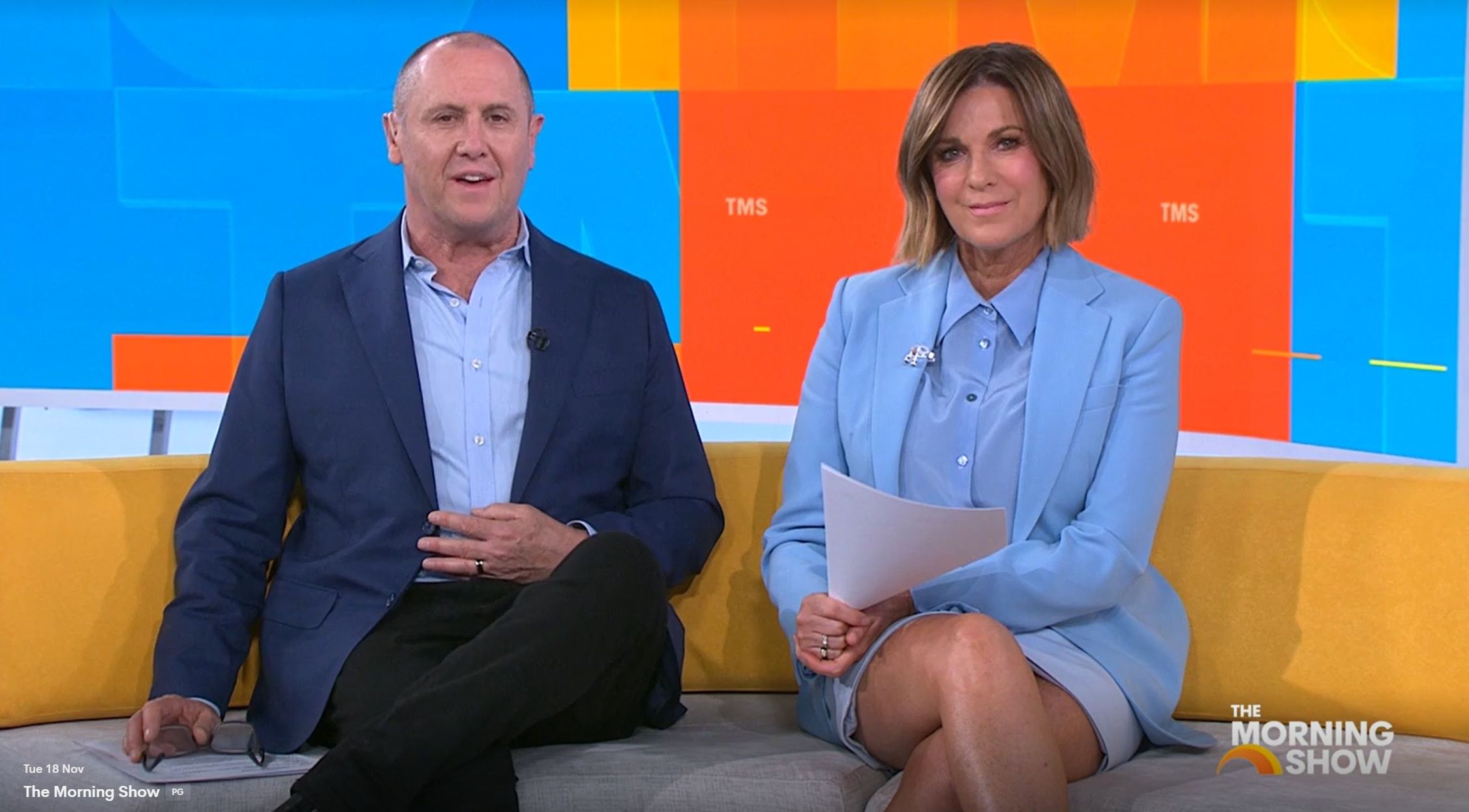 Looking great this morning in light blue. Skirt was short.