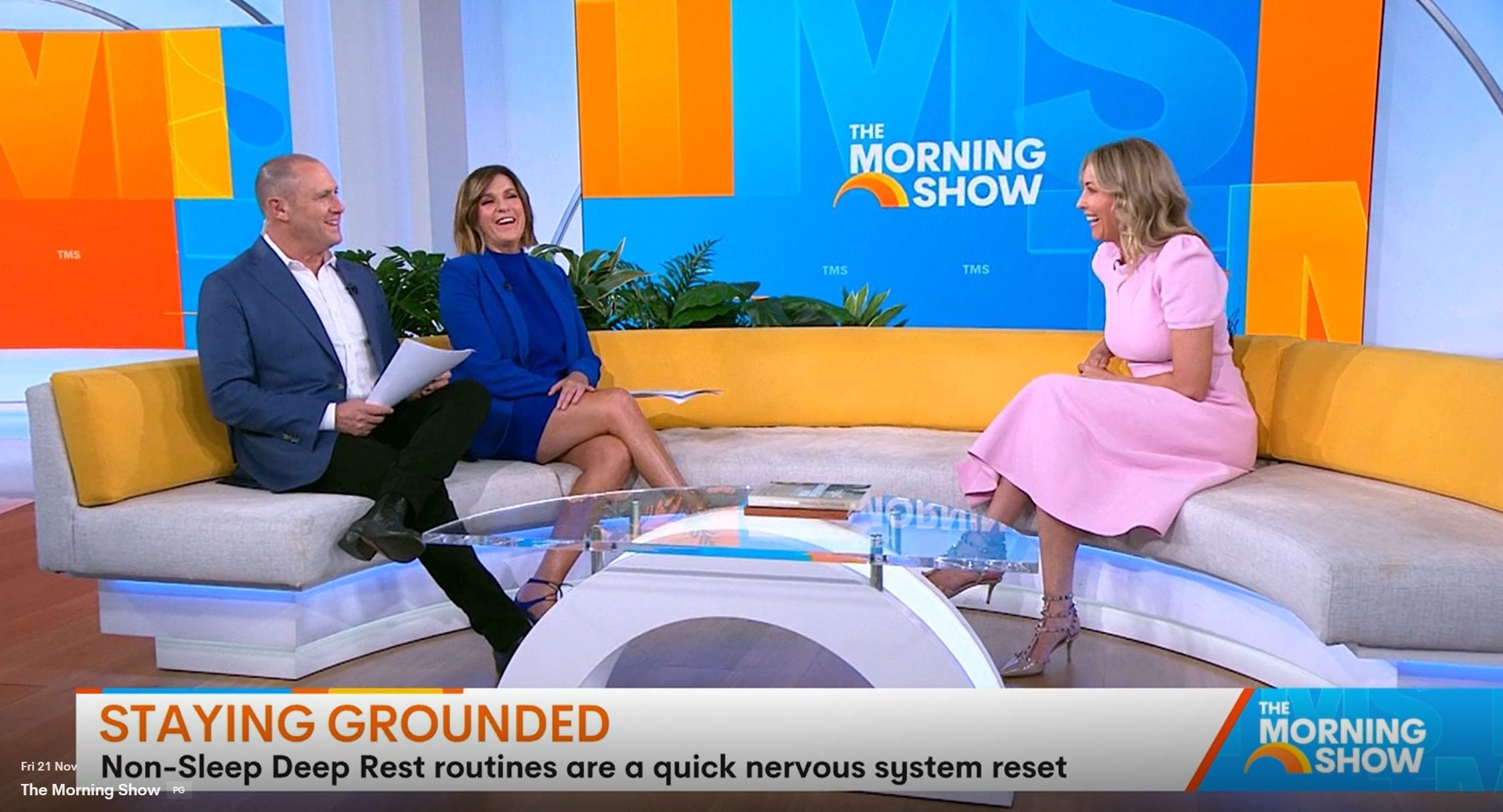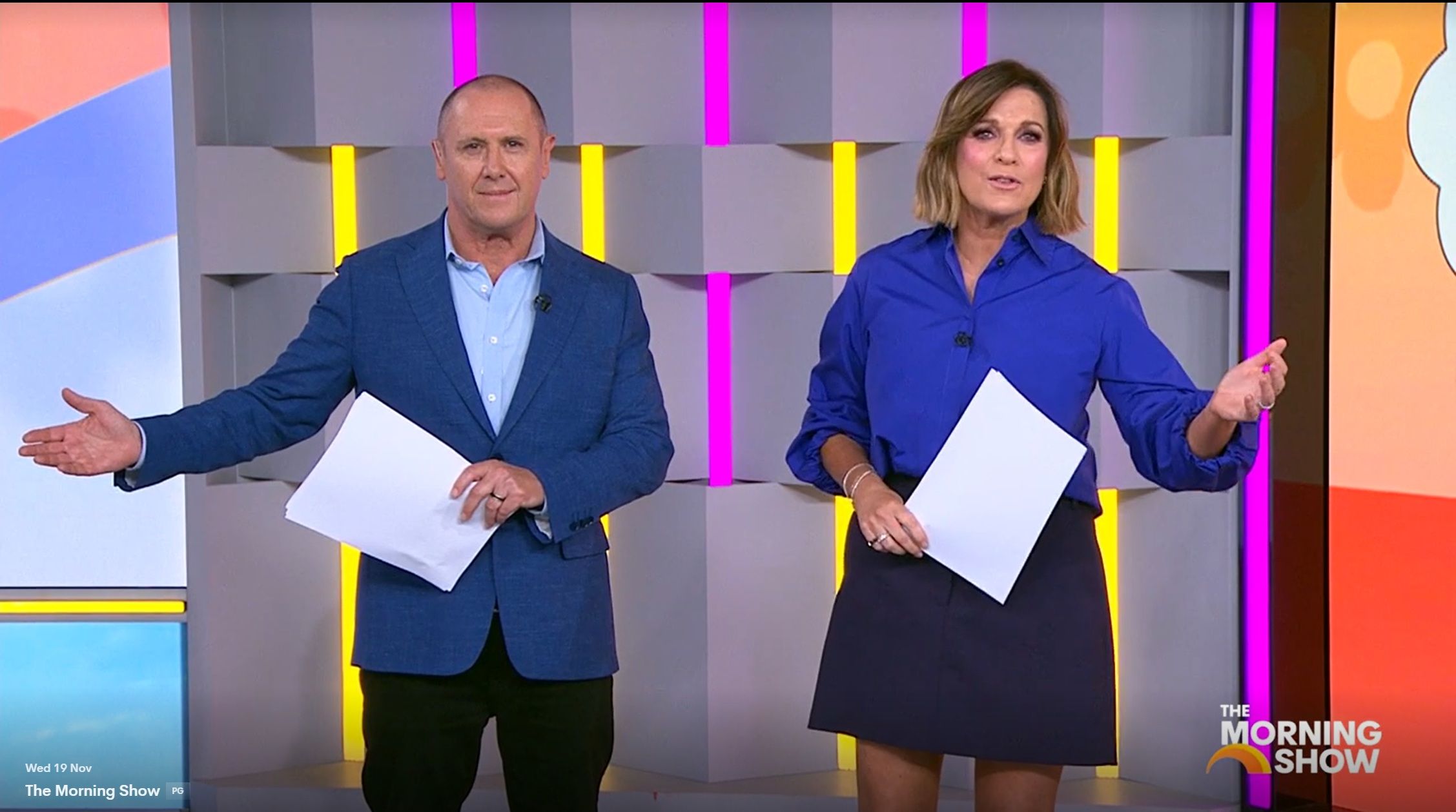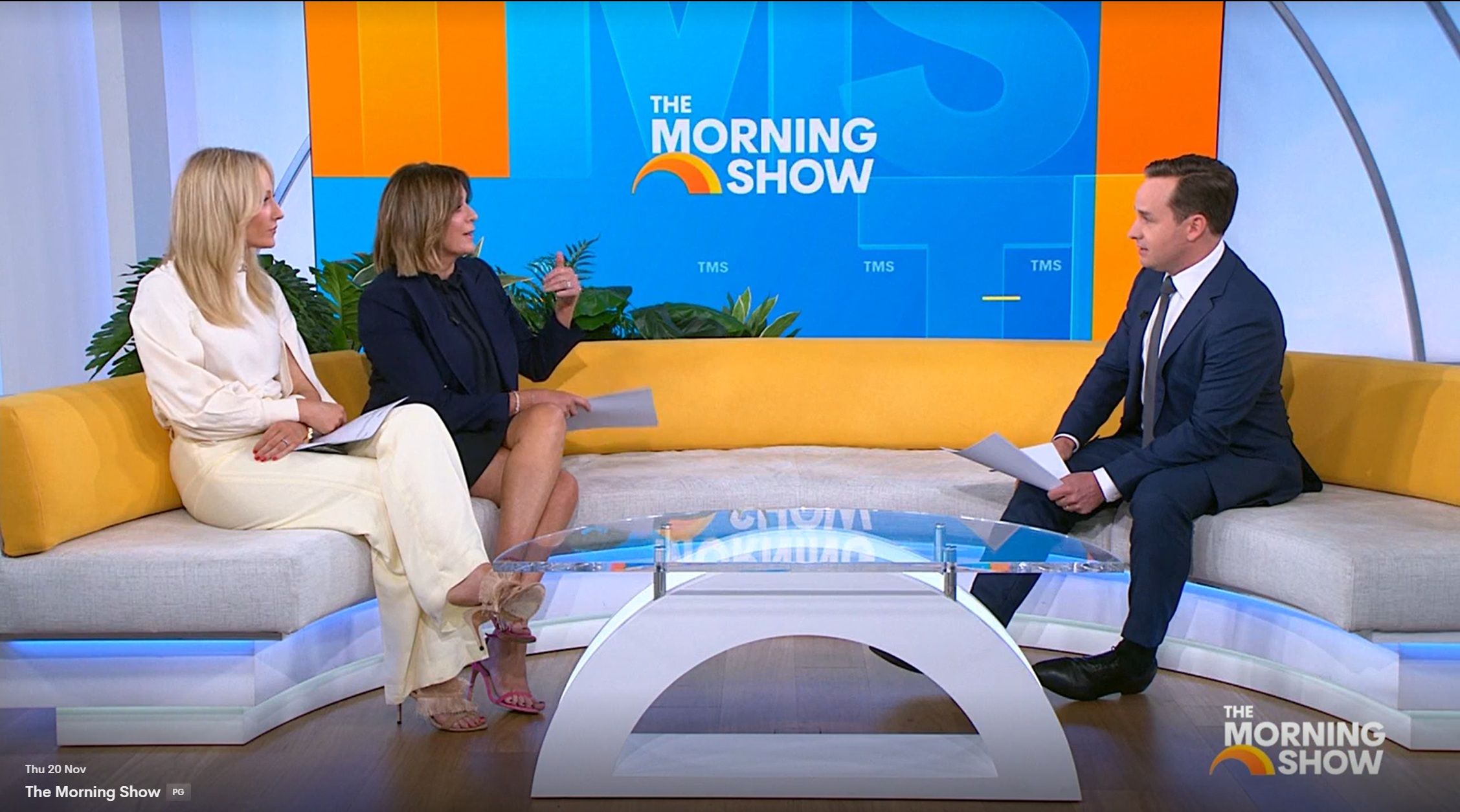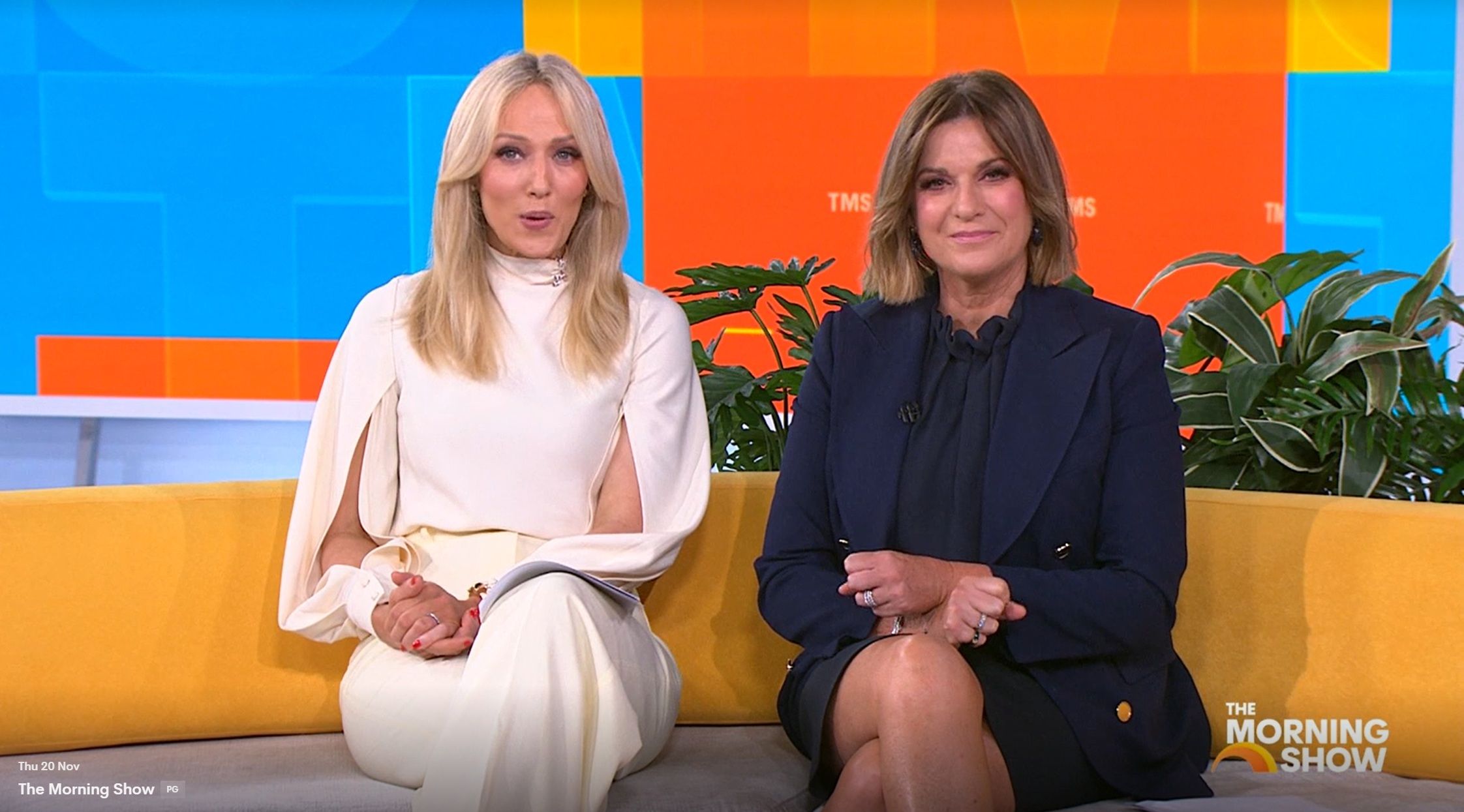 Looking great this morning in light blue. Skirt was short.