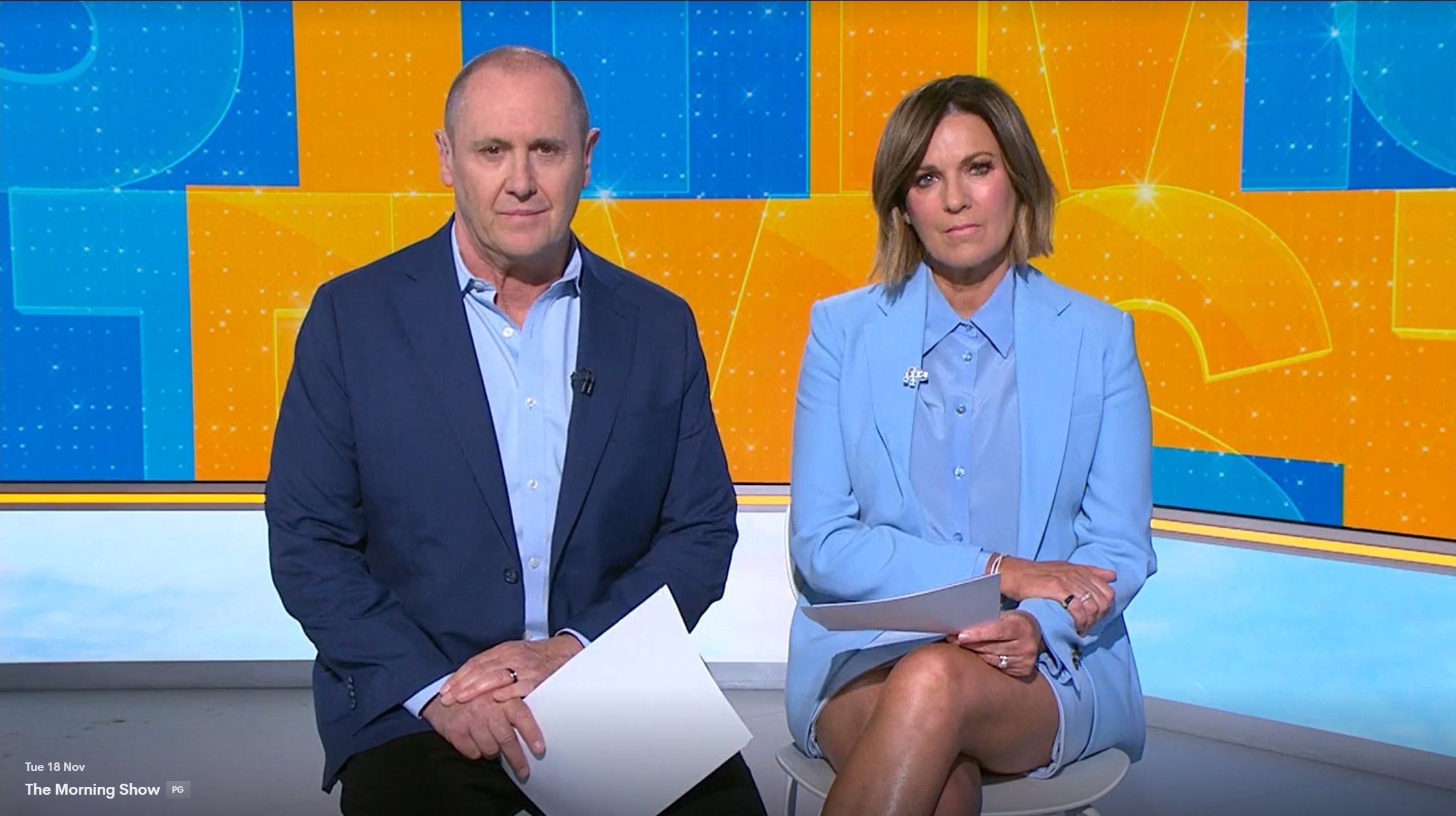 Looking great this morning in light blue. Skirt was short.