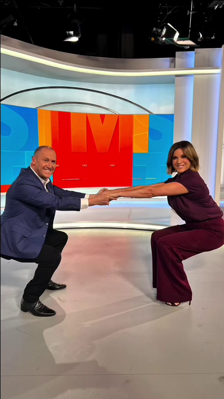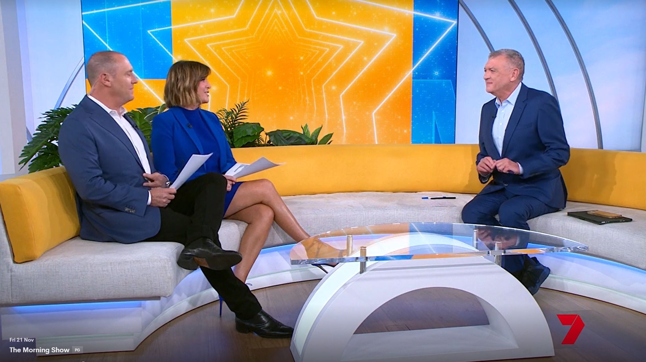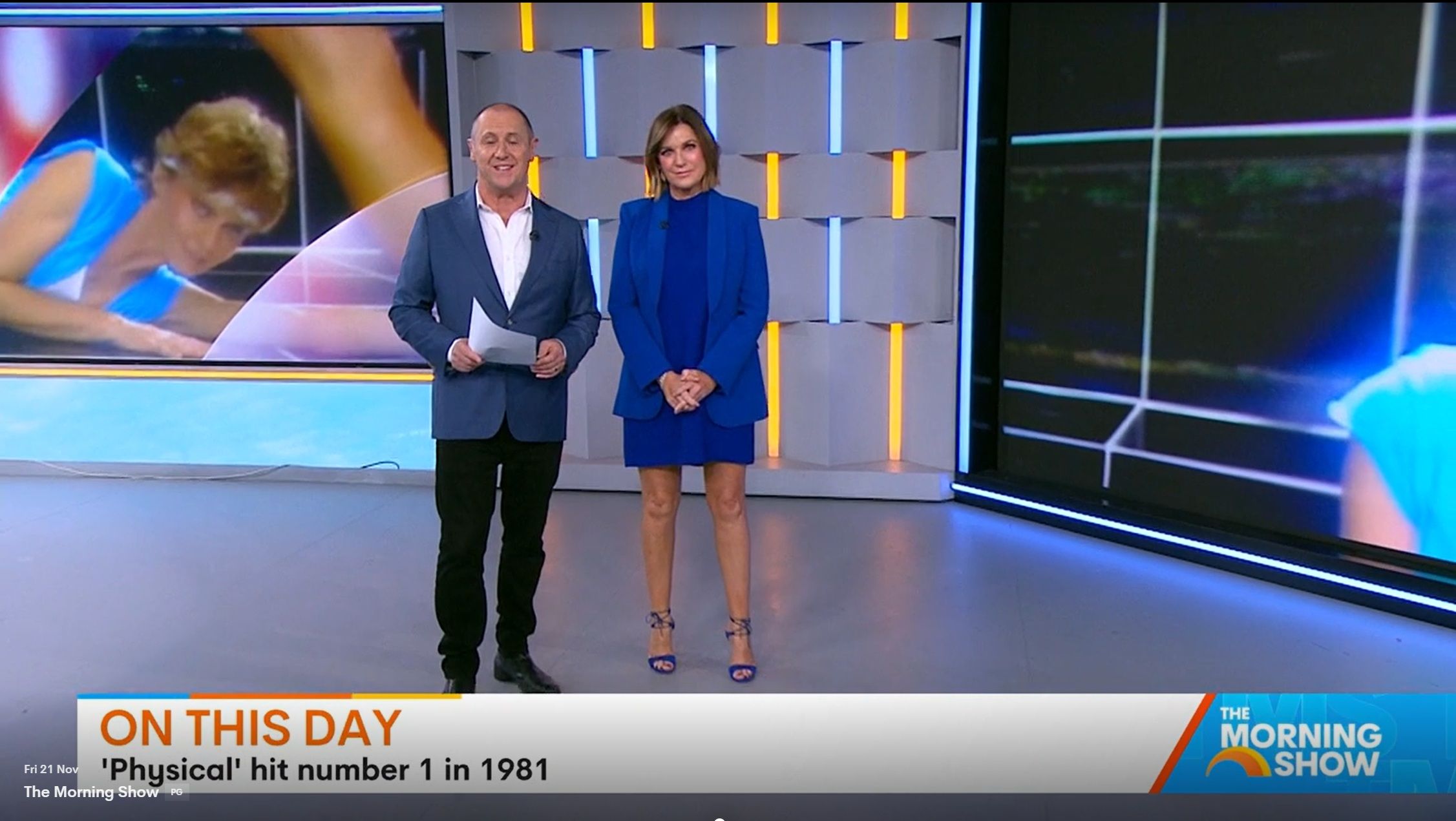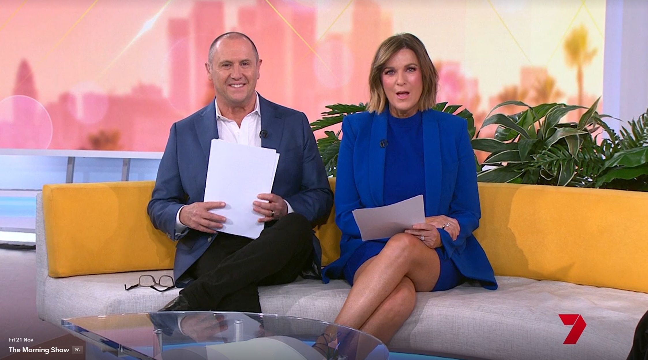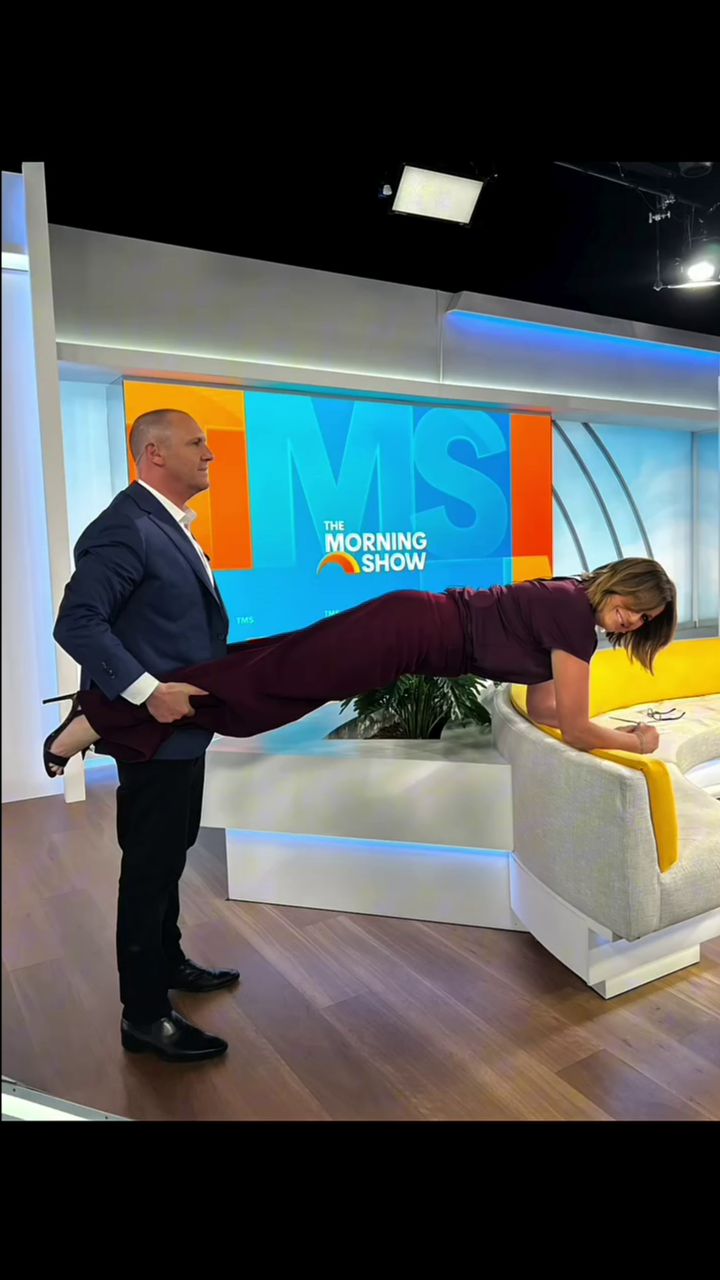 Looking great this morning in light blue. Skirt was short.