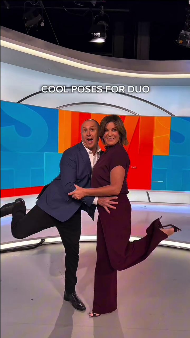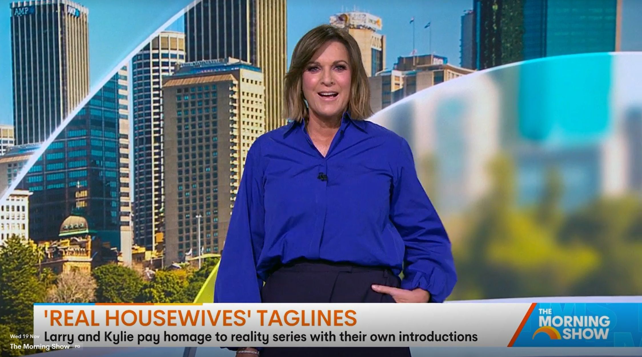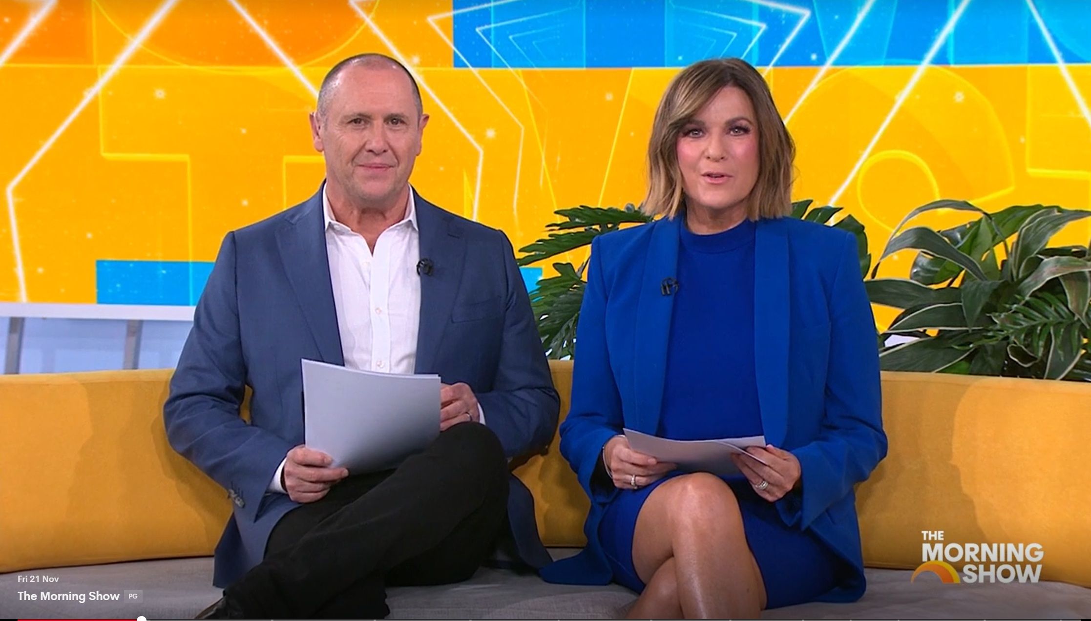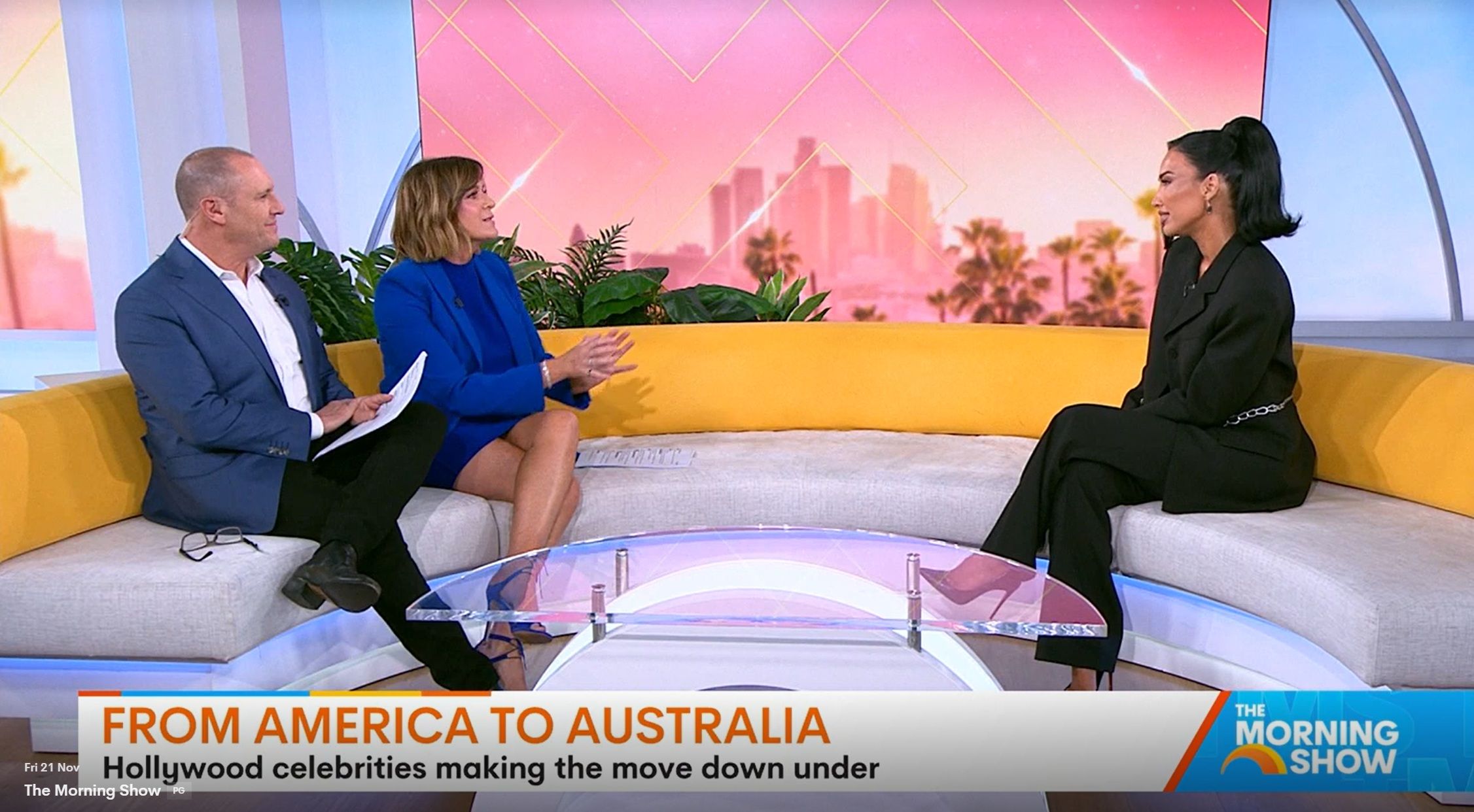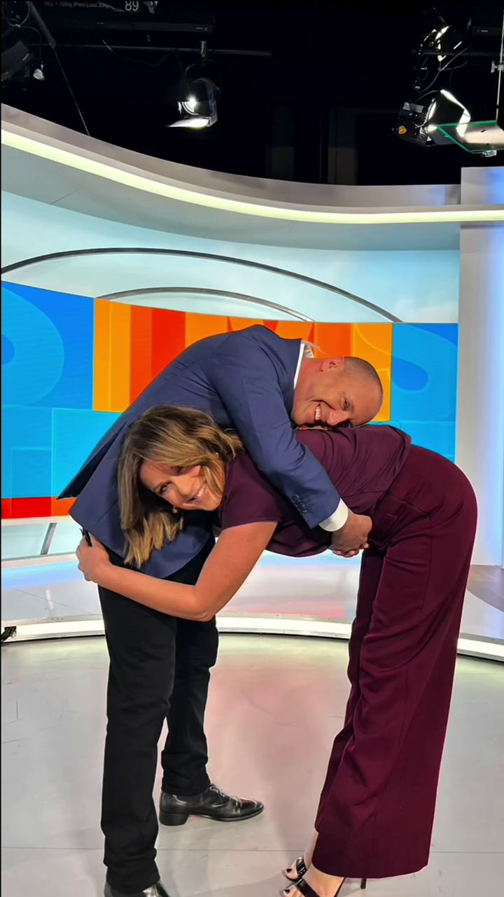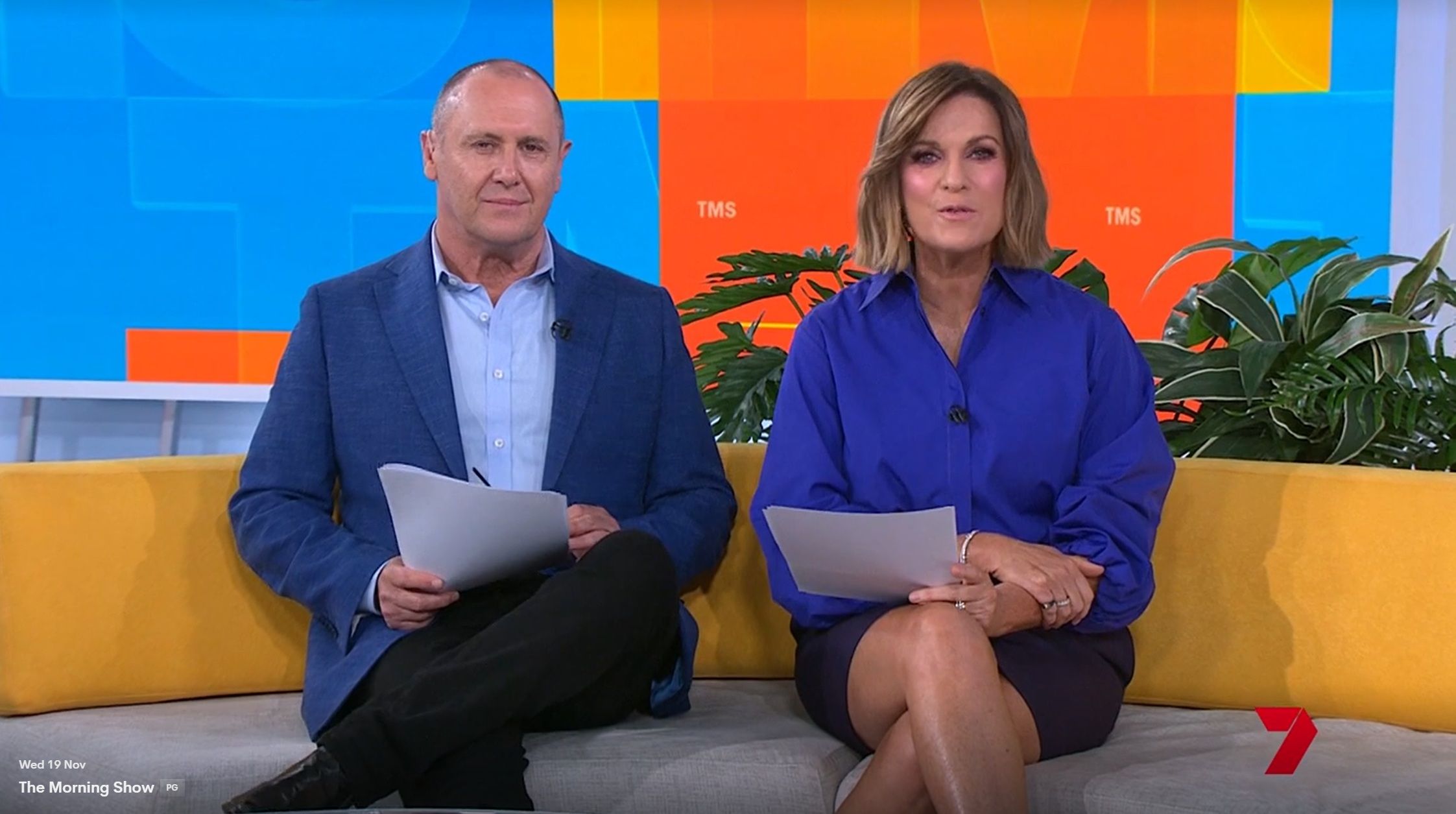 Looking great this morning in light blue. Skirt was short.